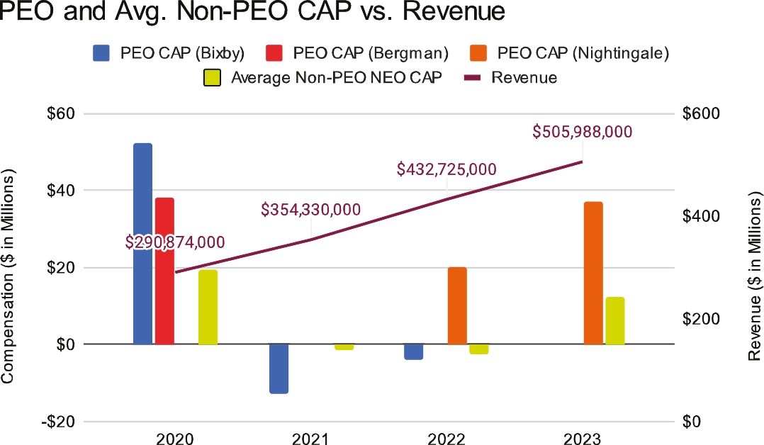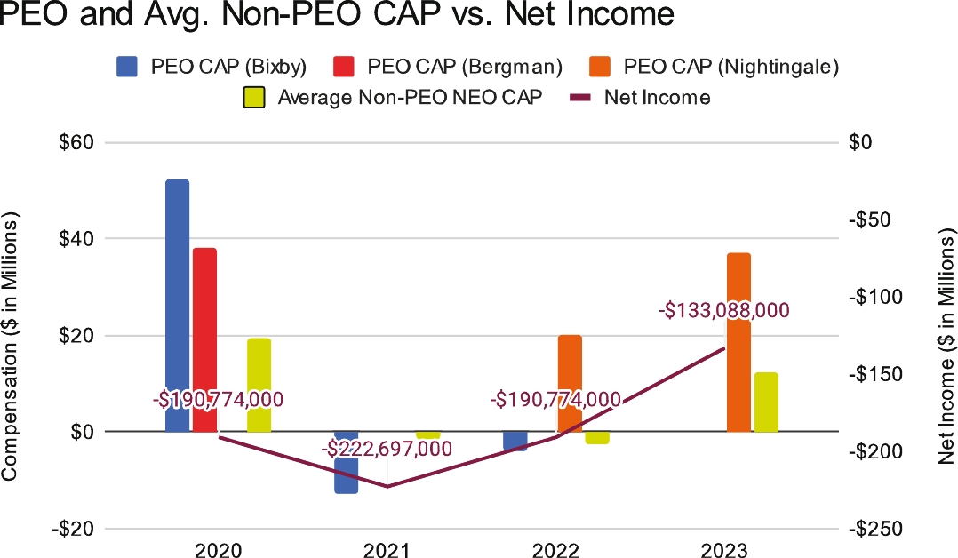 (2) | The dollar amounts reported in columns (c) represent the amount of CAP for Messrs. Bergman, Bixby, and Nightingale, respectively as computed in accordance with Item 402(v) of Regulation S-K. The dollar amounts do not reflect the actual amount of compensation earned by or paid during the applicable year. The Company deducted from and added to the Summary Compensation Table total compensation the following amounts to calculate compensation actually paid in accordance with Item 402(v) of Regulation S-K as disclosed in columns (c) and (e) for our PEO and Non-PEO NEOs in each respective year. As the Company’s NEOs do not participate in any defined benefit plans, no adjustments were required to amounts reported in the Summary Compensation Table totals related to the value of benefits under such plans. There are no material differences between the assumptions used to compute the valuation of the equity awards for calculating the compensation actually paid from the assumptions used to compute the valuation of such equity awards as of the grant date. |