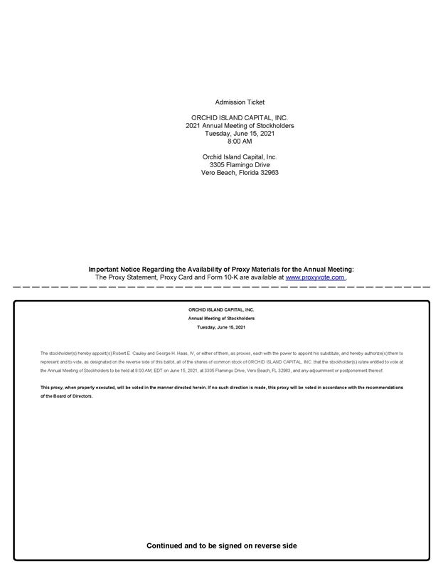 The 2021 Annual Meeting of Stockholders of Orchid Island Capital, Inc., a Maryland corporation, will be held at our principal executive office, located at 3305 Flamingo Drive, Vero
