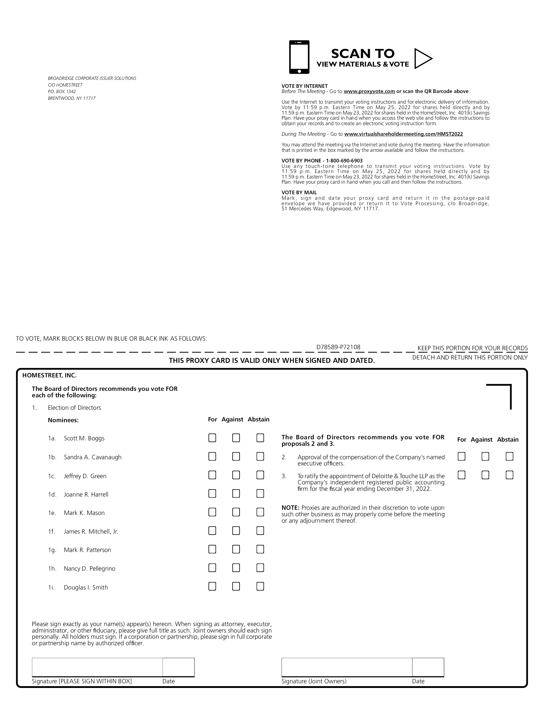 BROADRIDGE CORPORATE ISSUER SOLUTIONS C/O HOMESTREET P.O. BOX 1342 BRENTWOOD, NY 11717 SCAN TO VIEW MATERIALS & VOTE VOTE BY INTERNET Before The Meeting - Go to www.proxyvote.com or scan the QR Barcode above Use the Internet to transmit your voting instructions and for electronic delivery of information. Vote by 11:59 p.m. Eastern Time on May 25, 2022 for shares held directly and by 11:59 p.m. Eastern Time on May 23, 2022 for shares held in the HomeStreet, Inc. 401(k) Savings Plan. Have your proxy card in hand when you access the web site and follow the instructions to obtain your records and to create an electronic voting instruction form. During The Meeting - Go to www.virtualshareholdermeeting.com/HMST2022 You may attend the meeting via the Internet and vote during the meeting. Have the information that is printed in the box marked by the arrow available and follow the instructions. VOTE BY PHONE - 1-800-690-6903 Use any touch-tone telephone to transmit your voting instructions. Vote by 11:59 p.m. Eastern Time on May 25, 2022 for shares held directly and by 11:59 p.m. Eastern Time on May 23, 2022 for shares held in the HomeStreet, Inc. 401(k) Savings Plan. Have your proxy card in hand when you call and then follow the instructions. VOTE BY MAIL Mark, sign and date your proxy card and return it in the postage-paid envelope we have provided or return it to Vote Processing, c/o Broadridge, 51 Mercedes Way, Edgewood, NY 11717. TO VOTE, MARK BLOCKS BELOW IN BLUE OR BLACK INK AS FOLLOWS: D78589-P72108 KEEP THIS PORTION FOR YOUR RECORDS THIS PROXY CARD IS VALID ONLY WHEN SIGNED AND DATED. DETACH AND RETURN THIS PORTION ONLY HOMESTREET, INC. The Board of Directors recommends you vote FOR each of the following: Nominees: 1a. Scott M. Boggs 1b. Sandra A. Cavanaugh 1c. Jeffrey D. Green 1d. Joanne R. Harrell 1e. Mark K. Mason 1f. James R. Mitchell, Jr. 1g. Mark R. Patterson 1h. Nancy D. Pellegrino 1i. Douglas I. Smith For Against Abstain Please sign exactly as your name(s) appear(s) hereon. When signing as attorney, executor, administrator, or other fiduciary, please give full title as such. Joint owners should each sign personally. All holders must sign. If a corporation or partnership, please sign in full corporate or partnership name by authorized officer. Signature [PLEASE SIGN WITHIN BOX] Date Signature (Joint Owners) Date The Board of Directors recommends you vote FOR proposals 2 and 3. 2. Approval of the compensation of the Company’s named executive officers. 3. To ratify the appointment of Deloitte & Touche LLP as the Company’s independent registered public accounting firm for the fiscal year ending December 31, 2022. NOTE: Proxies are authorized in their discretion to vote upon such other business as may properly come before the meeting or any adjournment thereof.
