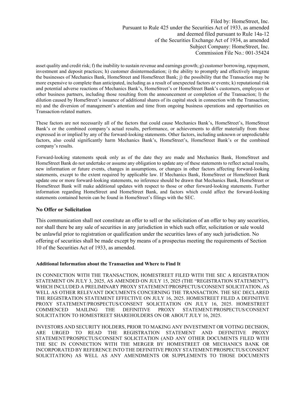 Filed by: HomeStreet, Inc. Pursuant to Rule 425 under the Securities Act of 1933, as amended and deemed filed pursuant to Rule 14a-12 of the Securities Exchange Act of 1934, as amended Subject Company: HomeStreet, Inc. Commission File No.: 001-35424 asset quality and credit risk; f) the inability to sustain revenue and earnings growth; g) customer borrowing, repayment, investment and deposit practices; h) customer disintermediation; i) the ability to promptly and effectively integrate the businesses of Mechanics Bank, HomeStreet and HomeStreet Bank; j) the possibility that the Transaction may be more expensive to complete than anticipated, including as a result of unexpected factors or events; k) reputational risk and potential adverse reactions of Mechanics Bank’s, HomeStreet’s or HomeStreet Bank’s customers, employees or other business partners, including those resulting from the announcement or completion of the Transaction; l) the dilution caused by HomeStreet’s issuance of additional shares of its capital stock in connection with the Transaction; m) and the diversion of management’s attention and time from ongoing business operations and opportunities on Transaction-related matters. These factors are not necessarily all of the factors that could cause Mechanics Bank’s, HomeStreet’s, HomeStreet Bank’s or the combined company’s actual results, performance, or achievements to differ materially from those expressed in or implied by any of the forward-looking statements. Other factors, including unknown or unpredictable factors, also could significantly harm Mechanics Bank’s, HomeStreet’s, HomeStreet Bank’s or the combined company’s results. Forward-looking statements speak only as of the date they are made and Mechanics Bank, HomeStreet and HomeStreet Bank do not undertake or assume any obligation to update any of these statements to reflect actual results, new information or future events, changes in assumptions, or changes in other factors affecting forward-looking statements, except to the extent required by applicable law. If Mechanics Bank, HomeStreet or HomeStreet Bank update one or more forward-looking statements, no inference should be drawn that Mechanics Bank, HomeStreet or HomeStreet Bank will make additional updates with respect to those or other forward-looking statements. Further information regarding HomeStreet and HomeStreet Bank, and factors which could affect the forward-looking statements contained herein can be found in HomeStreet’s filings with the SEC. No Offer or Solicitation This communication shall not constitute an offer to sell or the solicitation of an offer to buy any securities, nor shall there be any sale of securities in any jurisdiction in which such offer, solicitation or sale would be unlawful prior to registration or qualification under the securities laws of any such jurisdiction. No offering of securities shall be made except by means of a prospectus meeting the requirements of Section 10 of the Securities Act of 1933, as amended. Additional Information about the Transaction and Where to Find It IN CONNECTION WITH THE TRANSACTION, HOMESTREET FILED WITH THE SEC A REGISTRATION STATEMENT ON JULY 3, 2025, AS AMENDED ON JULY 15, 2025 (THE “REGISTRATION STATEMENT”), WHICH INCLUDED A PRELIMINARY PROXY STATEMENT/PROSPECTUS/CONSENT SOLICITATION, AS WELL AS OTHER RELEVANT DOCUMENTS CONCERNING THE TRANSACTION. THE SEC DECLARED THE REGISTRATION STATEMENT EFFECTIVE ON JULY 16, 2025. HOMESTREET FILED A DEFINITIVE PROXY STATEMENT/PROSPECTUS/CONSENT SOLICITATION ON JULY 16, 2025. HOMESTREET COMMENCED MAILING THE DEFINITIVE PROXY STATEMENT/PROSPECTUS/CONSENT SOLICITATION TO HOMESTREET SHAREHOLDERS ON OR ABOUT JULY 16, 2025. INVESTORS AND SECURITY HOLDERS, PRIOR TO MAKING ANY INVESTMENT OR VOTING DECISION, ARE URGED TO READ THE REGISTRATION STATEMENT AND DEFINITIVE PROXY STATEMENT/PROSPECTUS/CONSENT SOLICITATION (AND ANY OTHER DOCUMENTS FILED WITH THE SEC IN CONNECTION WITH THE MERGER BY HOMESTREET OR MECHANICS BANK OR INCORPORATED BY REFERENCE INTO THE DEFINITIVE PROXY STATEMENT/PROSPECTUS/CONSENT SOLICITATION) AS WELL AS ANY AMENDMENTS OR SUPPLEMENTS TO THOSE DOCUMENTS