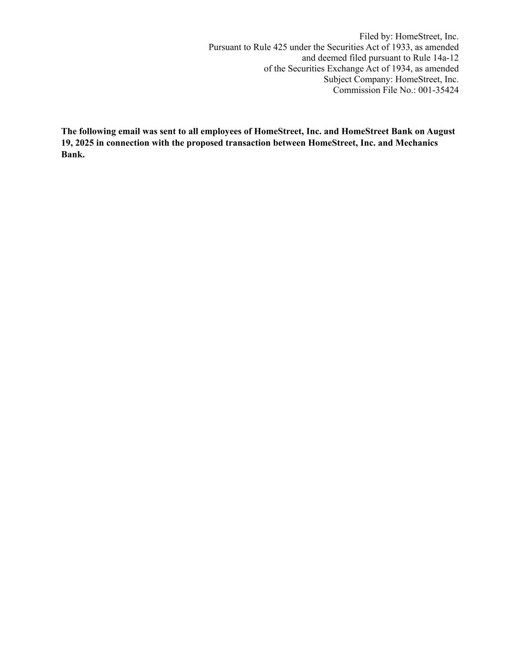 Filed by: HomeStreet, Inc. Pursuant to Rule 425 under the Securities Act of 1933, as amended and deemed filed pursuant to Rule 14a-12 of the Securities Exchange Act of 1934, as amended Subject Company: HomeStreet, Inc. Commission File No.: 001-35424 The following email was sent to all employees of HomeStreet, Inc. and HomeStreet Bank on August 19, 2025 in connection with the proposed transaction between HomeStreet, Inc. and Mechanics Bank.