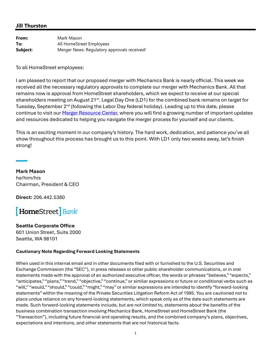 1 Jill Thurston From: Mark Mason To: All HomeStreet Employees Subject: Merger News: Regulatory approvals received! To all HomeStreet employees: I am pleased to report that our proposed merger with Mechanics Bank is nearly o icial. This week we received all the necessary regulatory approvals to complete our merger with Mechanics Bank. All that remains now is approval from HomeStreet shareholders, which we expect to receive at our special shareholders meeting on August 21st. Legal Day One (LD1) for the combined bank remains on target for Tuesday, September 2nd (following the Labor Day federal holiday). Leading up to this date, please continue to visit our Merger Resource Center, where you will find a growing number of important updates and resources dedicated to helping you navigate the merger process for yourself and our clients. This is an exciting moment in our company’s history. The hard work, dedication, and patience you’ve all show throughout this process has brought us to this point. With LD1 only two weeks away, let’s finish strong! Mark Mason he/him/his Chairman, President & CEO Direct: 206.442.5380 Seattle Corporate O ice 601 Union Street, Suite 2000 Seattle, WA 98101 Cautionary Note Regarding Forward Looking Statements When used in this internal email and in other documents filed with or furnished to the U.S. Securities and Exchange Commission (the “SEC”), in press releases or other public shareholder communications, or in oral statements made with the approval of an authorized executive o icer, the words or phrases “believes,” “expects,” “anticipates,” “plans,” “trend,” “objective,” “continue,” or similar expressions or future or conditional verbs such as “will,” “would,” “should,” “could,” “might,” “may” or similar expressions are intended to identify “forward-looking statements” within the meaning of the Private Securities Litigation Reform Act of 1995. You are cautioned not to place undue reliance on any forward-looking statements, which speak only as of the date such statements are made. Such forward-looking statements include, but are not limited to, statements about the benefits of the business combination transaction involving Mechanics Bank, HomeStreet and HomeStreet Bank (the “Transaction”), including future financial and operating results, and the combined company’s plans, objectives, expectations and intentions, and other statements that are not historical facts.