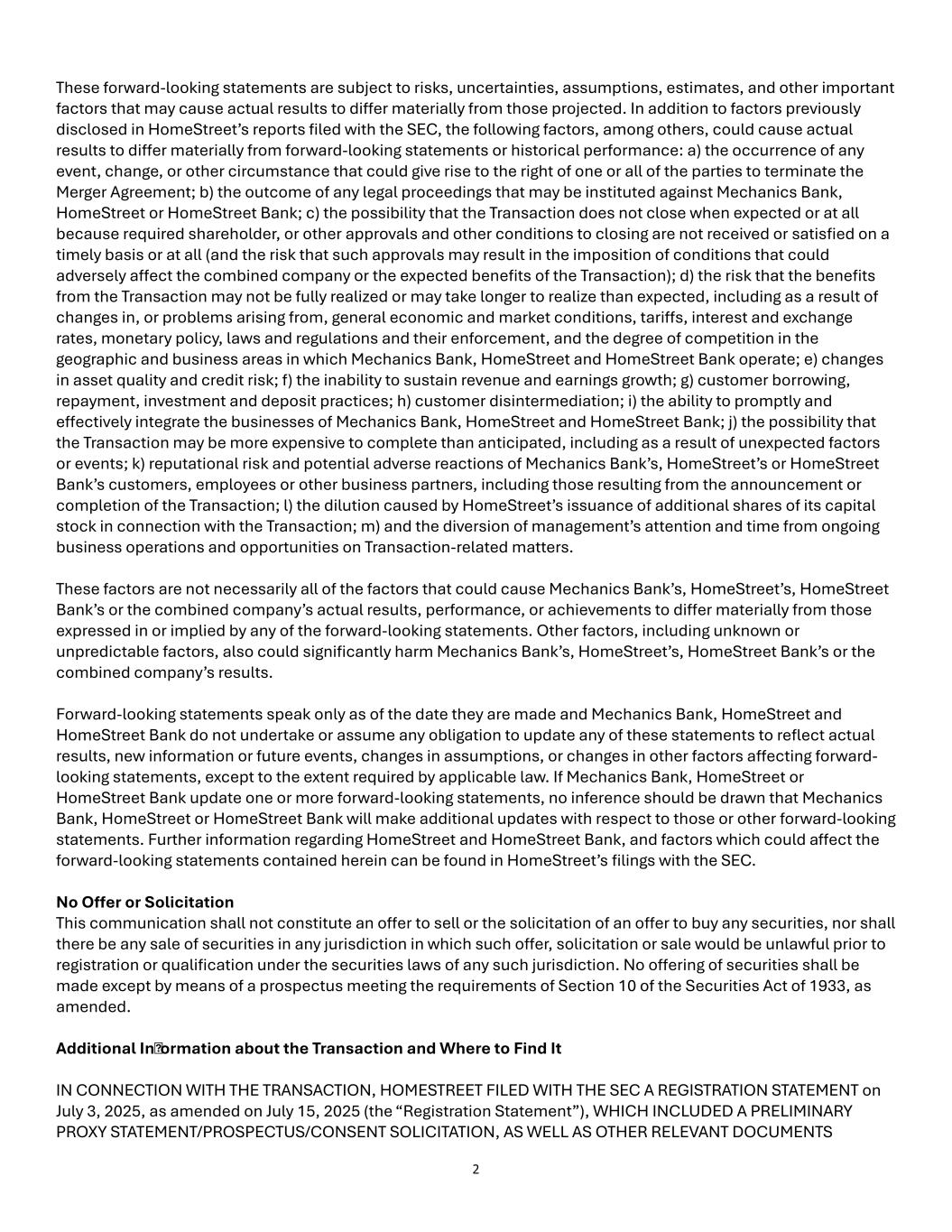 No Offer or Solicitation This communication shall not constitute an offer to sell or the solicitation of an offer to buy any securities, nor shall there be any sale of securities in any jurisdiction in which such offer, solicitation or sale would be unlawful prior to registration or qualification under the securities laws of any such jurisdiction. No offering of securities shall be made except by means of a prospectus meeting the requirements of Section 10 of the Securities Act of 1933, as amended. Additional Information about the Transaction and Where to Find It IN CONNECTION WITH THE TRANSACTION, HOMESTREET FILED WITH THE SEC A REGISTRATION STATEMENT ON JULY 3, 2025, AS AMENDED ON JULY 15, 2025 (THE “REGISTRATION STATEMENT”), WHICH INCLUDED A PRELIMINARY PROXY STATEMENT/PROSPECTUS/CONSENT SOLICITATION, AS WELL AS OTHER RELEVANT DOCUMENTS CONCERNING THE TRANSACTION. THE SEC DECLARED THE REGISTRATION STATEMENT EFFECTIVE ON JULY 16, 2025. HOMESTREET FILED A DEFINITIVE PROXY STATEMENT/PROSPECTUS/CONSENT SOLICITATION ON JULY 16, 2025. HOMESTREET COMMENCED MAILING THE DEFINITIVE PROXY STATEMENT/PROSPECTUS/CONSENT SOLICITATION TO HOMESTREET SHAREHOLDERS ON OR ABOUT JULY 16, 2025. INVESTORS AND SECURITY HOLDERS, PRIOR TO MAKING ANY INVESTMENT OR VOTING DECISION, ARE URGED TO READ THE REGISTRATION STATEMENT AND DEFINITIVE PROXY STATEMENT/PROSPECTUS/CONSENT SOLICITATION (AND ANY OTHER DOCUMENTS FILED WITH THE SEC IN CONNECTION WITH THE MERGER BY HOMESTREET OR MECHANICS BANK OR INCORPORATED BY REFERENCE INTO THE DEFINITIVE PROXY STATEMENT/PROSPECTUS/CONSENT SOLICITATION) AS WELL AS ANY AMENDMENTS OR SUPPLEMENTS TO THOSE DOCUMENTS BECAUSE SUCH DOCUMENTS CONTAIN OR WILL CONTAIN IMPORTANT INFORMATION REGARDING THE MERGER. Investors and security holders may obtain free copies of these documents and other documents filed with the SEC by HomeStreet through the website maintained by the SEC at http://www.sec.gov or from HomeStreet at its website, https://ir.homestreet.com/sec-filings/all-filings/default.aspx. Documents filed with the SEC by HomeStreet are available free of charge by accessing the “Investor Relations” page of HomeStreet’s website at https://ir.homestreet.com/sec-filings/all-filings/default.aspx. Participants in the Solicitation Mechanics Bank, HomeStreet and certain of HomeStreet’s directors and executive officers may be deemed to be participants in the solicitation of proxies from HomeStreet’s shareholders in connection with the Transaction. Information about the interests of the persons who may be deemed to be participants in the solicitation of shareholders of HomeStreet in connection with the Transaction and a description of their direct and indirect interests, by security holdings or otherwise, are included in the Proxy Statement/Prospectus/Consent Solicitation and the Registration Statement. Information about the directors and executive officers of HomeStreet, their ownership of HomeStreet common stock, and HomeStreet’s transactions with related persons is set forth in the Proxy Statement/Prospectus/Consent Solicitation Statement, the Registration Statement and the sections entitled “Corporate Governance” “2024 Executive Compensation Program,” “2024 Summary Compensation Table,” “Certain Relationships and Related Transactions” and “Principal Shareholders” in the definitive proxy statement filed in connection with HomeStreet’s meeting of shareholders, which was held on May 29, 2025, as filed with the SEC on Schedule 14A on April 15, 2025 (and which is available at https://www.sec.gov/ix?doc=/Archives/edgar/data/0001518715/000151871525000066/hmst-20250415.htm). To the extent holdings of HomeStreet common stock by the directors and executive officers of HomeStreet have changed from the amounts held by such persons as reflected therein, such changes have been or will be reflected on Statements of Change in Ownership on Form 4 filed with the SEC. Free copies of these documents may be obtained as described above.