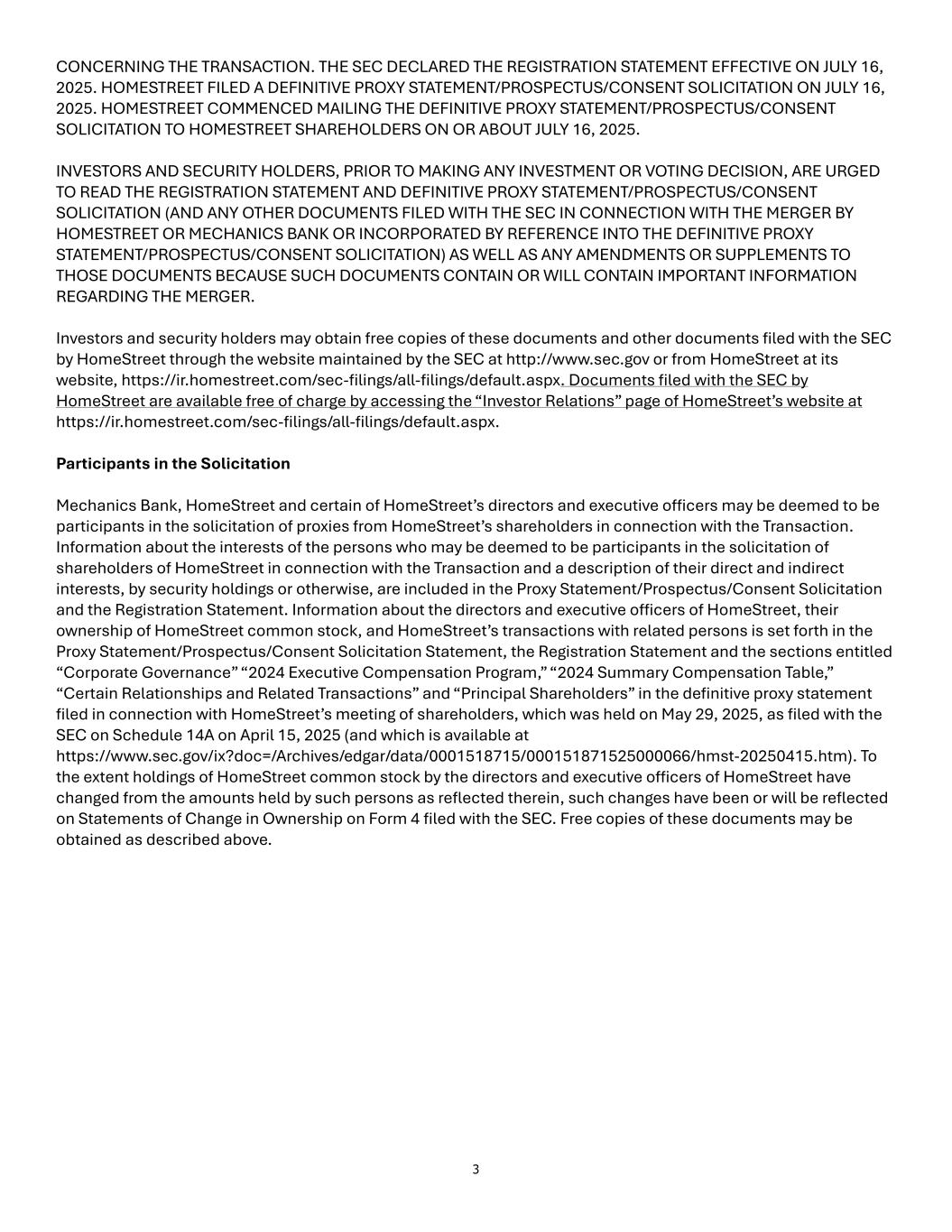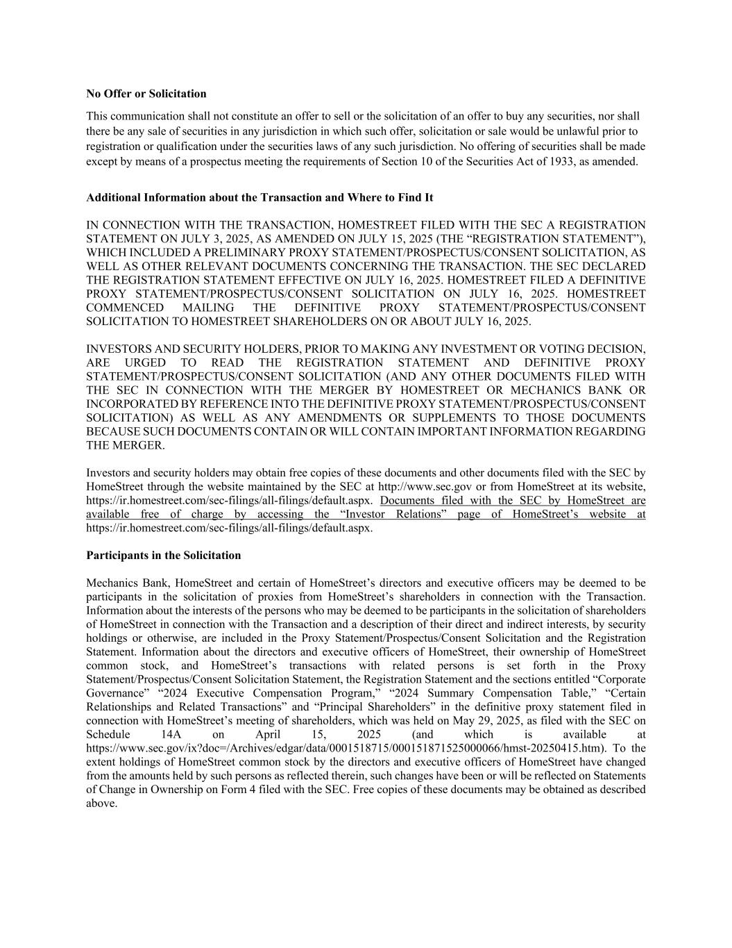 3 CONCERNING THE TRANSACTION. THE SEC DECLARED THE REGISTRATION STATEMENT EFFECTIVE ON JULY 16, 2025. HOMESTREET FILED A DEFINITIVE PROXY STATEMENT/PROSPECTUS/CONSENT SOLICITATION ON JULY 16, 2025. HOMESTREET COMMENCED MAILING THE DEFINITIVE PROXY STATEMENT/PROSPECTUS/CONSENT SOLICITATION TO HOMESTREET SHAREHOLDERS ON OR ABOUT JULY 16, 2025. INVESTORS AND SECURITY HOLDERS, PRIOR TO MAKING ANY INVESTMENT OR VOTING DECISION, ARE URGED TO READ THE REGISTRATION STATEMENT AND DEFINITIVE PROXY STATEMENT/PROSPECTUS/CONSENT SOLICITATION (AND ANY OTHER DOCUMENTS FILED WITH THE SEC IN CONNECTION WITH THE MERGER BY HOMESTREET OR MECHANICS BANK OR INCORPORATED BY REFERENCE INTO THE DEFINITIVE PROXY STATEMENT/PROSPECTUS/CONSENT SOLICITATION) AS WELL AS ANY AMENDMENTS OR SUPPLEMENTS TO THOSE DOCUMENTS BECAUSE SUCH DOCUMENTS CONTAIN OR WILL CONTAIN IMPORTANT INFORMATION REGARDING THE MERGER. Investors and security holders may obtain free copies of these documents and other documents filed with the SEC by HomeStreet through the website maintained by the SEC at http://www.sec.gov or from HomeStreet at its website, https://ir.homestreet.com/sec-filings/all-filings/default.aspx. Documents filed with the SEC by HomeStreet are available free of charge by accessing the “Investor Relations” page of HomeStreet’s website at https://ir.homestreet.com/sec-filings/all-filings/default.aspx. Participants in the Solicitation Mechanics Bank, HomeStreet and certain of HomeStreet’s directors and executive o icers may be deemed to be participants in the solicitation of proxies from HomeStreet’s shareholders in connection with the Transaction. Information about the interests of the persons who may be deemed to be participants in the solicitation of shareholders of HomeStreet in connection with the Transaction and a description of their direct and indirect interests, by security holdings or otherwise, are included in the Proxy Statement/Prospectus/Consent Solicitation and the Registration Statement. Information about the directors and executive o icers of HomeStreet, their ownership of HomeStreet common stock, and HomeStreet’s transactions with related persons is set forth in the Proxy Statement/Prospectus/Consent Solicitation Statement, the Registration Statement and the sections entitled “Corporate Governance” “2024 Executive Compensation Program,” “2024 Summary Compensation Table,” “Certain Relationships and Related Transactions” and “Principal Shareholders” in the definitive proxy statement filed in connection with HomeStreet’s meeting of shareholders, which was held on May 29, 2025, as filed with the SEC on Schedule 14A on April 15, 2025 (and which is available at https://www.sec.gov/ix?doc=/Archives/edgar/data/0001518715/000151871525000066/hmst-20250415.htm). To the extent holdings of HomeStreet common stock by the directors and executive o icers of HomeStreet have changed from the amounts held by such persons as reflected therein, such changes have been or will be reflected on Statements of Change in Ownership on Form 4 filed with the SEC. Free copies of these documents may be obtained as described above.
