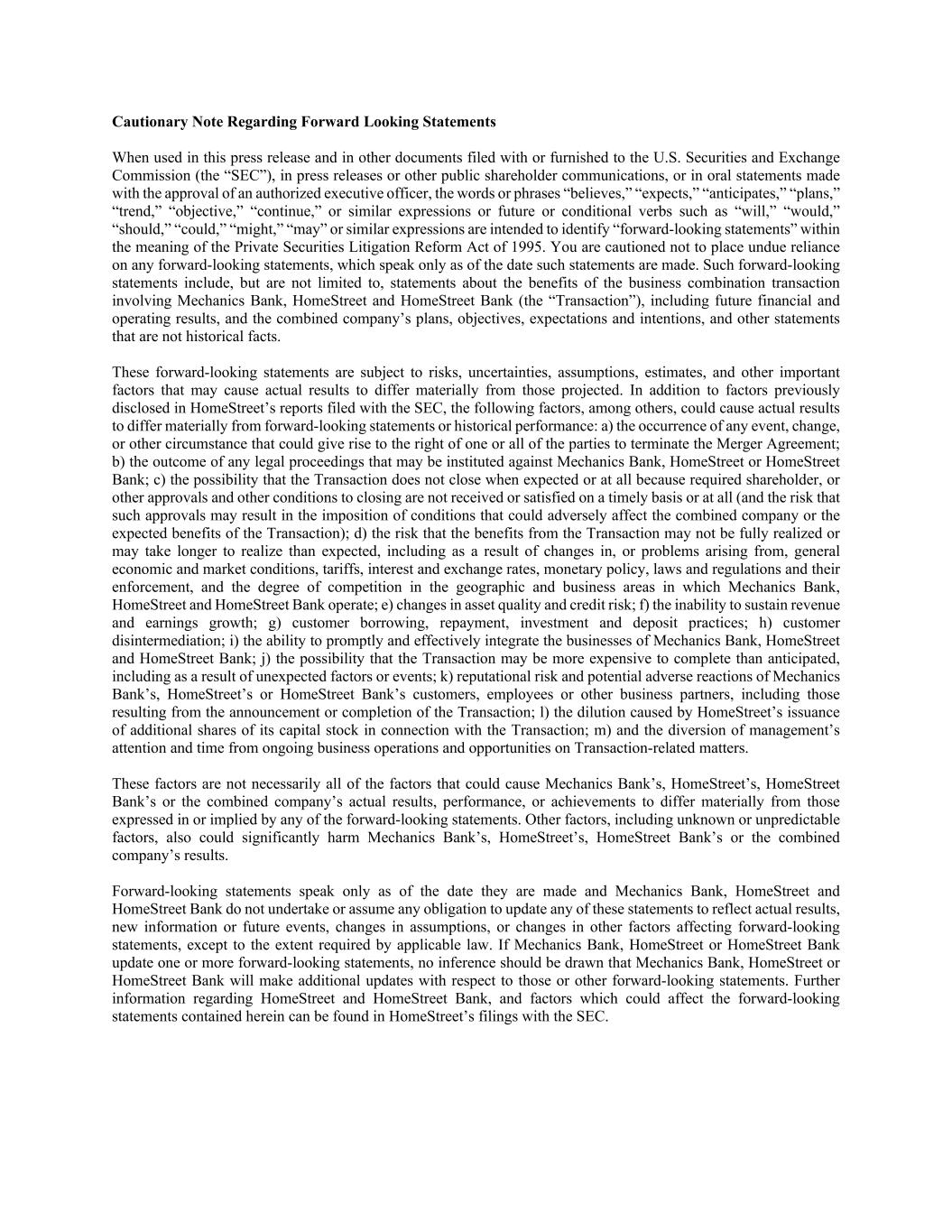 Cautionary Note Regarding Forward Looking Statements When used in this press release and in other documents filed with or furnished to the U.S. Securities and Exchange Commission (the “SEC”), in press releases or other public shareholder communications, or in oral statements made with the approval of an authorized executive officer, the words or phrases “believes,” “expects,” “anticipates,” “plans,” “trend,” “objective,” “continue,” or similar expressions or future or conditional verbs such as “will,” “would,” “should,” “could,” “might,” “may” or similar expressions are intended to identify “forward-looking statements” within the meaning of the Private Securities Litigation Reform Act of 1995. You are cautioned not to place undue reliance on any forward-looking statements, which speak only as of the date such statements are made. Such forward-looking statements include, but are not limited to, statements about the benefits of the business combination transaction involving Mechanics Bank, HomeStreet and HomeStreet Bank (the “Transaction”), including future financial and operating results, and the combined company’s plans, objectives, expectations and intentions, and other statements that are not historical facts. These forward-looking statements are subject to risks, uncertainties, assumptions, estimates, and other important factors that may cause actual results to differ materially from those projected. In addition to factors previously disclosed in HomeStreet’s reports filed with the SEC, the following factors, among others, could cause actual results to differ materially from forward-looking statements or historical performance: a) the occurrence of any event, change, or other circumstance that could give rise to the right of one or all of the parties to terminate the Merger Agreement; b) the outcome of any legal proceedings that may be instituted against Mechanics Bank, HomeStreet or HomeStreet Bank; c) the possibility that the Transaction does not close when expected or at all because required shareholder, or other approvals and other conditions to closing are not received or satisfied on a timely basis or at all (and the risk that such approvals may result in the imposition of conditions that could adversely affect the combined company or the expected benefits of the Transaction); d) the risk that the benefits from the Transaction may not be fully realized or may take longer to realize than expected, including as a result of changes in, or problems arising from, general economic and market conditions, tariffs, interest and exchange rates, monetary policy, laws and regulations and their enforcement, and the degree of competition in the geographic and business areas in which Mechanics Bank, HomeStreet and HomeStreet Bank operate; e) changes in asset quality and credit risk; f) the inability to sustain revenue and earnings growth; g) customer borrowing, repayment, investment and deposit practices; h) customer disintermediation; i) the ability to promptly and effectively integrate the businesses of Mechanics Bank, HomeStreet and HomeStreet Bank; j) the possibility that the Transaction may be more expensive to complete than anticipated, including as a result of unexpected factors or events; k) reputational risk and potential adverse reactions of Mechanics Bank’s, HomeStreet’s or HomeStreet Bank’s customers, employees or other business partners, including those resulting from the announcement or completion of the Transaction; l) the dilution caused by HomeStreet’s issuance of additional shares of its capital stock in connection with the Transaction; m) and the diversion of management’s attention and time from ongoing business operations and opportunities on Transaction-related matters. These factors are not necessarily all of the factors that could cause Mechanics Bank’s, HomeStreet’s, HomeStreet Bank’s or the combined company’s actual results, performance, or achievements to differ materially from those expressed in or implied by any of the forward-looking statements. Other factors, including unknown or unpredictable factors, also could significantly harm Mechanics Bank’s, HomeStreet’s, HomeStreet Bank’s or the combined company’s results. Forward-looking statements speak only as of the date they are made and Mechanics Bank, HomeStreet and HomeStreet Bank do not undertake or assume any obligation to update any of these statements to reflect actual results, new information or future events, changes in assumptions, or changes in other factors affecting forward-looking statements, except to the extent required by applicable law. If Mechanics Bank, HomeStreet or HomeStreet Bank update one or more forward-looking statements, no inference should be drawn that Mechanics Bank, HomeStreet or HomeStreet Bank will make additional updates with respect to those or other forward-looking statements. Further information regarding HomeStreet and HomeStreet Bank, and factors which could affect the forward-looking statements contained herein can be found in HomeStreet’s filings with the SEC.