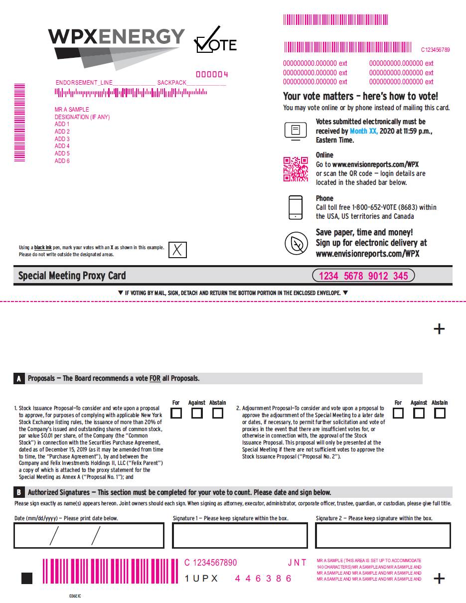 C123456789 000000000.000000 ext 000000000.000000 ext 000000000.000000 ext 000000000.000000 ext 000000000.000000 ext 000000000.000000 ext 000004 ENDORSEMENT_LINE______________ SACKPACK_____________ Your vote matters – here’s how to vote! You may vote online or by phone instead of mailing this card. Votes submitted electronically must be MR A SAMPLE DESIGNATION (IF ANY) ADD 1 ADD 2 ADD 3 ADD 4 ADD 5 ADD 6 received by Month XX, 2020 at 11:59 p.m., Eastern Time. Online GIof ntoo welwewct.reonnviicsivoontrienpgo, rts.com/WPX delete QR code and control # or scan the QR code — login details are located in the shaded bar below. Phone Call toll free 1-800-652-VOTE (8683) within the USA, US territories and Canada Save paper, time and money! Sign up for electronic delivery at www.envisionreports.com/WPX Using a black ink pen, mark your votes with an X as shown in this example. Please do not write outside the designated areas. q IF VOTING BY MAIL, SIGN, DETACH AND RETURN THE BOTTOM PORTION IN THE ENCLOSED ENVELOPE. q + For Against Abstain ForAgainst Abstain 1. Stock Issuance Proposal—To consider and vote upon a proposal to approve, for purposes of complying with applicable New York Stock Exchange listing rules, the issuance of more than 20% of the Company’s issued and outstanding shares of common stock, par value $0.01 per share, of the Company (the “Common Stock”) in connection with the Securities Purchase Agreement, dated as of December 15, 2019 (as it may be amended from time to time, the “Purchase Agreement”), by and between the Company and Felix Investments Holdings II, LLC (“Felix Parent”) a copy of which is attached to the proxy statement for the Special Meeting as Annex A (“Proposal No. 1”); and 2. Adjournment Proposal—To consider and vote upon a proposal to approve the adjournment of the Special Meeting to a later date or dates, if necessary, to permit further solicitation and vote of proxies in the event that there are insufficient votes for, or otherwise in connection with, the approval of the Stock Issuance Proposal. This proposal will only be presented at the Special Meeting if there are not sufficient votes to approve the Stock Issuance Proposal (“Proposal No. 2”). Please sign exactly as name(s) appears hereon. Joint owners should each sign. When signing as attorney, executor, administrator, corporate officer, trustee, guardian, or custodian, please give full title. Date (mm/dd/yyyy) — Please print date below. Signature 1 — Please keep signature within the box. Signature 2 — Please keep signature within the box. MMMMMMM C 1234567890 J N T 4 6 3 8 6 MR A SAMPLE (THIS AREA IS SET UP TO ACCOMMODATE 140 CHARACTERS) MR A SAMPLE AND MR A SAMPLE AND MR A SAMPLE AND MR A SAMPLE AND MR A SAMPLE AND MR A SAMPLE AND MR A SAMPLE AND MR A SAMPLE AND + 1 U P X 4 036EIC MMMMMMMMM B Authorized Signatures — This section must be completed for your vote to count. Please date and sign below. A Proposals — The Board recommends a vote FOR all Proposals. Special Meeting Proxy Card1234 5678 9012 345