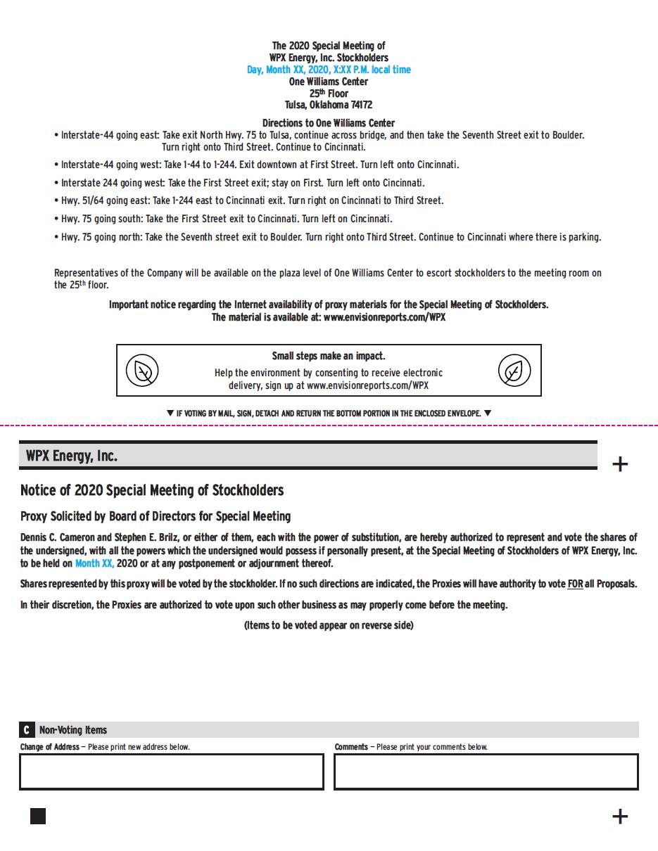 The 2020 Special Meeting of WPX Energy, Inc. Stockholders Day, Month XX, 2020, X:XX P.M. local time One Williams Center 25th Floor Tulsa, Oklahoma 74172 Directions to One Williams Center • lnterstate-44 going east: Take exit North Hwy. 75 to Tulsa, continue across bridge, and then take the Seventh Street exit to Boulder. Turn right onto Third Street. Continue to Cincinnati. • lnterstate-44 going west: Take 1-44 to 1-244. Exit downtown at First Street. Turn left onto Cincinnati. • Interstate 244 going west: Take the First Street exit; stay on First. Turn left onto Cincinnati. • Hwy. 51/64 going east: Take 1-244 east to Cincinnati exit. Turn right on Cincinnati to Third Street. • Hwy. 75 going south: Take the First Street exit to Cincinnati. Turn left on Cincinnati. • Hwy. 75 going north: Take the Seventh street exit to Boulder. Turn right onto Third Street. Continue to Cincinnati where there is parking. Representatives of the Company will be available on the plaza level of One Williams Center to escort stockholders to the meeting room on the 25th floor. Important notice regarding the Internet availability of proxy materials for the Special Meeting of Stockholders. The material is available at: www.envisionreports.com/WPX q IF VOTING BY MAIL, SIGN, DETACH AND RETURN THE BOTTOM PORTION IN THE ENCLOSED ENVELOPE. q + Notice of 2020 Special Meeting of Stockholders Proxy Solicited by Board of Directors for Special Meeting Dennis C. Cameron and Stephen E. Brilz, or either of them, each with the power of substitution, are hereby authorized to represent and vote the shares of the undersigned, with all the powers which the undersigned would possess if personally present, at the Special Meeting of Stockholders of WPX Energy, Inc. to be held on Month XX, 2020 or at any postponement or adjournment thereof. Shares represented by this proxy will be voted by the stockholder. If no such directions are indicated, the Proxies will have authority to vote FOR all Proposals. In their discretion, the Proxies are authorized to vote upon such other business as may properly come before the meeting. (Items to be voted appear on reverse side) Change of Address — Please print new address below. Comments — Please print your comments below. + C Non-Voting Items WPX Energy, Inc. Small steps make an impact. Help the environment by consenting to receive electronic delivery, sign up at www.envisionreports.com/WPX