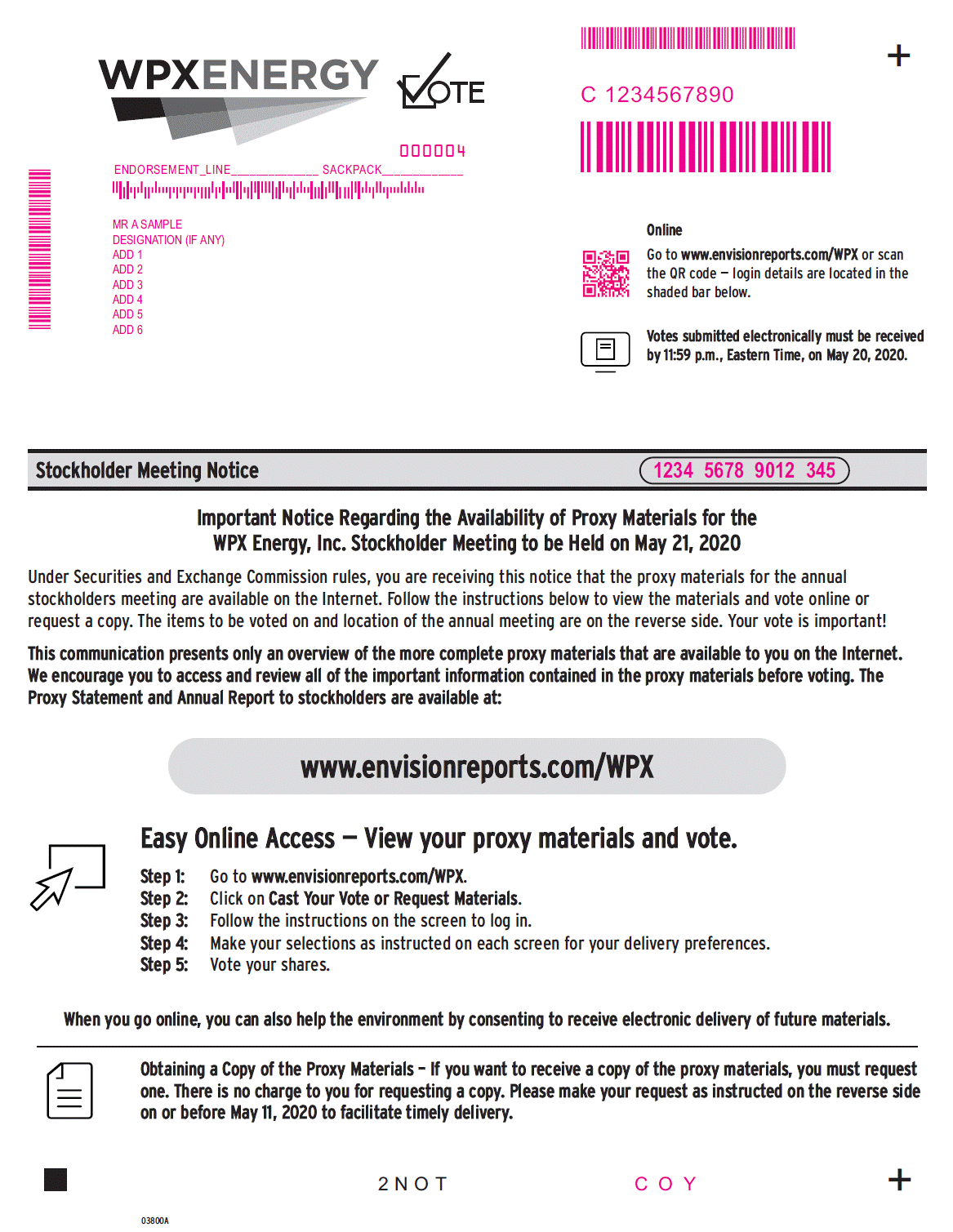 MMMMMMMMMMMM + MMMMMMM C 1234567890 The Sample Company 000004 ENDORSEMENT_LINE______________ SACKPACK_____________ MR A SAMPLE DESIGNATION (IF ANY) ADD 1 ADD 2 ADD 3 ADD 4 ADD 5 ADD 6 Online Go to www.envisionreports.com/WPX or scan the QR code — login details are located in the shaded bar below. Votes submitted electronically must be received by 11:59 p.m., Eastern Time, on May 20, 2020. Important Notice Regarding the Availability of Proxy Materials for the WPX Energy, Inc. Stockholder Meeting to be Held on May 21, 2020 Under Securities and Exchange Commission rules, you are receiving this notice that the proxy materials for the annual stockholders meeting are available on the Internet. Follow the instructions below to view the materials and vote online or request a copy. The items to be voted on and location of the annual meeting are on the reverse side. Your vote is important! This communication presents only an overview of the more complete proxy materials that are available to you on the Internet. We encourage you to access and review all of the important information contained in the proxy materials before voting. The Proxy Statement and Annual Report to stockholders are available at: www.envisionreports.com/WPX Easy Online Access — View your proxy materials and vote. Step 1: Step 2: Step 3: Step 4: Step 5: Go to www.envisionreports.com/WPX. Click on Cast Your Vote or Request Materials. Follow the instructions on the screen to log in. Make your selections as instructed on each screen for your delivery preferences. Vote your shares. When you go online, you can also help the environment by consenting to receive electronic delivery of future materials. Obtaining a Copy of the Proxy Materials – If you want to receive a copy of the proxy materials, you must request one. There is no charge to you for requesting a copy. Please make your request as instructed on the reverse side on or before May 11, 2020 to facilitate timely delivery. + 2 N O T C O Y 0380OA MMMMMMMMM Stockholder Meeting Notice 1234 5678 9012 345
