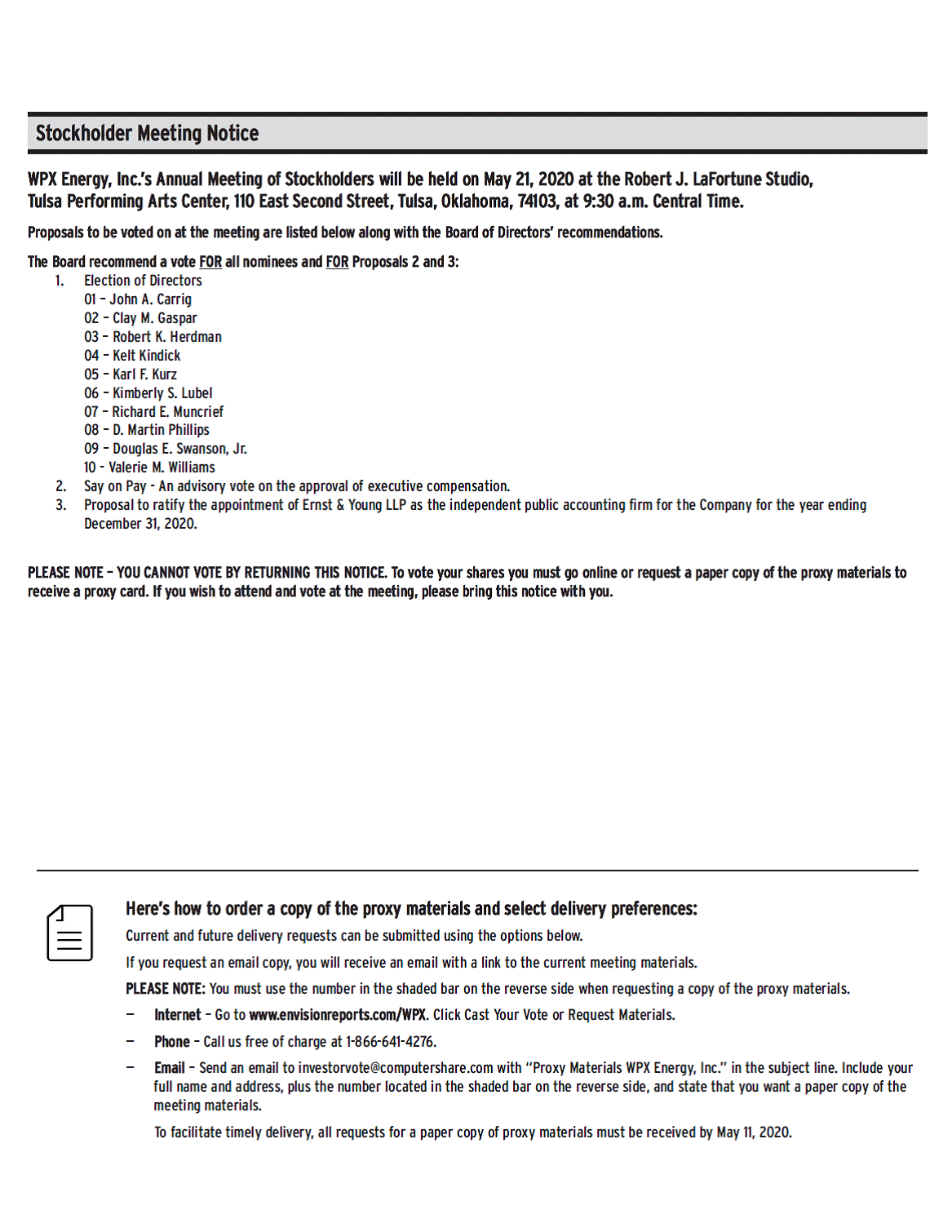 WPX Energy, Inc.’s Annual Meeting of Stockholders will be held on May 21, 2020 at the Robert J. LaFortune Studio, Tulsa Performing Arts Center, 110 East Second Street, Tulsa, Oklahoma, 74103, at 9:30 a.m. Central Time. Proposals to be voted on at the meeting are listed below along with the Board of Directors’ recommendations. The Board recommend a vote FOR all nominees and FOR Proposals 2 and 3: 1. Election of Directors 01 – John A. Carrig 02 – Clay M. Gaspar 03 – Robert K. Herdman 04 – Kelt Kindick 05 – Karl F. Kurz 06 – Kimberly S. Lubel 07 – Richard E. Muncrief 08 – D. Martin Phillips 09 – Douglas E. Swanson, Jr. 10 - Valerie M. Williams Say on Pay - An advisory vote on the approval of executive compensation. Proposal to ratify the appointment of Ernst & Young LLP as the independent public accounting firm for the Company for the year ending December 31, 2020. 2. 3. PLEASE NOTE – YOU CANNOT VOTE BY RETURNING THIS NOTICE. To vote your shares you must go online or request a paper copy of the proxy materials to receive a proxy card. If you wish to attend and vote at the meeting, please bring this notice with you. Here’s how to order a copy of the proxy materials and select delivery preferences: Current and future delivery requests can be submitted using the options below. If you request an email copy, you will receive an email with a link to the current meeting materials. PLEASE NOTE: You must use the number in the shaded bar on the reverse side when requesting a copy of the proxy materials. — — — Internet – Go to www.envisionreports.com/WPX. Click Cast Your Vote or Request Materials. Phone – Call us free of charge at 1-866-641-4276. Email – Send an email to investorvote@computershare.com with “Proxy Materials WPX Energy, Inc.” in the subject line. Include your full name and address, plus the number located in the shaded bar on the reverse side, and state that you want a paper copy of the meeting materials. To facilitate timely delivery, all requests for a paper copy of proxy materials must be received by May 11, 2020. Stockholder Meeting Notice