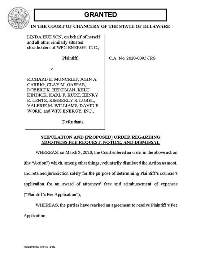 IN THE COURT OF CHANCERY OF THE STATE OF DELAWARE LINDA HUDSON, on behalf of herself and all other similarly situated stockholders of WPX ENERGY, INC., Plaintiff, v. RICHARD E. MUNCRIEF, JOHN A. CARRIG, CLAY M. GASPAR, ROBERT K. HERDMAN, KELT KINDICK, KARL F. KURZ, HENRY E. LENTZ, KIMBERLY S. LUBEL, VALERIE M. WILLIAMS, DAVID F. WORK, and WPX ENERGY, INC., Defendants. C.A. No. 2020-0095-JRS STIPULATION AND [PROPOSED] ORDER REGARDING MOOTNESS FEE REQUEST, NOTICE, AND DISMISSAL WHEREAS, on March 3, 2020, the Court entered an order in the above action (the “Action”) which, among other things, voluntarily dismissed the Action as moot, and retained jurisdiction solely for the purpose of determining Plaintiff’s counsel’s application for an award of attorneys’ fees and reimbursement of expenses (“Plaintiff’s Fee Application”); WHEREAS, the parties have reached an agreement to resolve Plaintiff’s Fee Application;