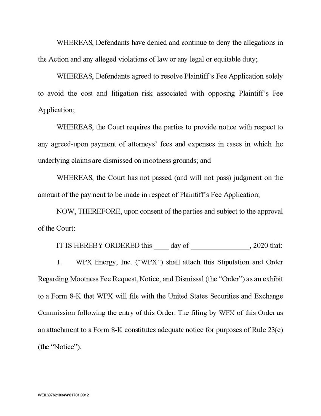 WHEREAS, Defendants have denied and continue to deny the allegations in the Action and any alleged violations of law or any legal or equitable duty; WHEREAS, Defendants agreed to resolve Plaintiff’s Fee Application solely to avoid the cost and litigation risk associated with opposing Plaintiff’s Fee Application; WHEREAS, the Court requires the parties to provide notice with respect to any agreed-upon payment of attorneys’ fees and expenses in cases in which the underlying claims are dismissed on mootness grounds; and WHEREAS, the Court has not passed (and will not pass) judgment on the amount of the payment to be made in respect of Plaintiff’s Fee Application; NOW, THEREFORE, upon consent of the parties and subject to the approval of the Court: IT IS HEREBY ORDERED this day of , 2020 that:1. WPX Energy, Inc. (“WPX”) shall attach this Stipulation and Order Regarding Mootness Fee Request, Notice, and Dismissal (the “Order”) as an exhibit to a Form 8-K that WPX will file with the United States Securities and Exchange Commission following the entry of this Order. The filing by WPX of this Order as an attachment to a Form 8-K constitutes adequate notice for purposes of Rule 23(e) (the “Notice”).WEIL:\97621834\4\81781.0012