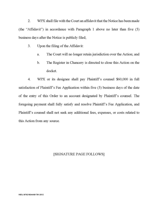 2. WPX shall file with the Court an affidavit that the Notice has been made (the “Affidavit”) in accordance with Paragraph 1 above no later than five (5) business days after the Notice is publicly filed; 3. Upon the filing of the Affidavit:a. The Court will no longer retain jurisdiction over the Action; and b. The Register in Chancery is directed to close this Action on the docket.4. WPX or its designee shall pay Plaintiff’s counsel $60,000 in full satisfaction of Plaintiff’s Fee Application within five (5) business days of the date of the entry of this Order to an account designated by Plaintiff’s counsel. The foregoing payment shall fully satisfy and resolve Plaintiff’s Fee Application, and Plaintiff’s counsel shall not seek any additional fees, expenses, or costs related to this Action from any source.[SIGNATURE PAGE FOLLOWS]