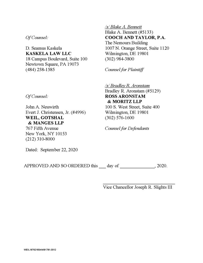 Of Counsel:D. Seamus Kaskela KASKELA LAW LLC 18 Campus Boulevard, Suite 100 Newtown Square, PA 19073 (484) 258-1585/s/ Blake A. Bennett Blake A. Bennett (#5133) COOCH AND TAYLOR, P.A. The Nemours Building 1007 N. Orange Street, Suite 1120 Wilmington, DE 19801 (302) 984-3800Counsel for PlaintiffOf Counsel:John A. Neuwirth Evert J. Christensen, Jr. (#4996) WEIL, GOTSHAL & MANGES LLP 767 Fifth Avenue New York, NY 10153 (212) 310-8000/s/ Bradley R. Aronstam Bradley R. Aronstam (#5129) ROSS ARONSTAM & MORITZ LLP 100 S. West Street, Suite 400 Wilmington, DE 19801 (302) 576-1600Counsel for DefendantsDated: September 22, 2020APPROVED AND SO ORDERED this day of , 2020.Vice Chancellor Joseph R. Slights III