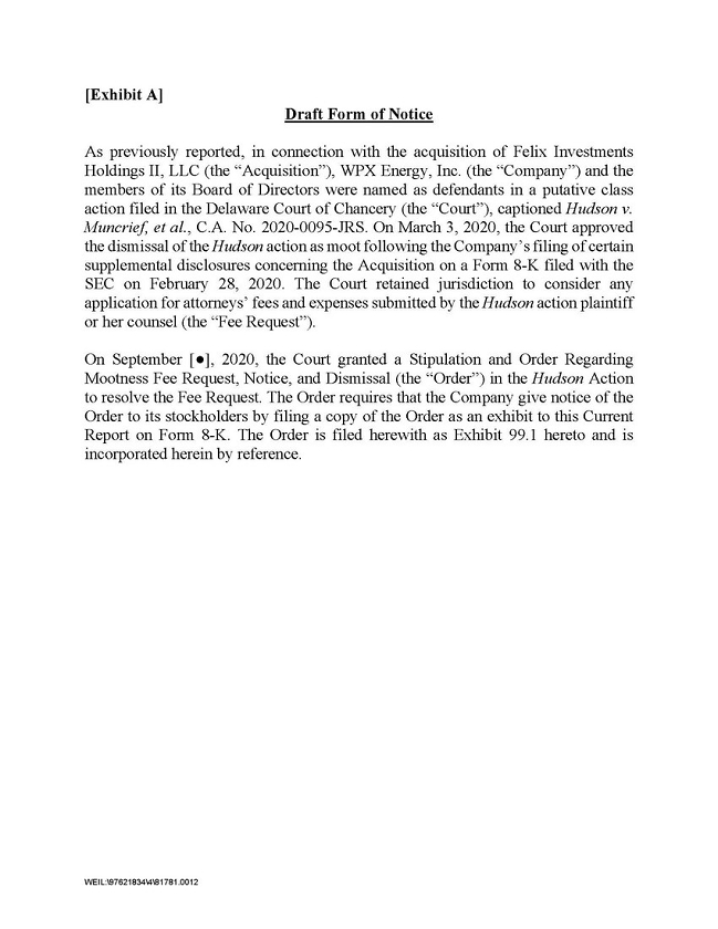 [Exhibit A]Draft Form of NoticeAs previously reported, in connection with the acquisition of Felix Investments Holdings II, LLC (the “Acquisition”), WPX Energy, Inc. (the “Company”) and the members of its Board of Directors were named as defendants in a putative class action filed in the Delaware Court of Chancery (the “Court”), captioned Hudson v. Muncrief, et al., C.A. No. 2020-0095-JRS. On March 3, 2020, the Court approved the dismissal of the Hudson action as moot following the Company’s filing of certain supplemental disclosures concerning the Acquisition on a Form 8-K filed with the SEC on February 28, 2020. The Court retained jurisdiction to consider any application for attorneys’ fees and expenses submitted by the Hudson action plaintiff or her counsel (the “Fee Request”).On September [●], 2020, the Court granted a Stipulation and Order Regarding Mootness Fee Request, Notice, and Dismissal (the “Order”) in the Hudson Action to resolve the Fee Request. The Order requires that the Company give notice of the Order to its stockholders by filing a copy of the Order as an exhibit to this Current Report on Form 8-K. The Order is filed herewith as hereto and is incorporated herein by reference.