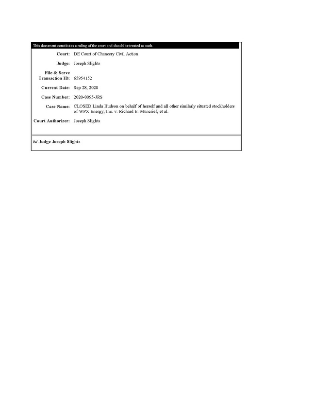 This document constitutes a ruling of the court and should be treated as such.Court: DE Court of Chancery Civil ActionJudge: Joseph SlightsFile & Serve Transaction ID: 65954152Current Date: Sep 28, 2020Case Number: 2020-0095-JRSCase Name: CLOSED Linda Hudson on behalf of herself and all other similarly situated stockholders of WPX Energy, Inc. v. Richard E. Muncrief, et al.Court Authorizer: Joseph Slights/s/ Judge Joseph Slights