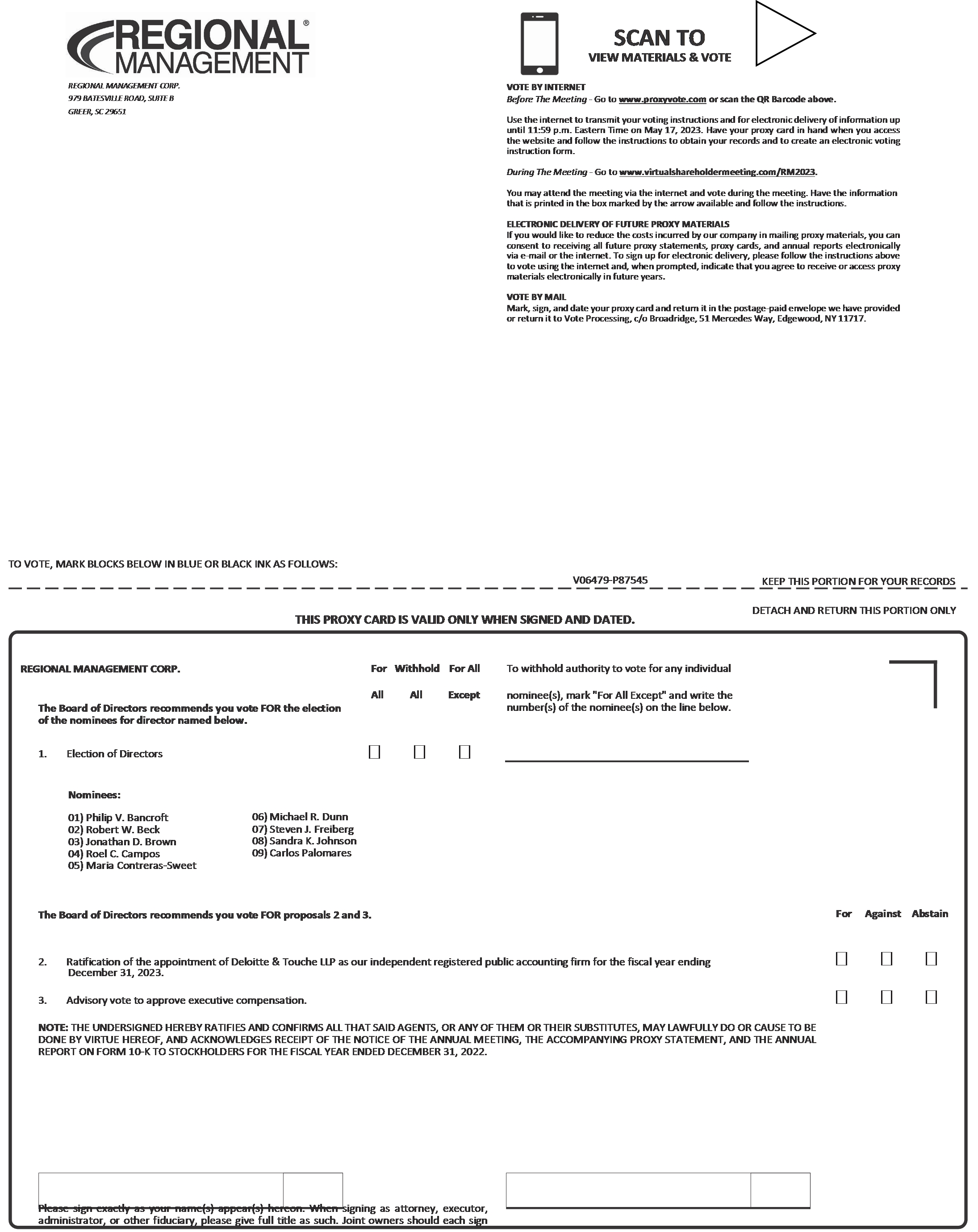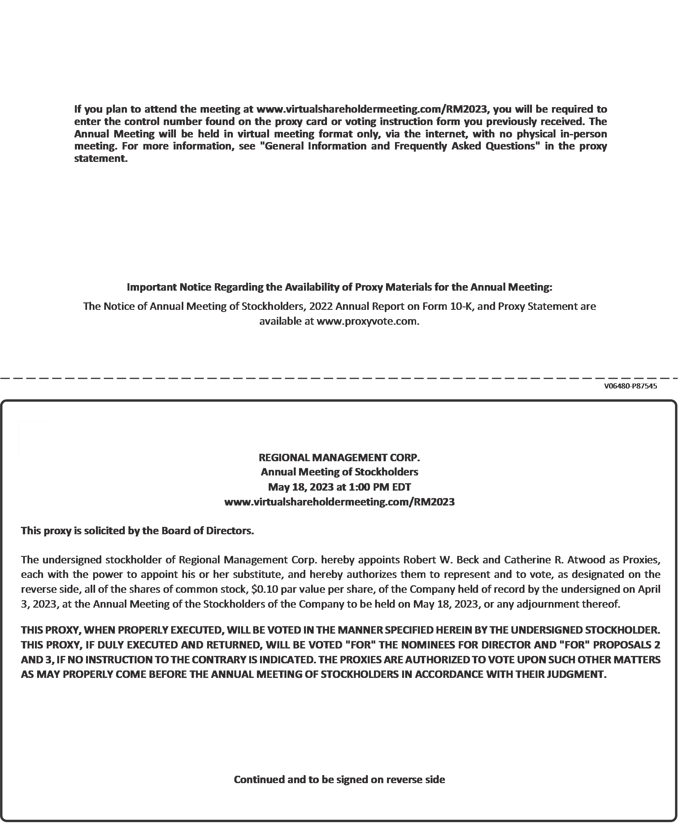 IMPORTANT NOTICE REGARDING THE AVAILABILITY OF PROXY MATERIALS FOR THE STOCKHOLDER MEETING TO BE HELD ON MAY 18, 2023: The Notice of Annual Meeting of Stockholders, Proxy Statement, and Annual Report on Form 10-K are available free of charge at https://materials.proxyvote.com/75902K and on our Investor Relations website at www.regionalmanagement.com. |