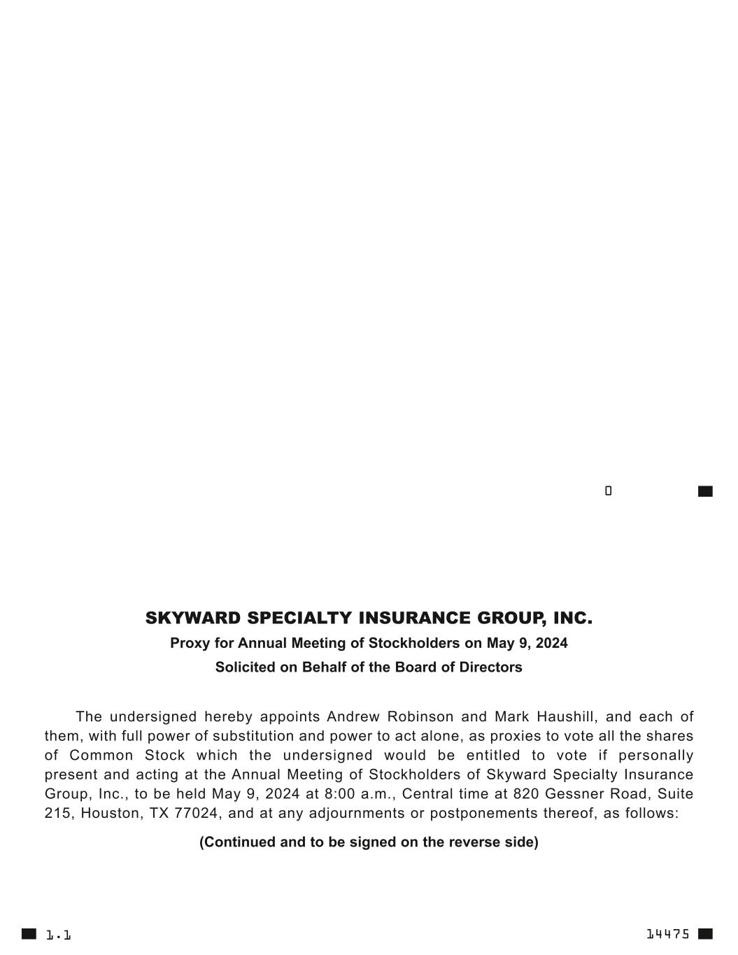 0 ------------------ . . . . . . . . . . . . . . . . . . . . . . . . . . . . . . . . . . . . . . . . . . . . . . . . . . . . . . ---------------- 14475 SKYWARD SPECIALTY INSURANCE GROUP, INC. Proxy for Annual Meeting of Stockholders on May 9, 2024 Solicited on Behalf of the Board of Directors The undersigned hereby appoints Andrew Robinson and Mark Haushill, and each of them, with full power of substitution and power to act alone, as proxies to vote all the shares of Common Stock which the undersigned would be entitled to vote if personally present and acting at the Annual Meeting of Stockholders of Skyward Specialty Insurance Group, Inc., to be held May 9, 2024 at 8:00 a.m., Central time at 820 Gessner Road, Suite 215, Houston, TX 77024, and at any adjournments or postponements thereof, as follows: (Continued and to be signed on the reverse side) 1.1