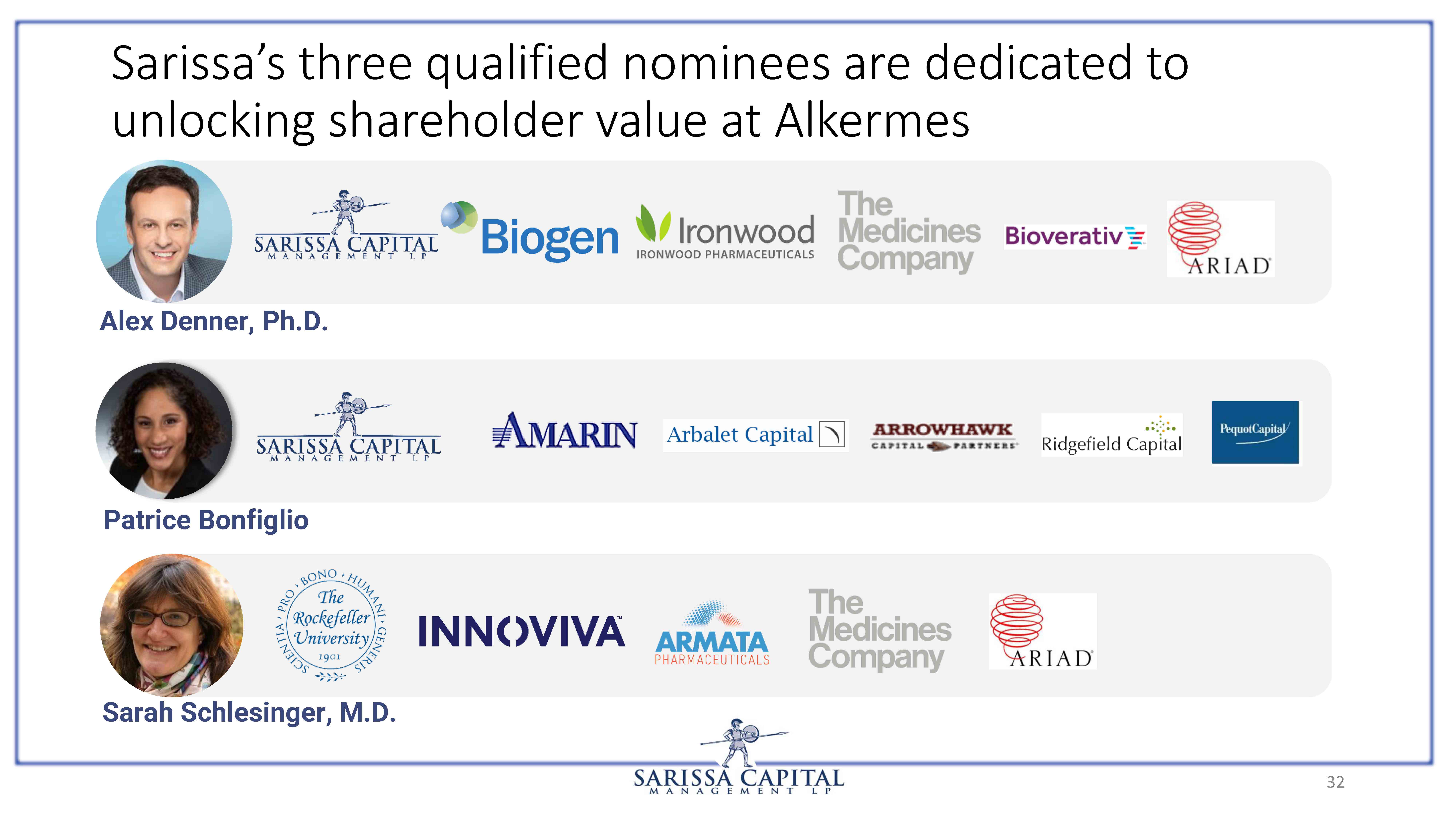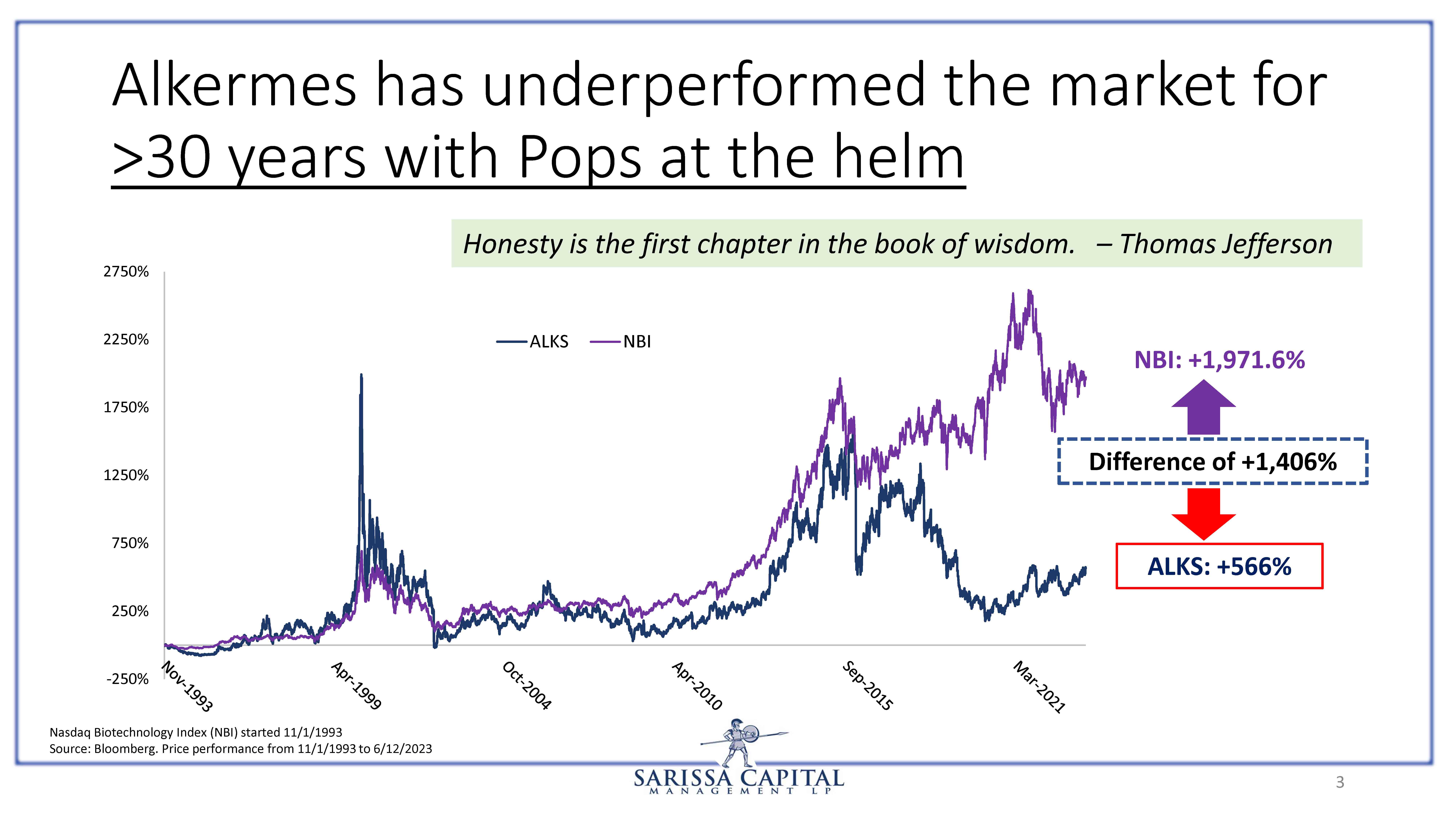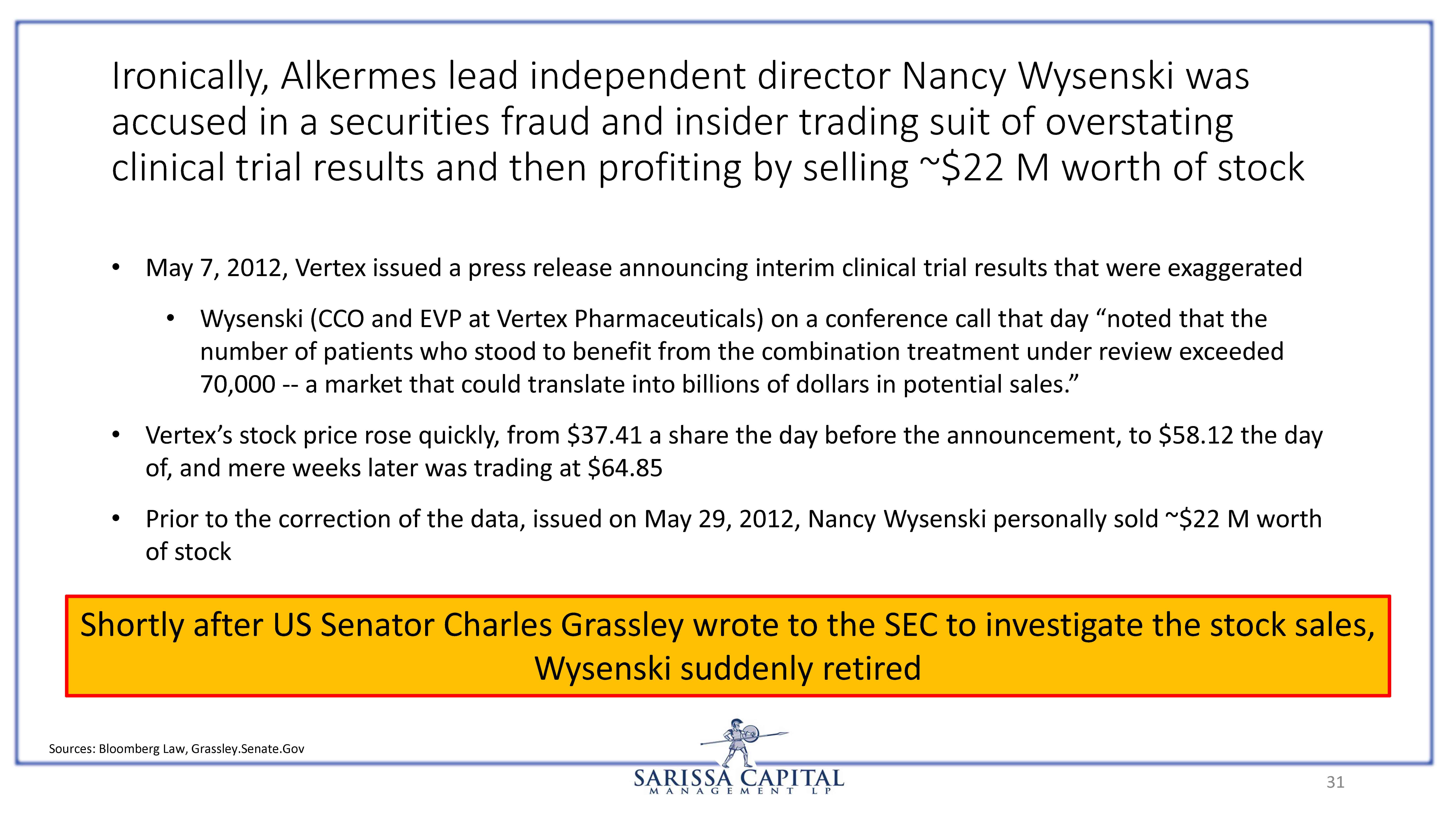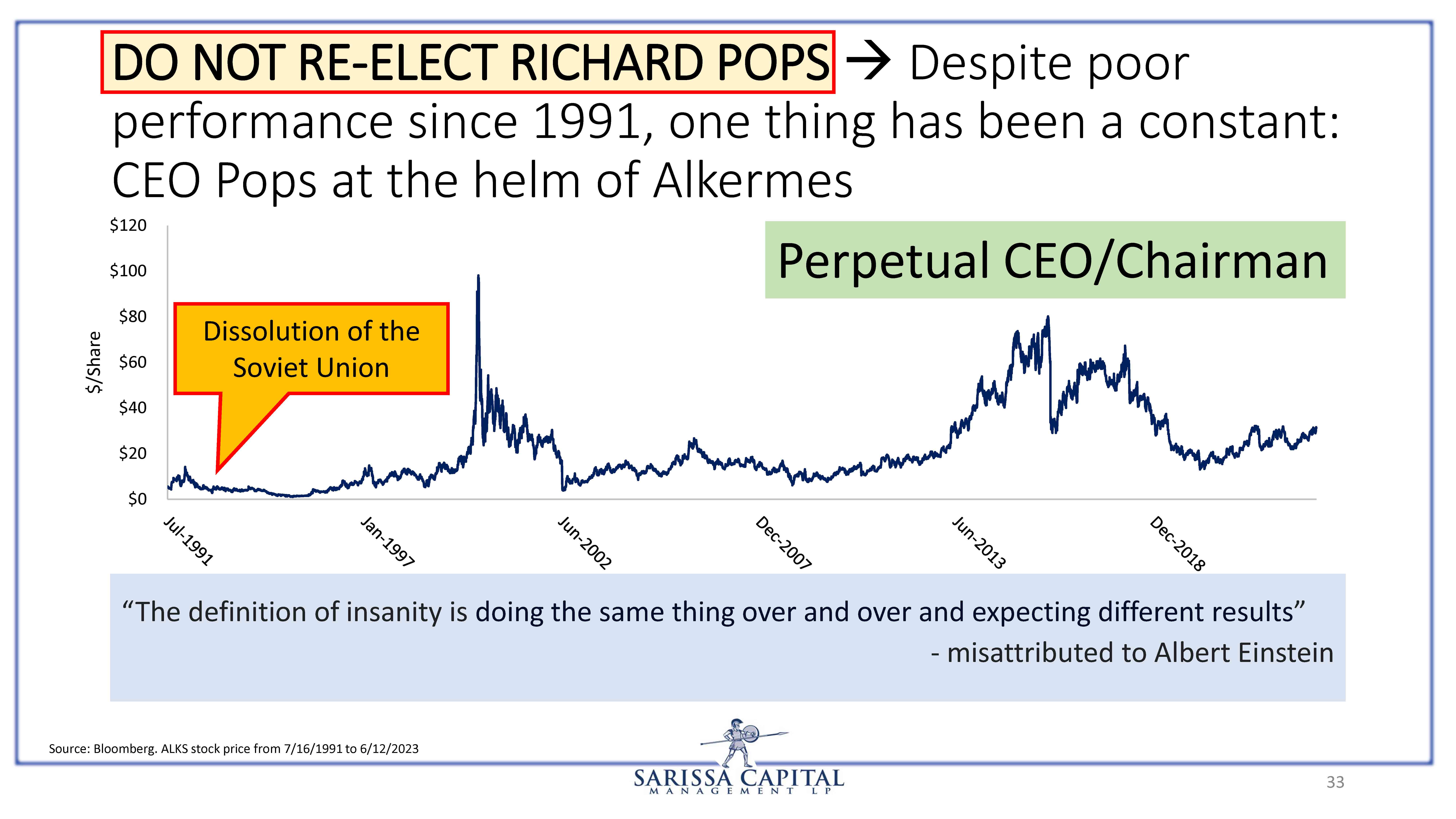 Sarissa believes Chairman and CEO Richard Pops will never run Alkermes for the benefit