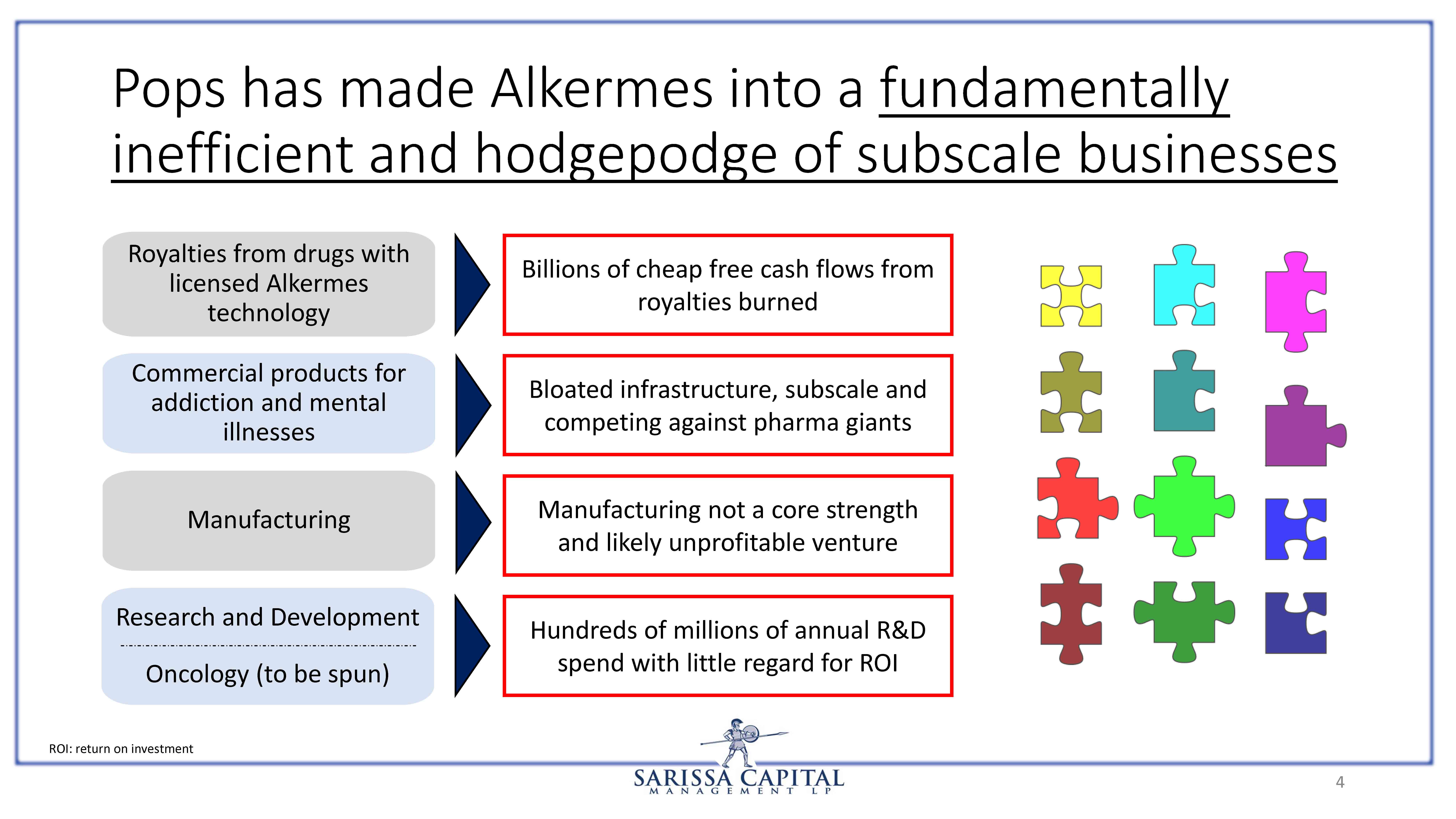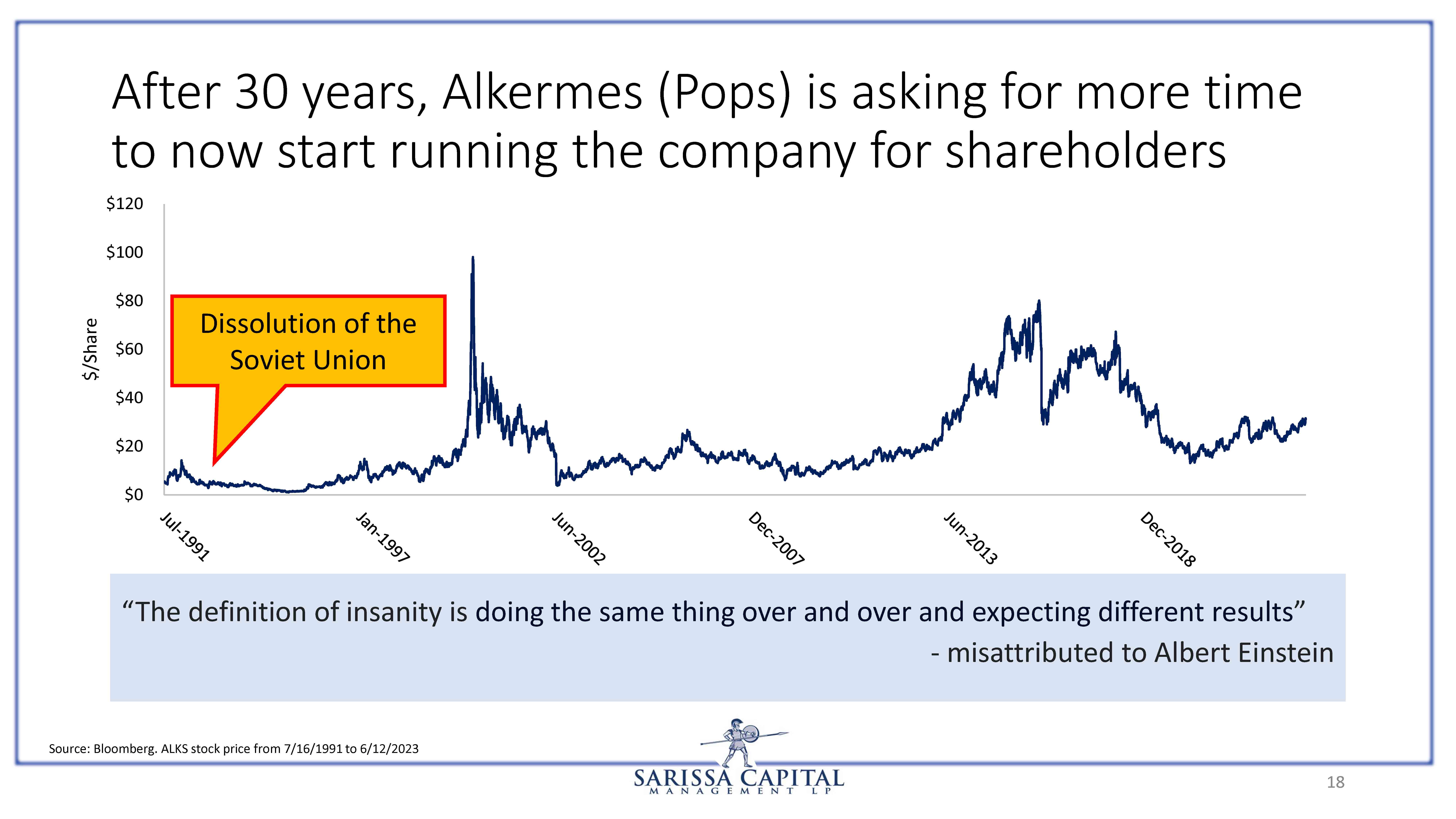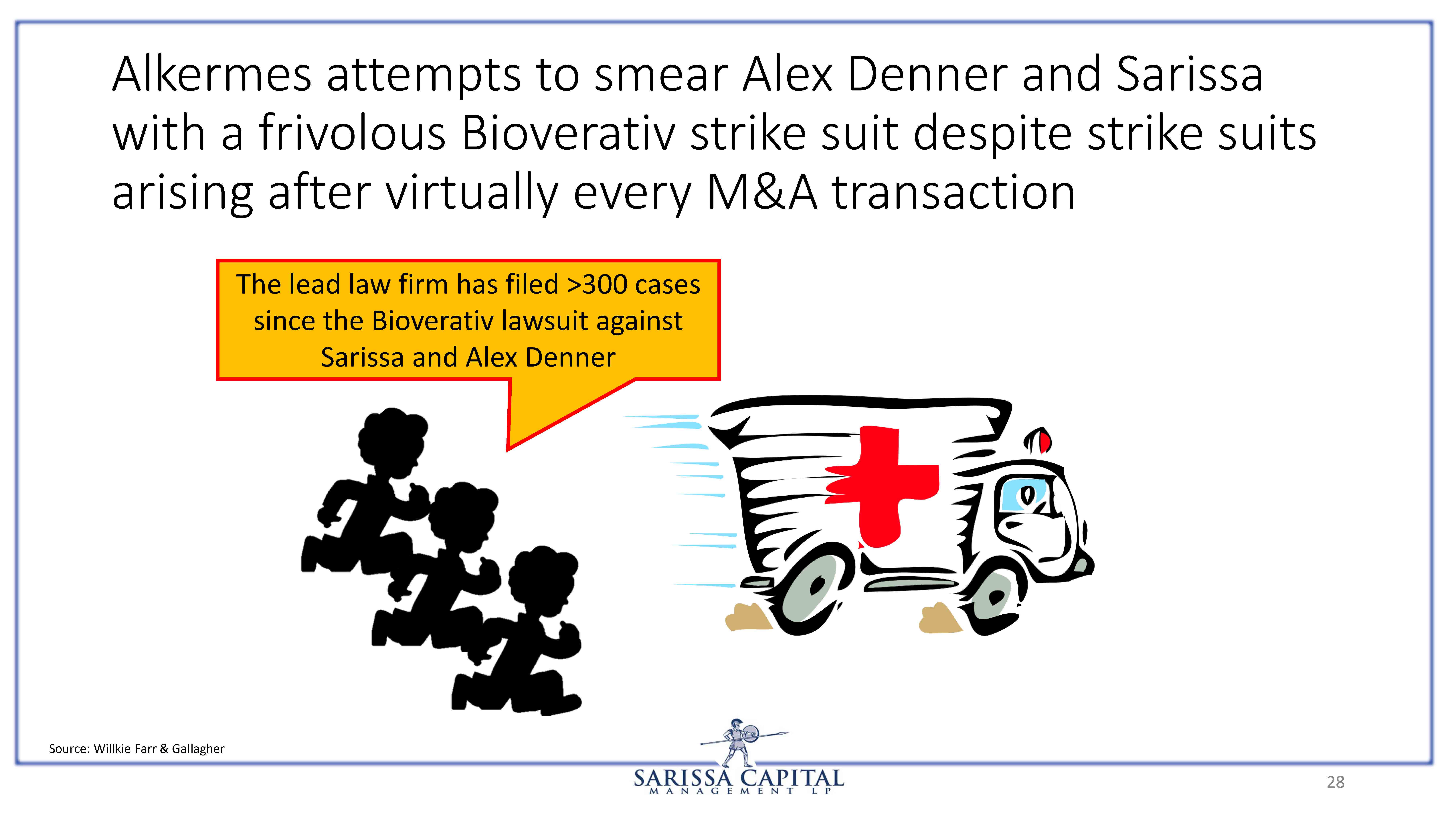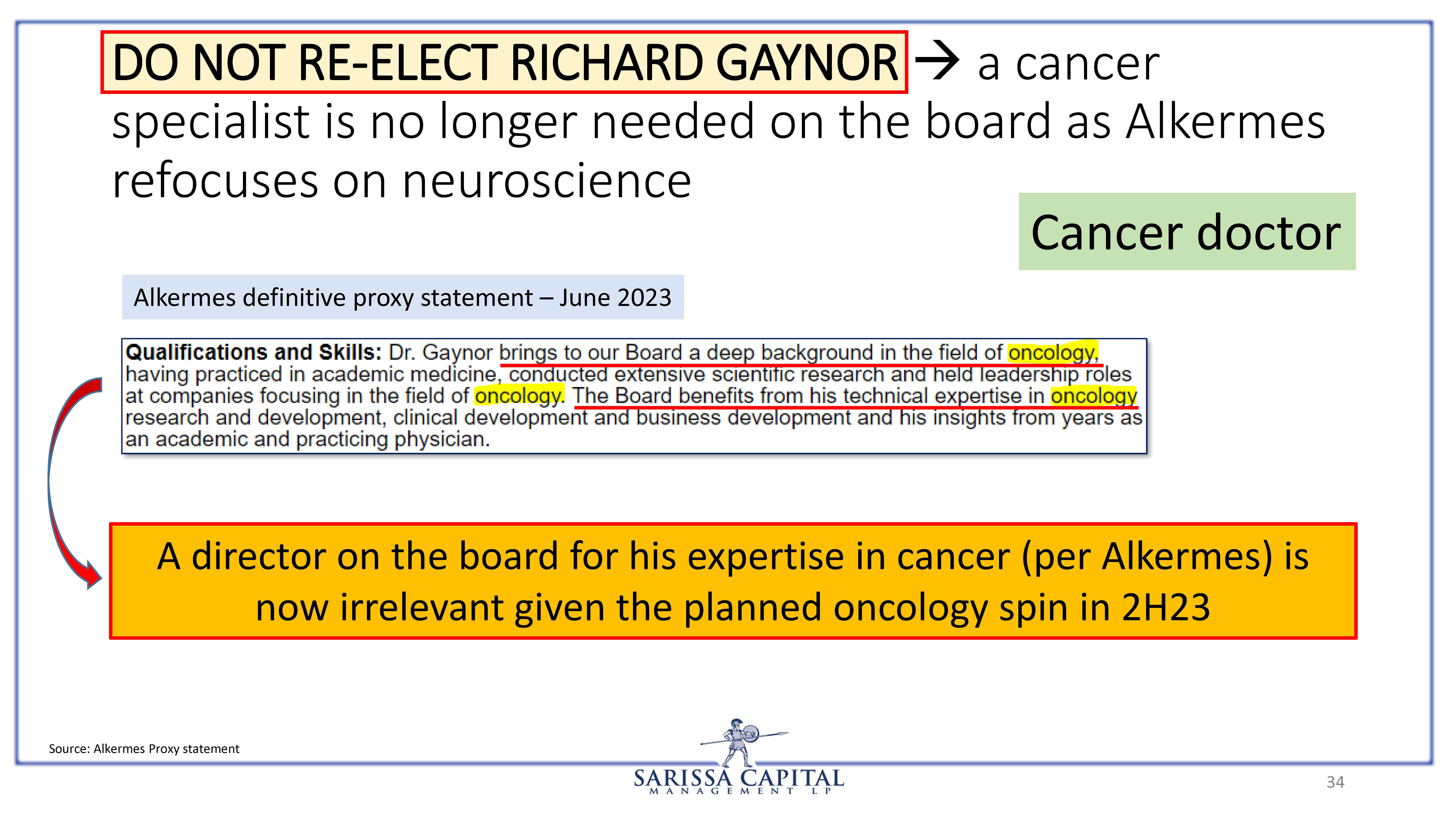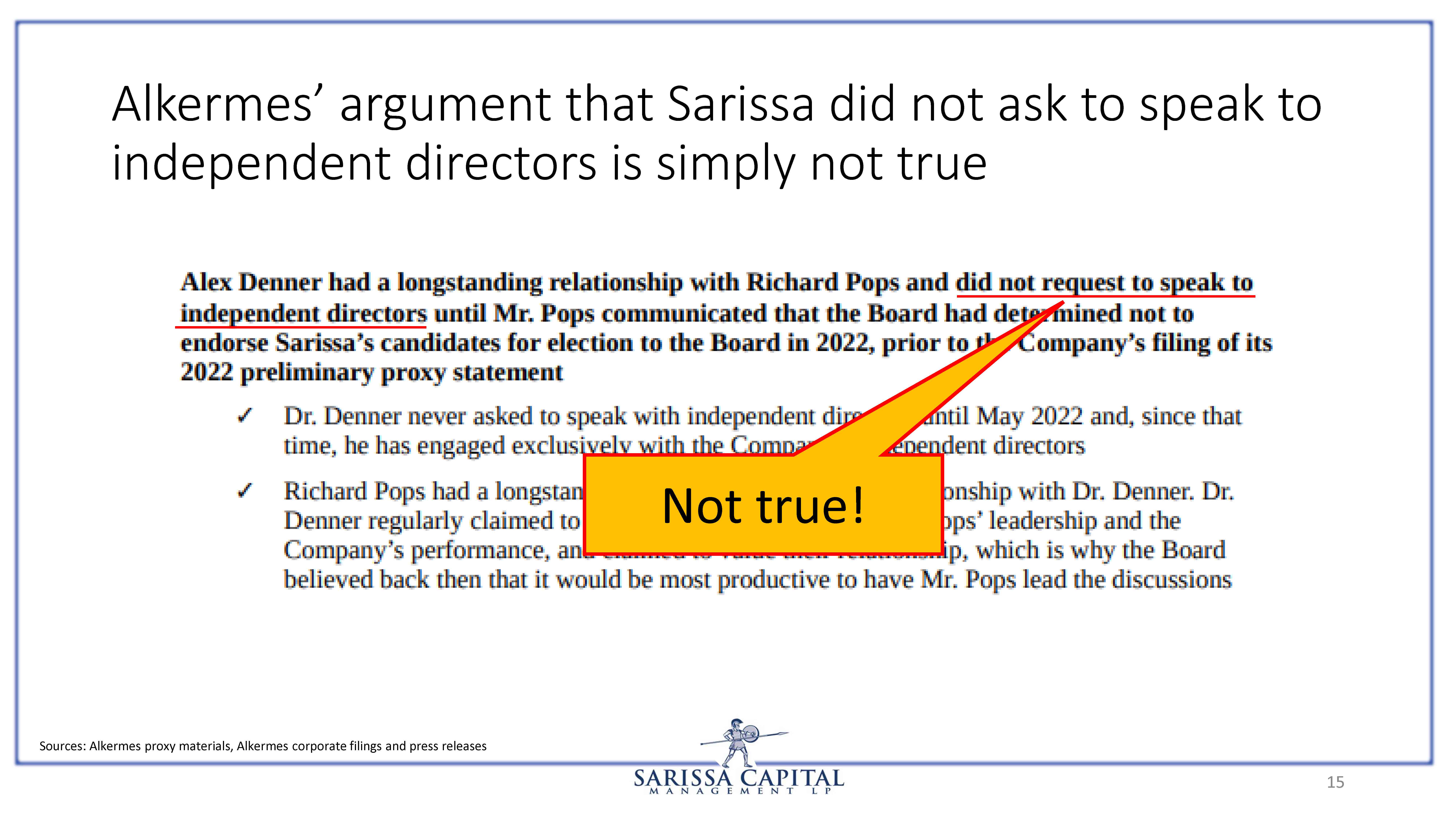 Sarissa believes Chairman and CEO Richard Pops will never run Alkermes for the benefit