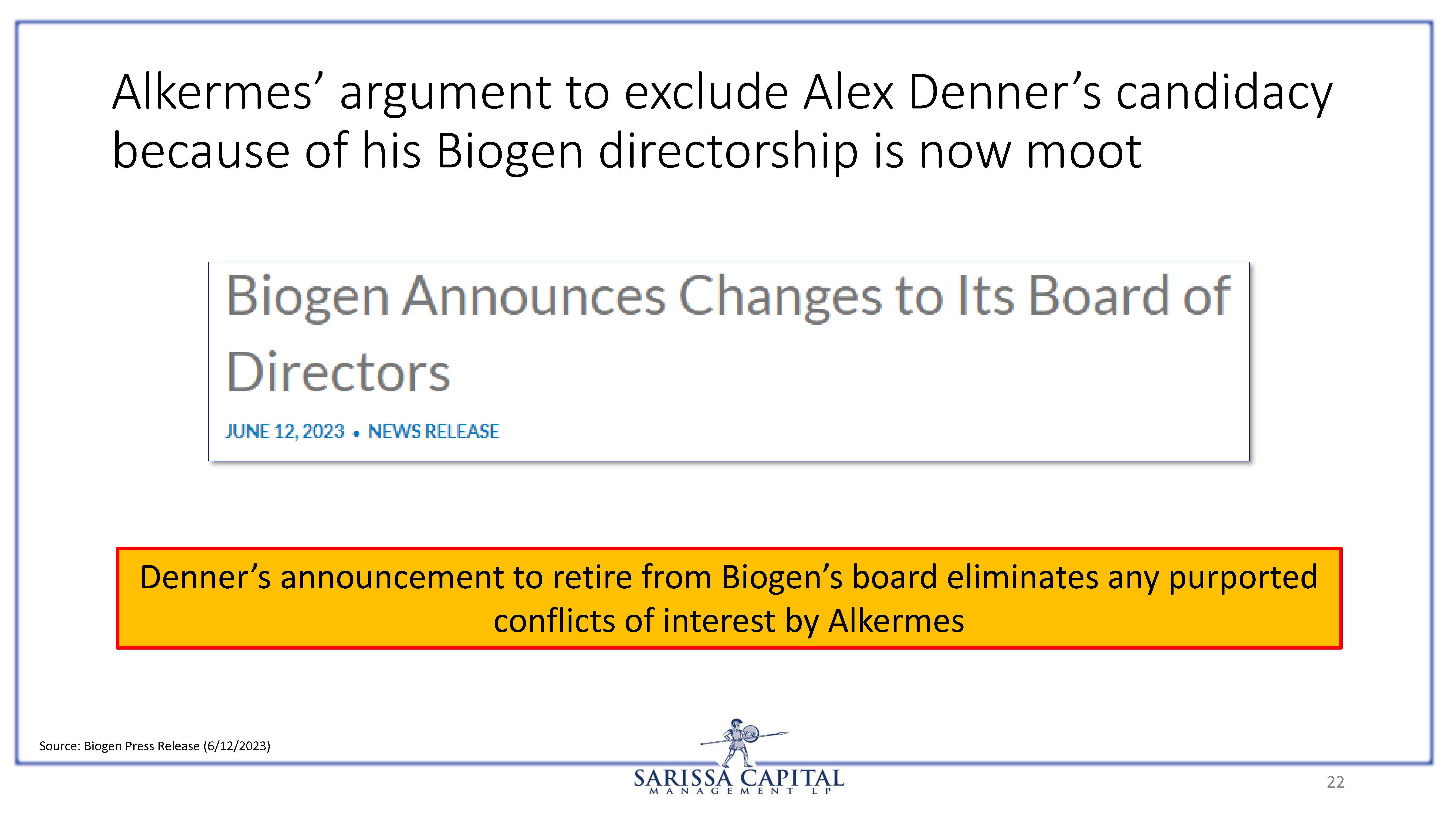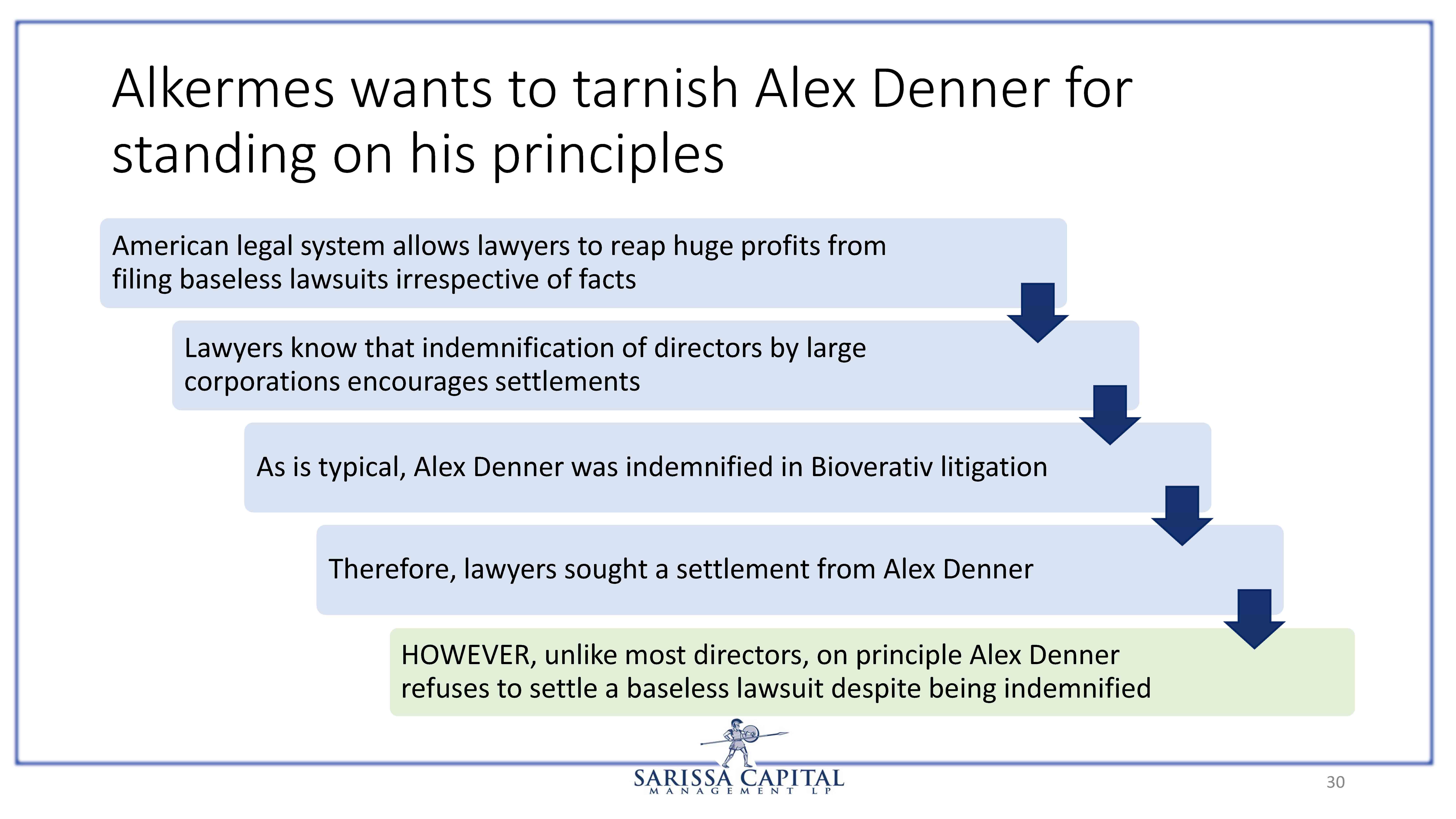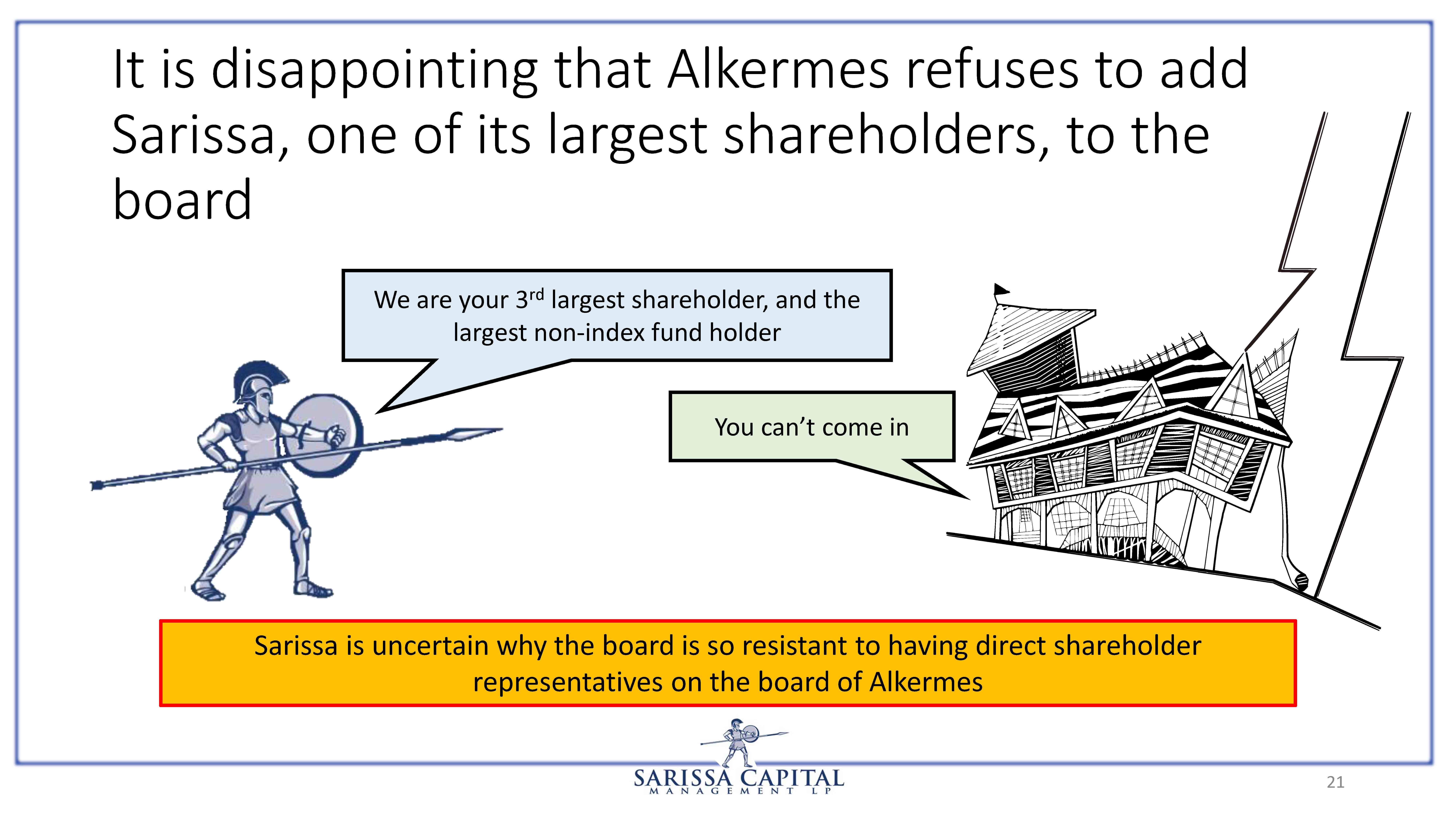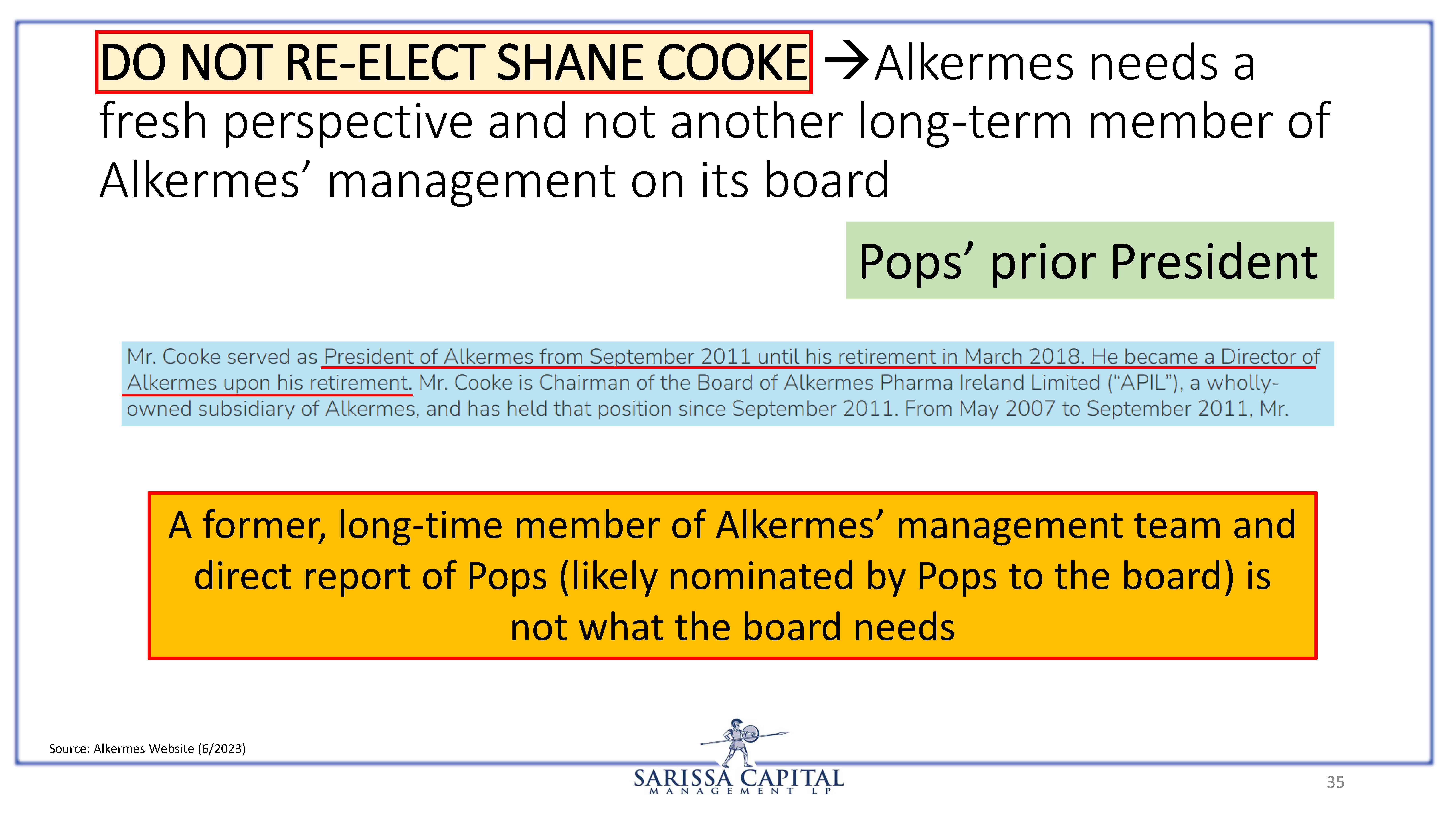 Sarissa believes Chairman and CEO Richard Pops will never run Alkermes for the benefit
