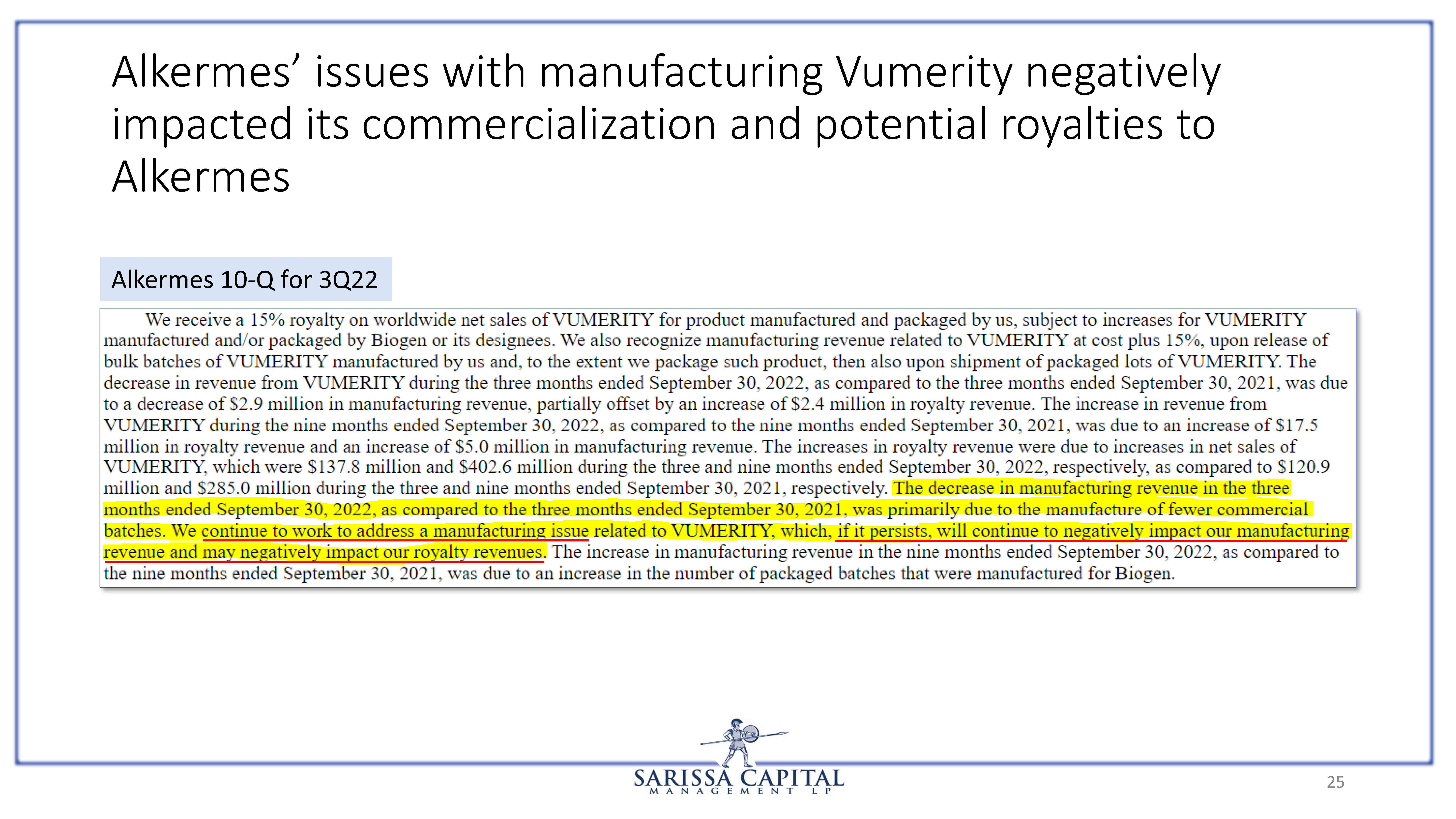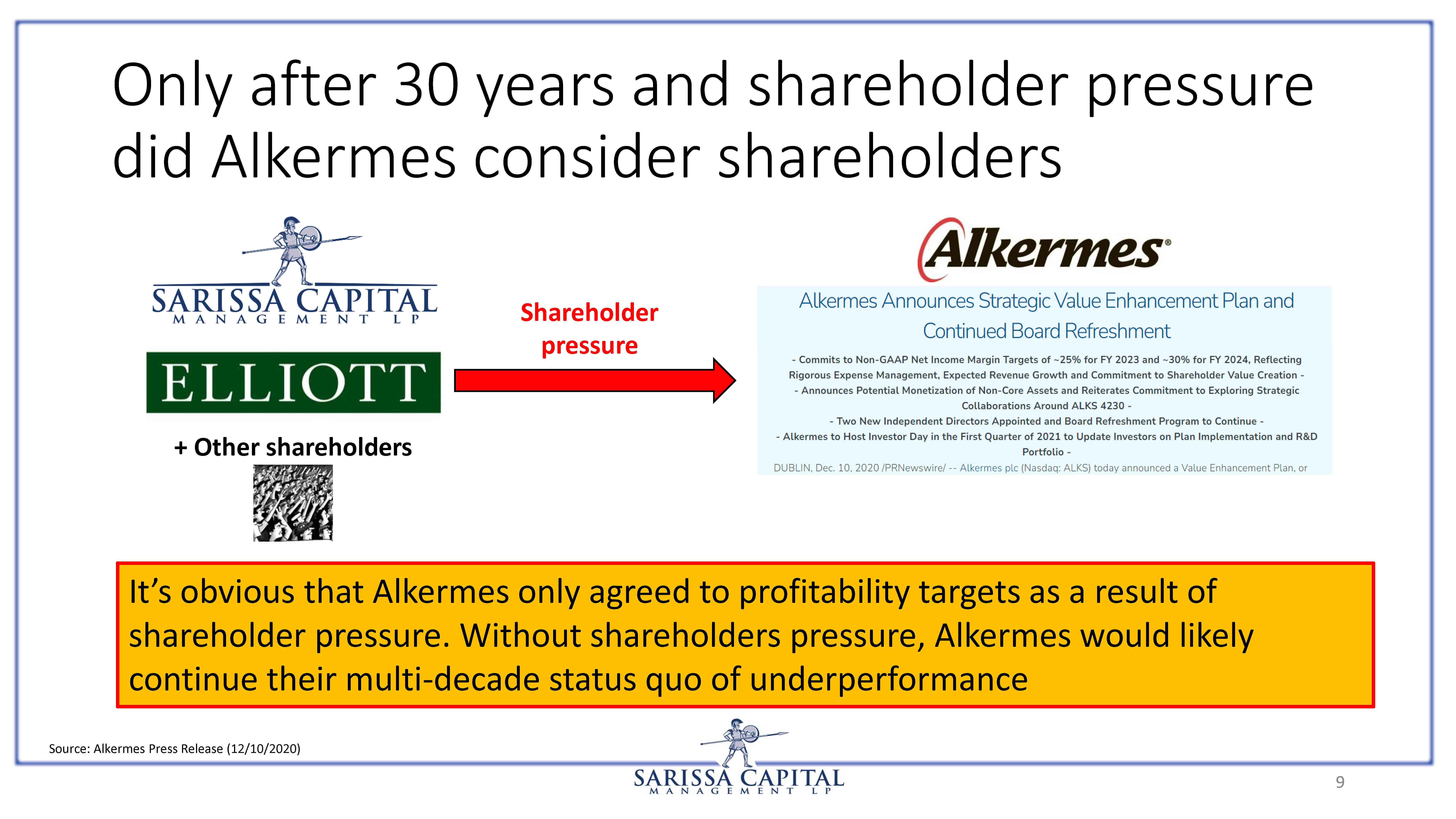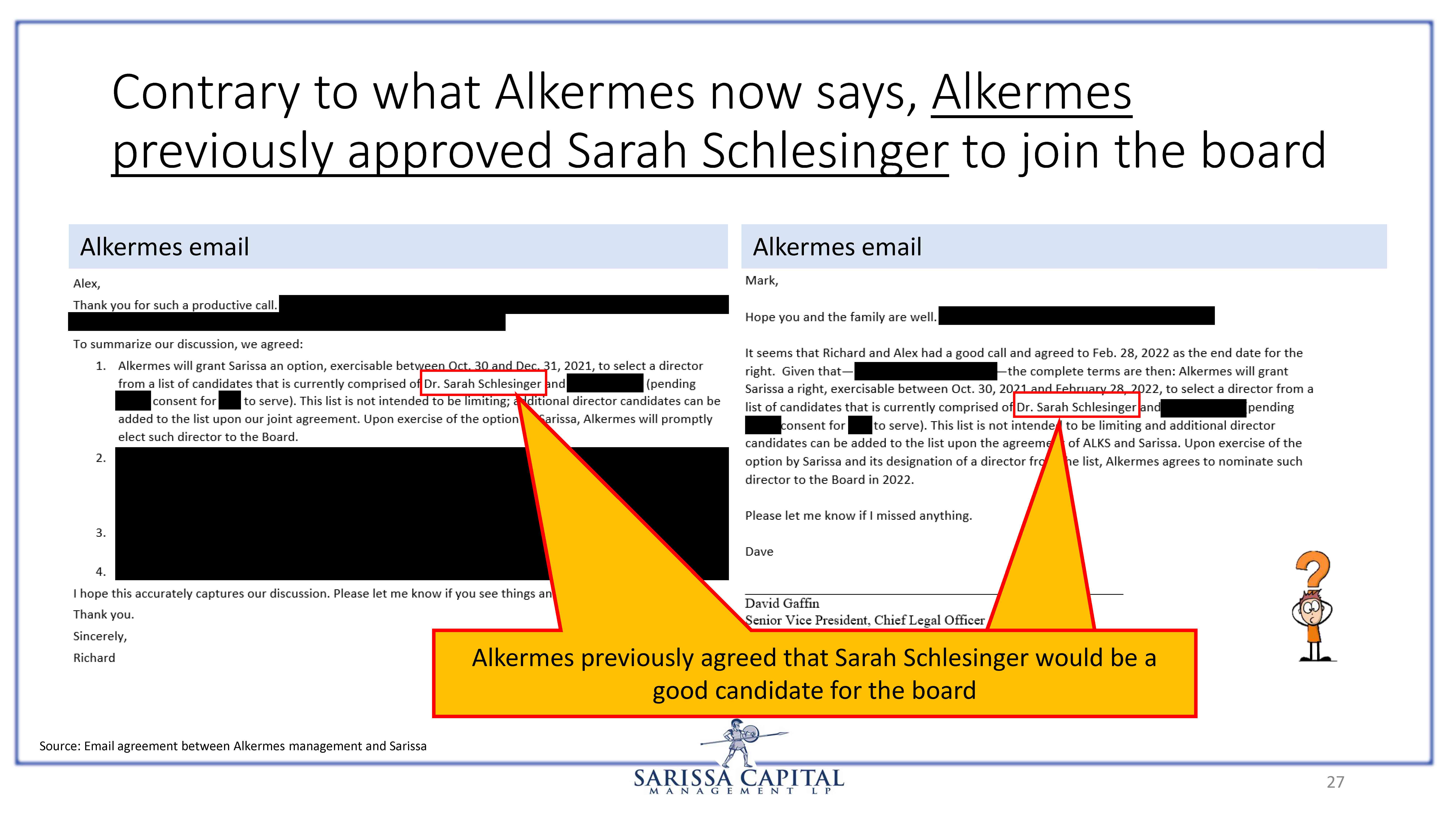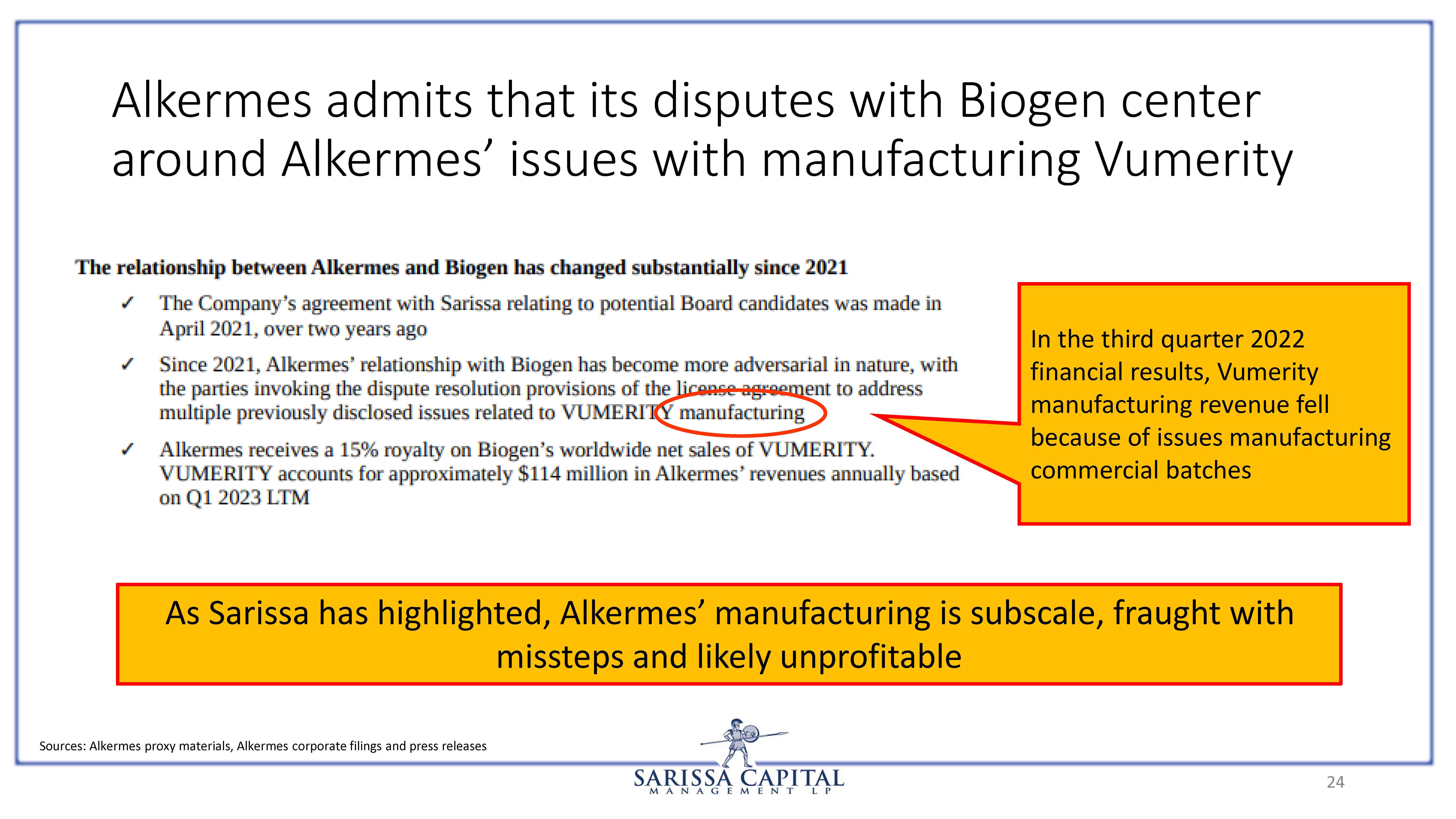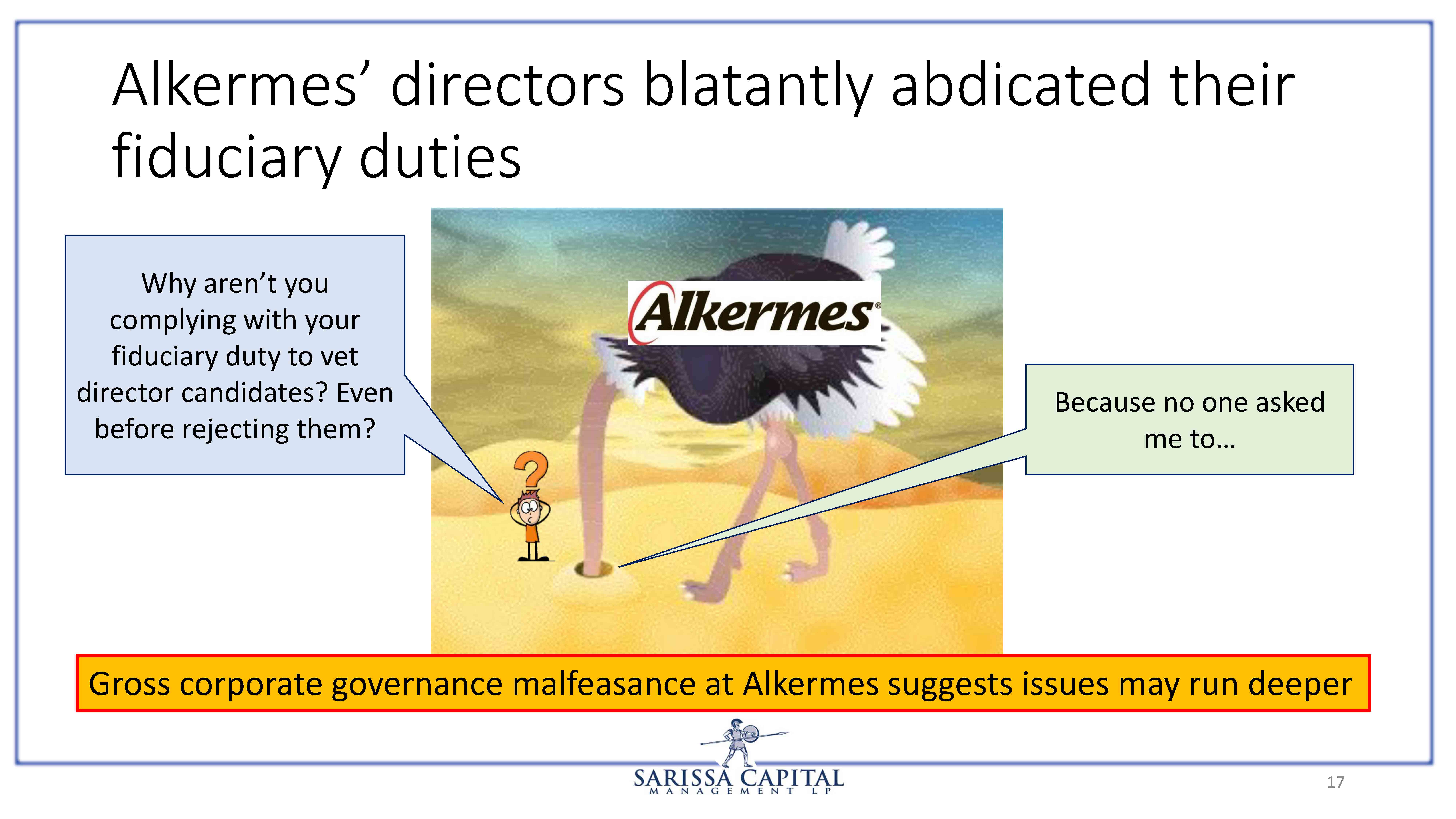 Sarissa believes Chairman and CEO Richard Pops will never run Alkermes for the benefit