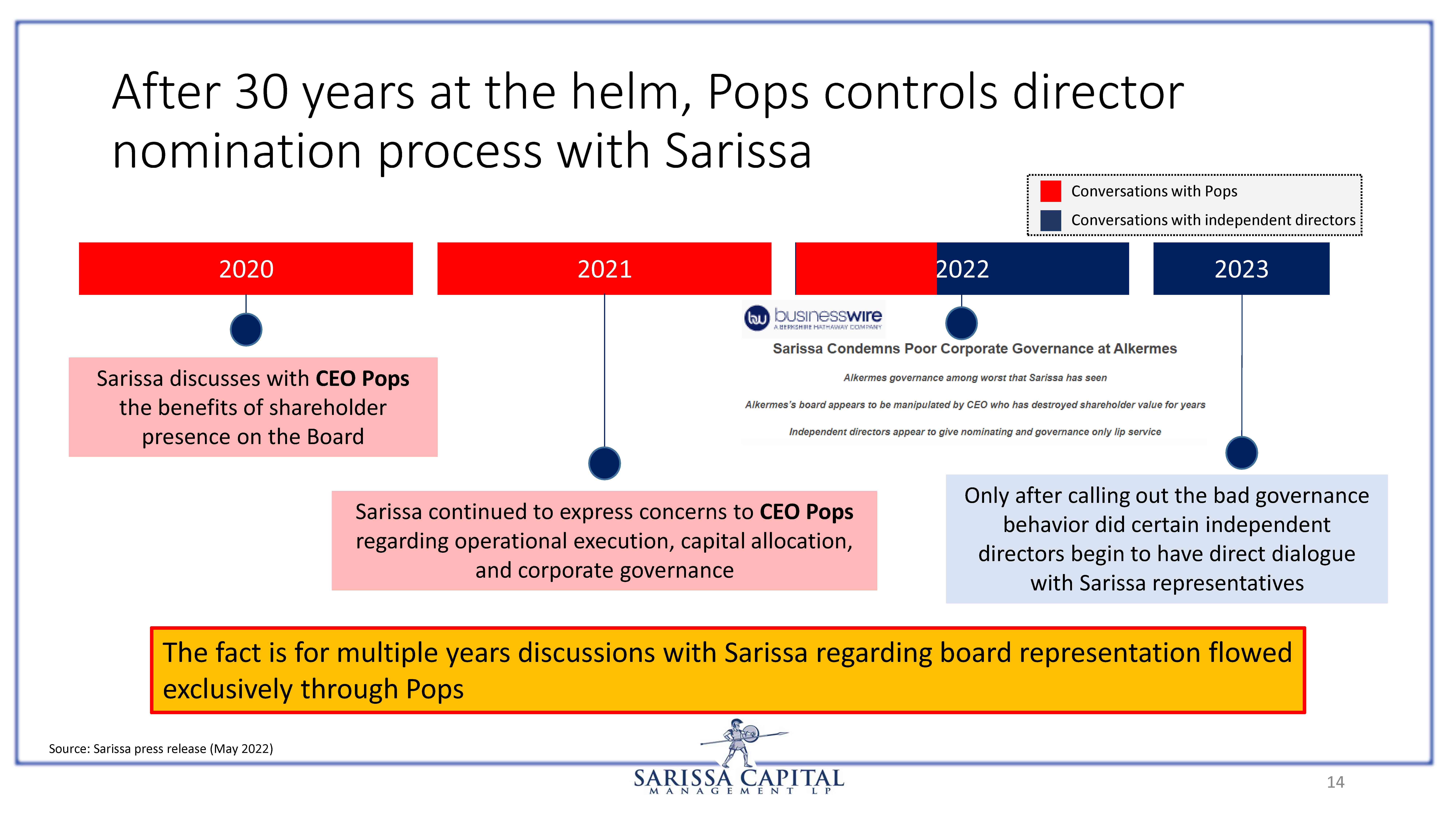 Sarissa believes Chairman and CEO Richard Pops wants to prevent accountability and