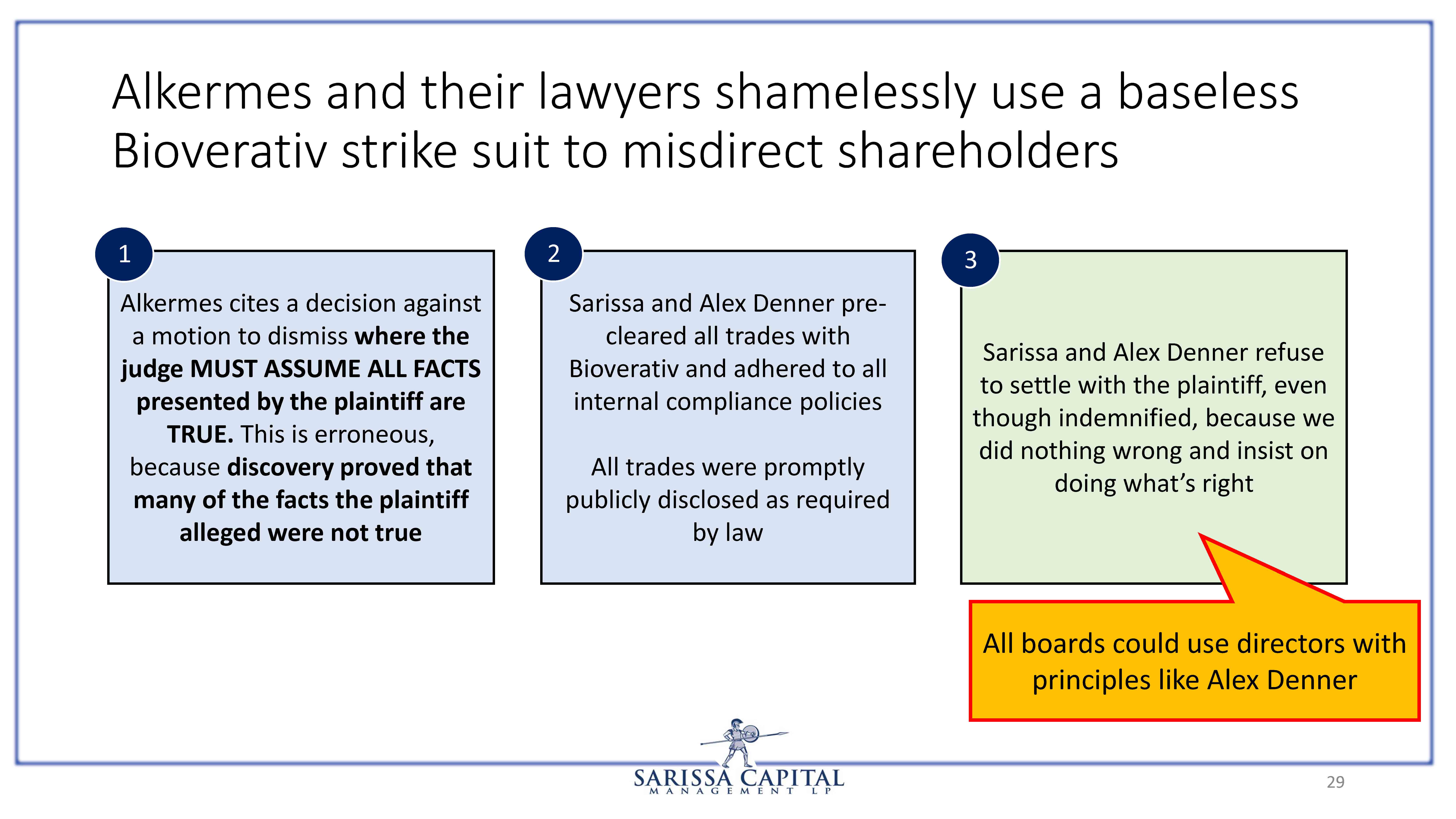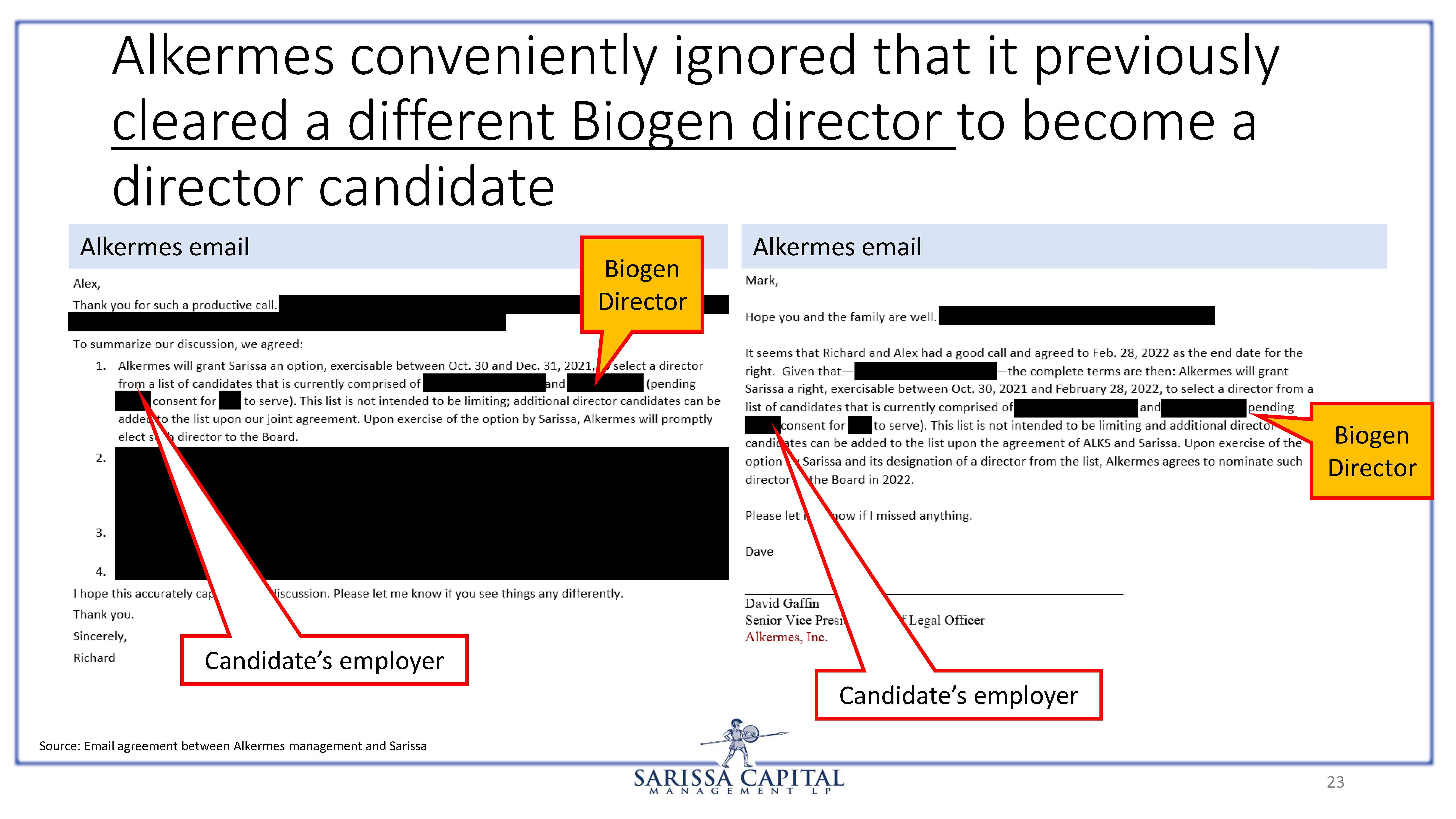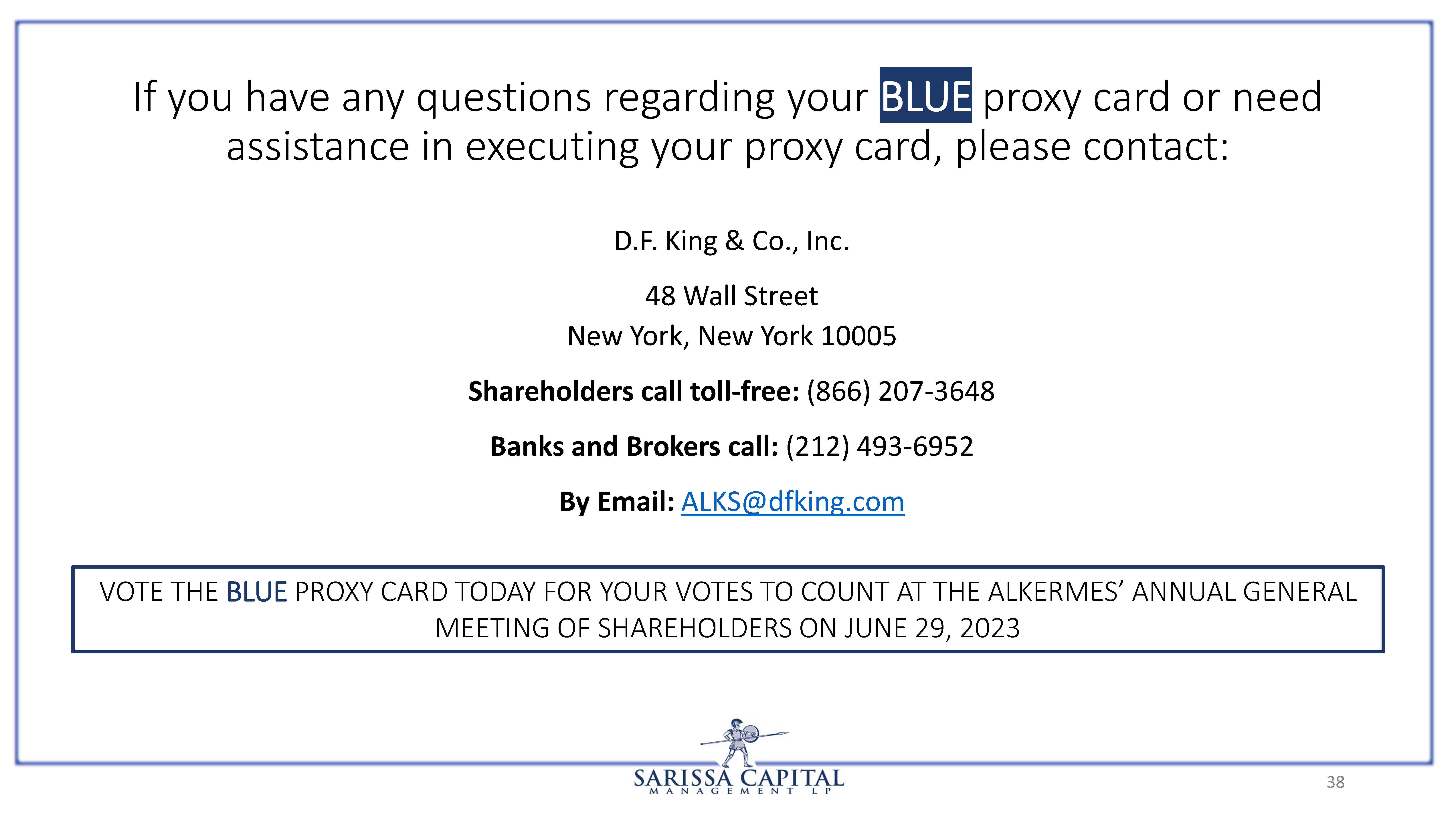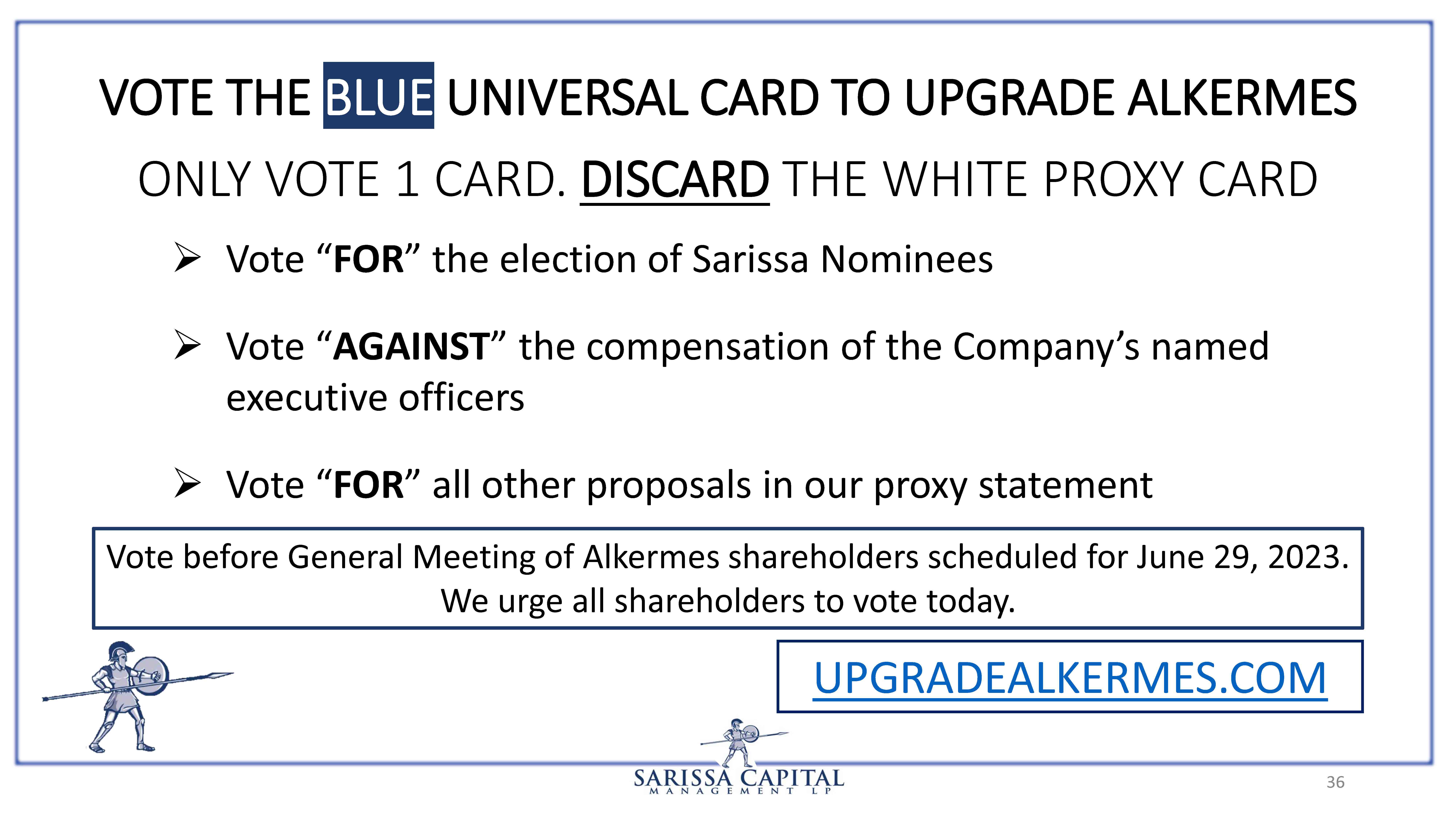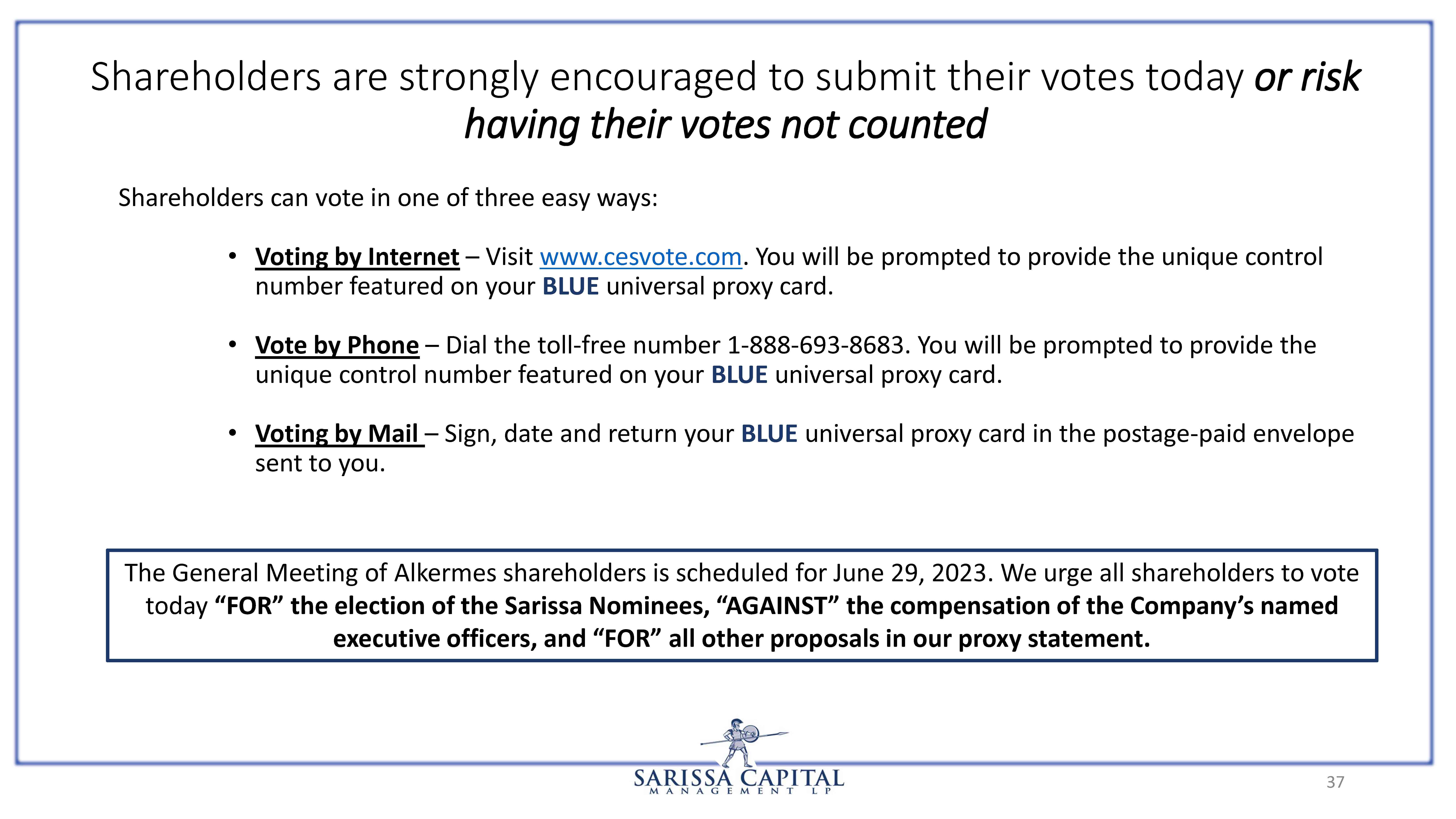Your vote at Alkermes' Annual General Meeting of Shareholders on June 29, 2023 is very important. We urge all shareholders to vote "FOR" the election of the Sarissa Nominees, “AGAINST” the compensation of the Company’s named executive officers, and "FOR" all other proposals in our proxy statement.