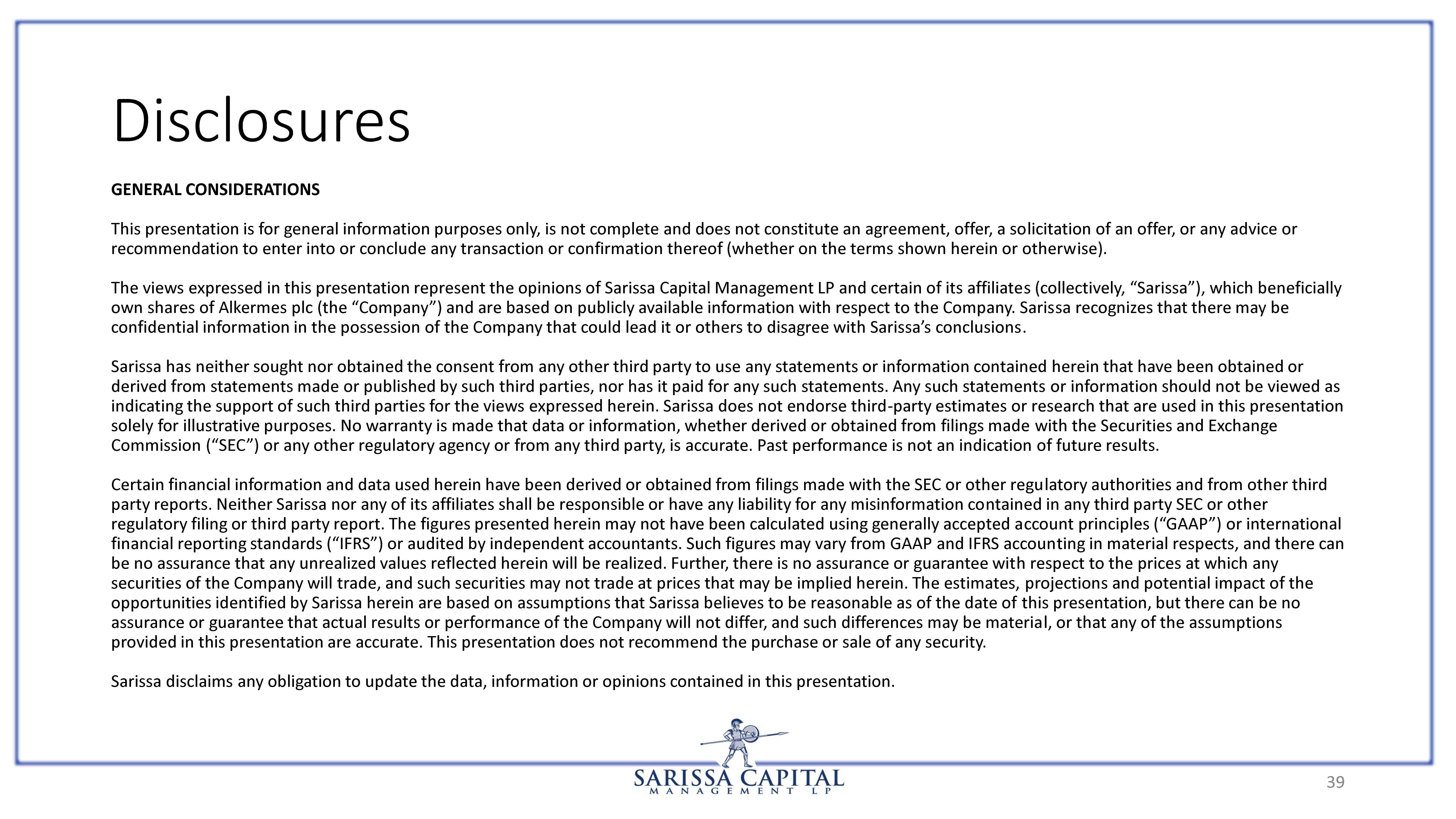 This filing also contains materials posted by Sarissa Capital to www.upgradealkermes.com in connection with the press release.