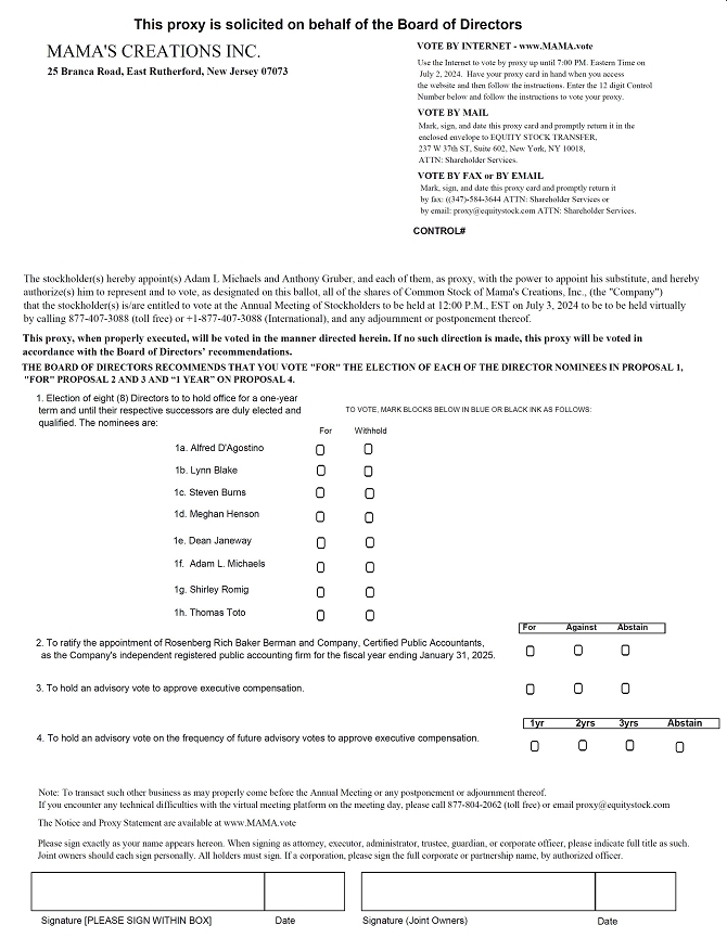 You are cordially invited to attend the Annual Meeting of Stockholders (the “Annual Meeting”) of Mama’s Creations, Inc., a Nevada corporation (together with its subsidiaries, “Company”, “Mama’s Creations”, “we”, “us” or “our”), which will be held on July 3, 2024, at 12:00 P.M. Eastern. The Annual Meeting will be a virtual meeting to be held as a listen-only conference call by calling 877-407-3088 (Toll Free). There will not be a physical meeting location. If you encounter any technical difficulties with the virtual meeting platform on the meeting day, please call 877-804-2062 (toll free) or email proxy@equitystock.com The meeting will be held for the following purposes: