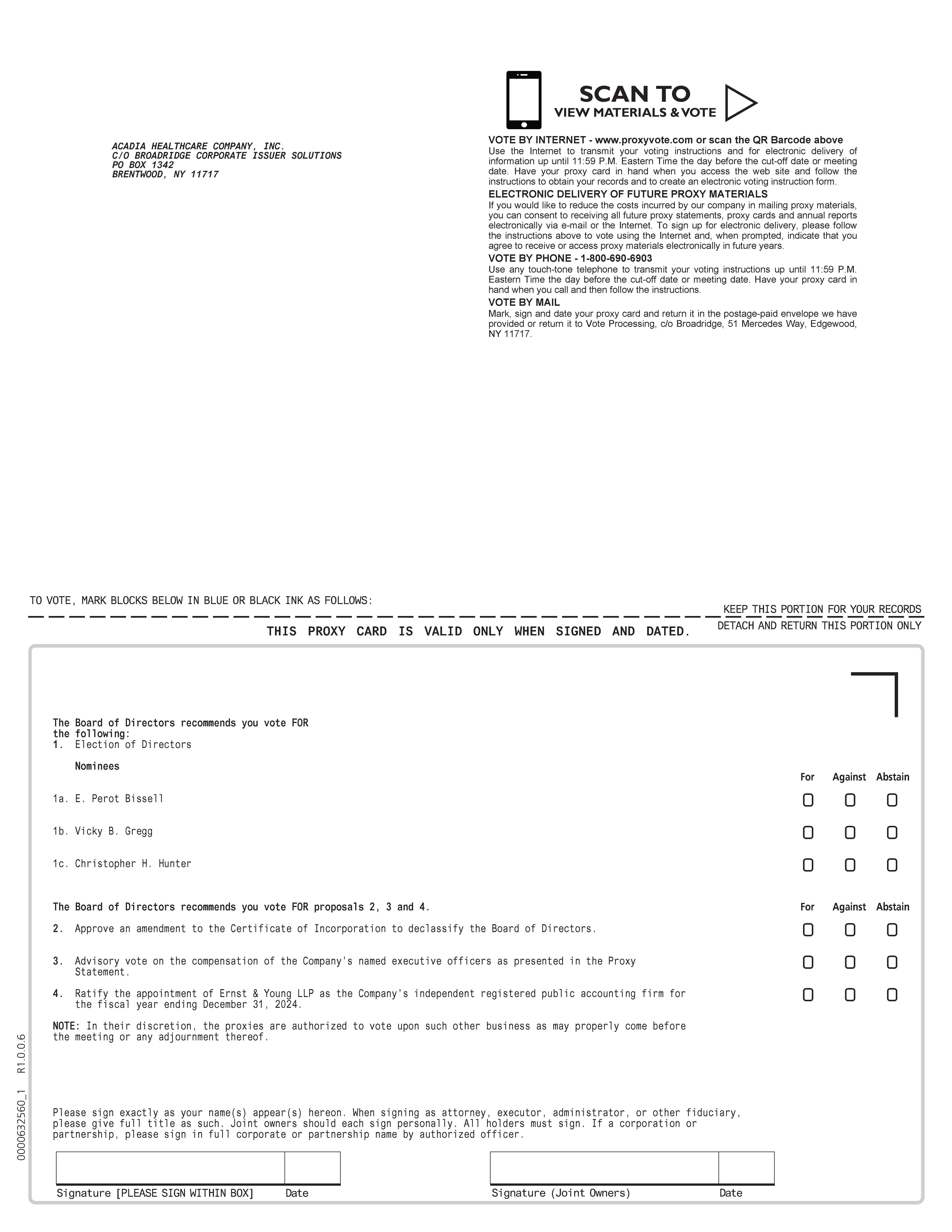 You are cordially invited to attend the 2024 Annual Meeting of Stockholders (the “Annual Meeting”) of Acadia Healthcare Company, Inc., to be held on Thursday, May 23, 2024, at 9:00 a.m. (Central Time), at our executive offices located at 6100 Tower Circle, Suite 1000, Franklin, Tennessee 37067. The matters to be acted upon at the Annual Meeting are more fully described in the accompanying Proxy Statement and related materials.