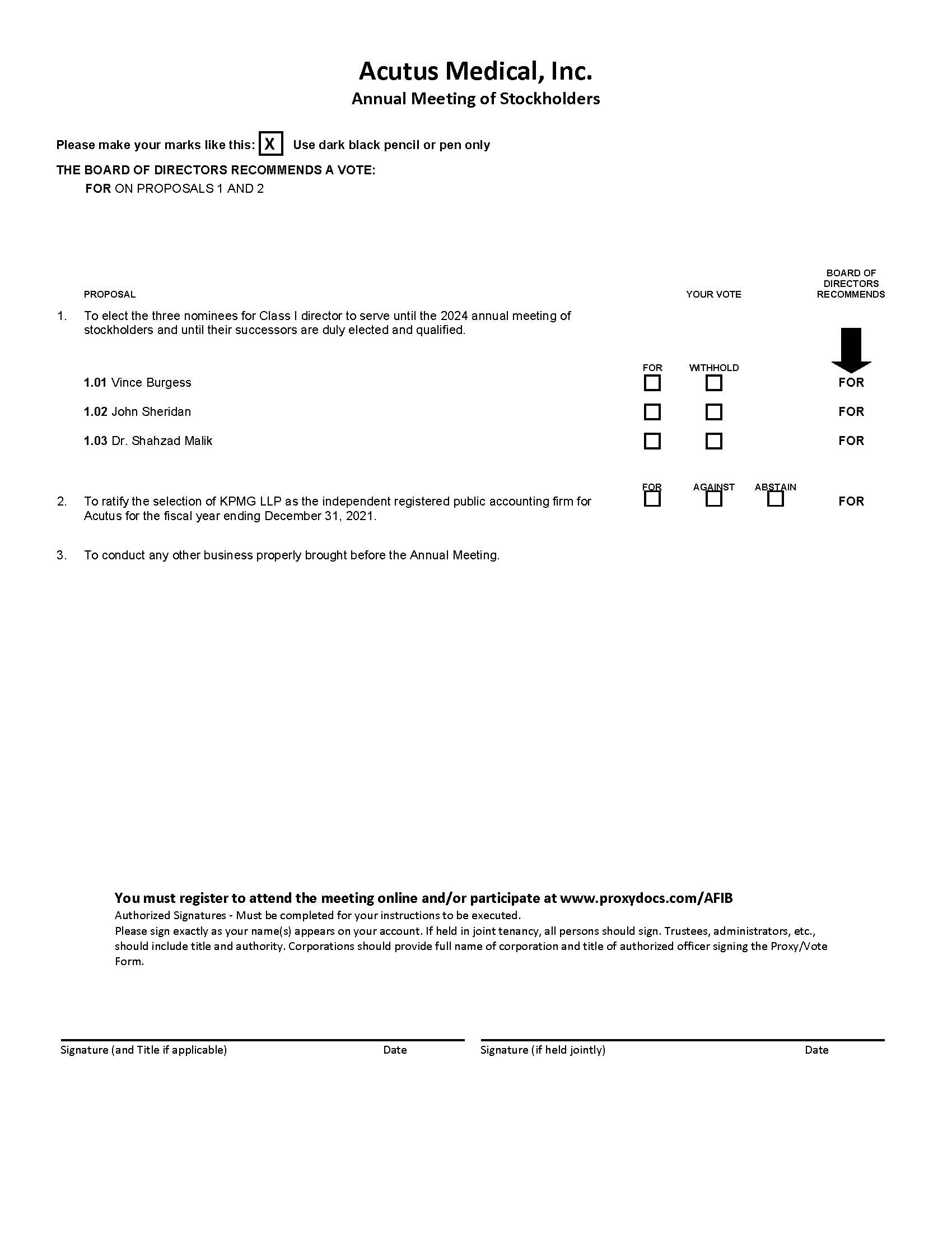 Acutus Medical, Inc. Annual Meeting of Stockholders Please make your marks like this: Use dark black pencil or pen only THE BOARD OF DIRECTORS RECOMMENDS A VOTE: FOR ON PROPOSALS 1 AND 2 PROPOSAL BOARD OF DIRECTORS RECOMMENDS YOUR VOTE To elect the three nominees for Class I director to serve until the 2024 annual meeting of stockholders and until their successors are duly elected and qualified. 1. Vince Burgess 1.01 John Sheridan 1.02 Dr. Shahzad Malik 1.03 FOR WITHHOLD FOR FOR FOR FOR AGAINST ABSTAIN FOR 2. To ratify the selection of KPMG LLP as the independent registered public accounting firm for Acutus for the fiscal year ending December 31, 2021. 3. To conduct any other business properly brought before the Annual Meeting. You must register to attend the meeting online and/or participate at www.proxydocs.com/AFIB Authorized Signatures - Must be completed for your instructions to be executed. Please sign exactly as your name(s) appears on your account. If held in joint tenancy, all persons should sign. Trustees, administrators, etc., should include title and authority. Corporations should provide full name of corporation and title of authorized officer signing the Proxy/Vote Form. Signature (and Title if applicable) Date Signature (if held jointly) Date
