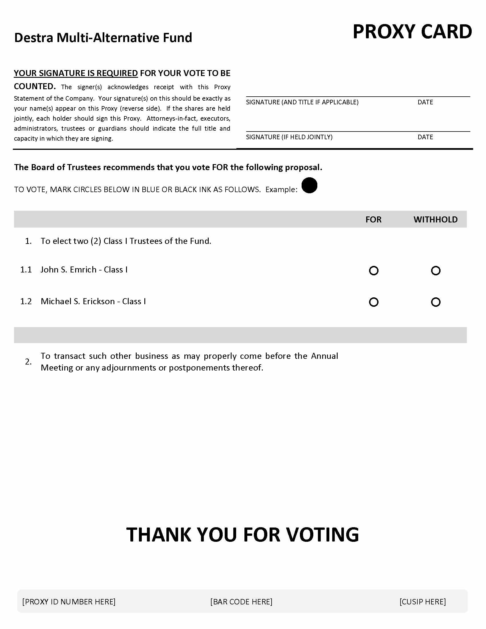 In light of the COVID-19 pandemic, the Fund is urging all stockholders to take advantage of voting by proxy. Additionally, while the Meeting is anticipated to occur as-planned, there is a possibility that, due to the COVID-19 pandemic, the Meeting may be postponed or the location or approach may need to be changed, including the possibility of holding the Meeting via remote communications for the health and safety of all Meeting participants. Should this occur, the Fund will publicly announce the decision to do so in advance and will provide details on how stockholders may participate in the alternative meeting. Any announcement will also be posted to the Fund’s website, destracapital.com, following release. If you plan to attend the Meeting in person, please note that the Meeting will be held in accordance with any recommended and required social distancing and safety guidelines, as applicable.