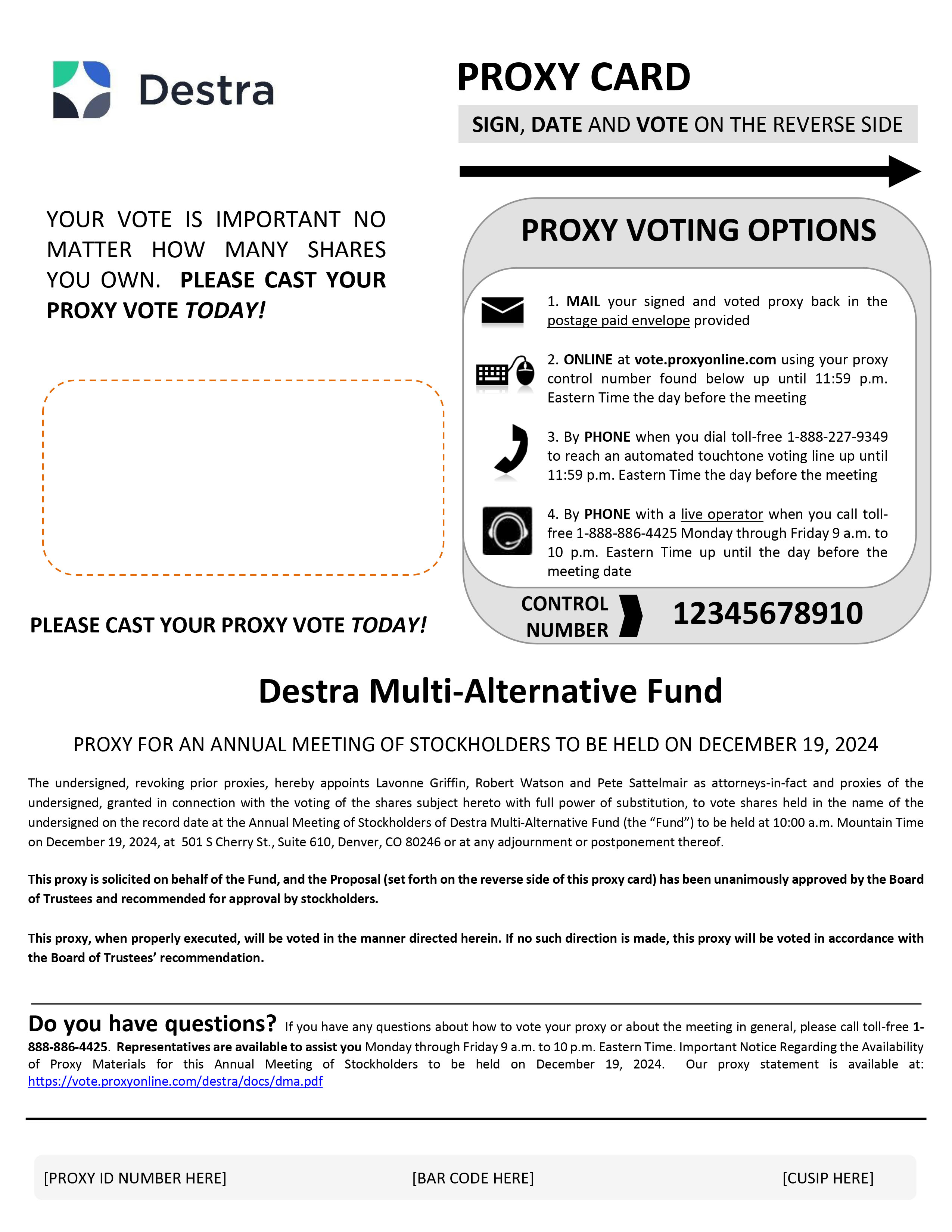 1. MAIL your signed and voted proxy back in the postage paid envelope provided 2. ONLINE at vote.proxyonline.com using your proxy control number found below up until 11:59 p.m. Eastern Time the day before the meeting 3. By PHONE when you dial toll-free 1-888-227-9349 to reach an automated touchtone voting line up until 11:59 p.m. Eastern Time the day before the meeting 4. By PHONE with a live operator when you call toll-free 1-888-886-4425 Monday through Friday 9 a.m. to 10 p.m. Eastern Time up until the day before the meeting dateDestra Multi-Alternative FundPROXY FOR AN ANNUAL MEETING OF STOCKHOLDERS TO BE HELD ON DECEMBER 19, 2024The undersigned, revoking prior proxies, hereby appoints Lavonne Griffin, Robert Watson and Pete Sattelmair as attorneys-in-fact and proxies of the undersigned, granted in connection with the voting of the shares subject hereto with full power of substitution, to vote shares held in the name of the undersigned on the record date at the Annual Meeting of Stockholders of Destra Multi-Alternative Fund (the “Fund”) to be held at 10:00 a.m. Mountain Time on December 19, 2024, at 501 S Cherry St., Suite 610, Denver, CO 80246 or at any adjournment or postponement thereof.This proxy is solicited on behalf of the Fund, and the Proposal (set forth on the reverse side of this proxy card) has been unanimously approved by the Board of Trustees and recommended for approval by stockholders.This proxy, when properly executed, will be voted in the manner directed herein. If no such direction is made, this proxy will be voted in accordance with the Board of Trustees’ recommendation.Do you have questions? If you have any questions about how to vote your proxy or about the meeting in general, please call toll-free 1-888-886-4425. Representatives are available to assist you Monday through Friday 9 a.m. to 10 p.m. Eastern Time. Important Notice Regarding the Availability of Proxy Materials for this Annual Meeting of Stockholders to be held on December 19, 2024. Our proxy statement is available at: https://vote.proxyonline.com/destra/docs/dma.pdf [PROXY ID NUMBER HERE] [BAR CODE HERE] [CUSIP HERE]