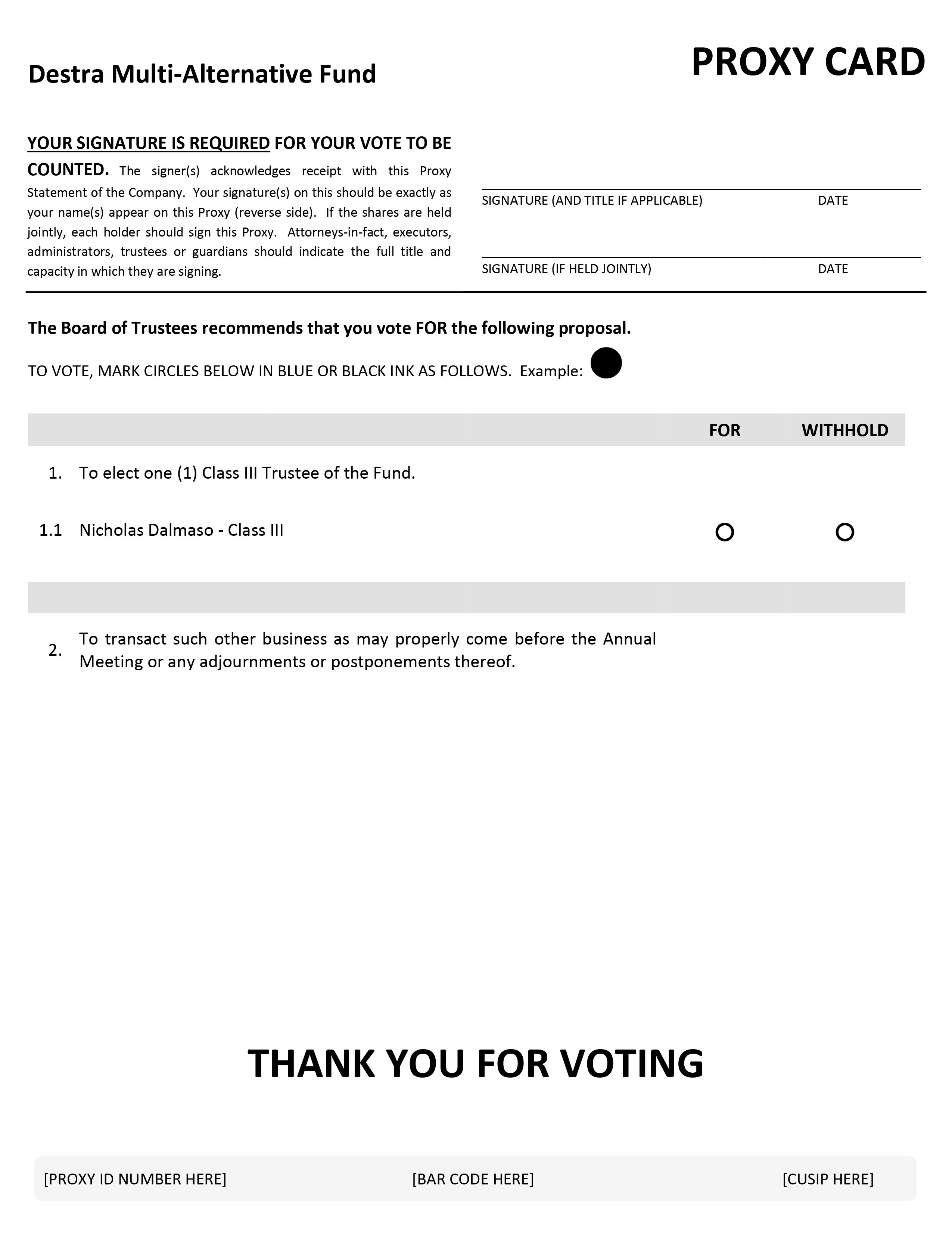 Destra Multi-Alternative FundThe Board of Trustees recommends that you vote FOR the following proposal. TO VOTE, MARK CIRCLES BELOW IN BLUE OR BLACK INK AS FOLLOWS. Example: ●FOR WITHHOLD 1. To elect one (1) Class III Trustee of the Fund. 1.1 Nicholas Dalmaso - Class III ○ ○2. To transact such other business as may properly come before the Annual Meeting or any adjournments or postponements thereof.THANK YOU FOR VOTING