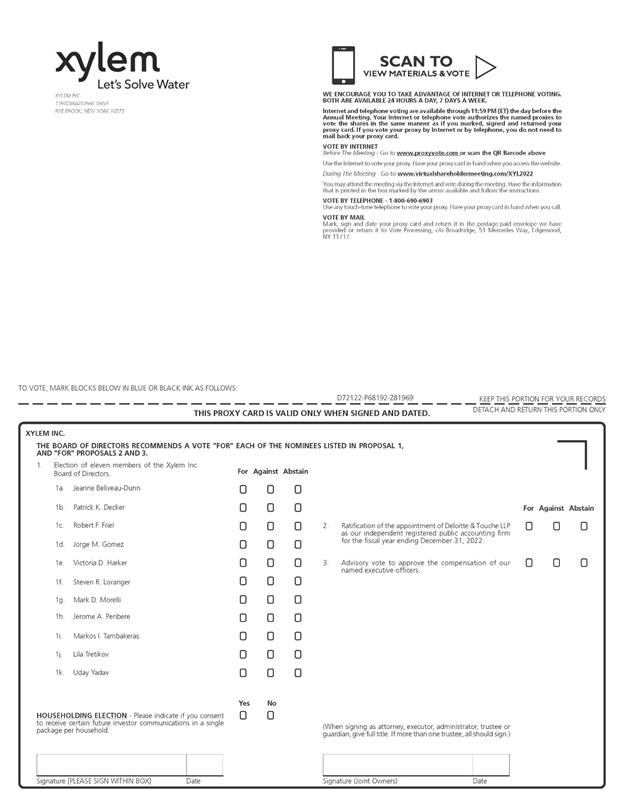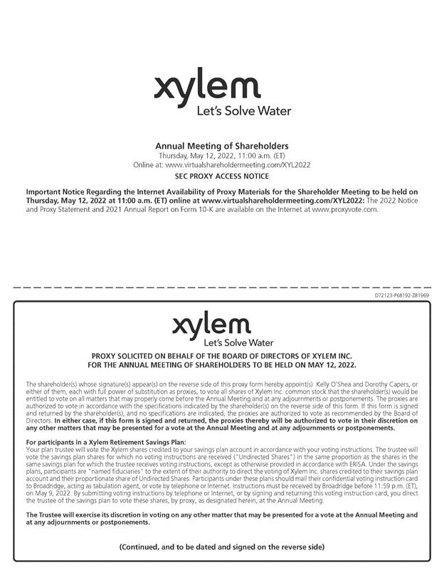 Annual Meeting of Shareholders Thursday, May 12, 2022, 11:00 a.m. (ET) Online at: www.virtualshareholdermeeting.com/XYL2022 SEC PROXY ACCESS NOTICE Important Notice Regarding the Internet Availability of Proxy Materials for the Shareholder Meeting to be held on Thursday, May 12, 2022 at 11:00 a.m. (ET) online at www.virtualshareholdermeeting.com/XYL2022: The 2022 Notice and Proxy Statement and 2021 Annual Report on Form 10-K are available on the Internet at www.proxyvote.com. D72123-P68192-Z81969 PROXY SOLICITED ON BEHALF OF THE BOARD OF DIRECTORS OF XYLEM INC. FOR THE ANNUAL MEETING OF SHAREHOLDERS TO BE HELD ON MAY 12, 2022. The shareholder(s) whose signature(s) appear(s) on the reverse side of this proxy form hereby appoint(s) Kelly O'Shea and Dorothy Capers, or either of them, each with full power of substitution as proxies, to vote all shares of Xylem Inc. common stock that the shareholder(s) would be entitled to vote on all matters that may properly come before the Annual Meeting and at any adjournments or postponements. The proxies are authorized to vote in accordance with the specifications indicated by the shareholder(s) on the reverse side of this form. If this form is signed and returned by the shareholder(s), and no specifications are indicated, the proxies are authorized to vote as recommended by the Board of Directors. In either case, if this form is signed and returned, the proxies thereby will be authorized to vote in their discretion on any other matters that may be presented for a vote at the Annual Meeting and at any adjournments or postponements. For participants in a Xylem Retirement Savings Plan: Your plan trustee will vote the Xylem shares credited to your savings plan account in accordance with your voting instructions. The trustee will vote the savings plan shares for which no voting instructions are received ("Undirected Shares") in the same proportion as the shares in the same savings plan for which the trustee receives voting instructions, except as otherwise provided in accordance with ERISA. Under the savings plans, participants are "named fiduciaries" to the extent of their authority to direct the voting of Xylem Inc. shares credited to their savings plan account and their proportionate share of Undirected Shares. Participants under these plans should mail their confidential voting instruction card to Broadridge, acting as tabulation agent, or vote by telephone or Internet. Instructions must be received by Broadridge before 11:59 p.m. (ET), on May 9, 2022. By submitting voting instructions by telephone or Internet, or by signing and returning this voting instruction card, you direct the trustee of the savings plan to vote these shares, by proxy, as designated herein, at the Annual Meeting. The Trustee will exercise its discretion in voting on any other matter that may be presented for a vote at the Annual Meeting and at any adjournments or postponements. (Continued, and to be dated and signed on the reverse side)