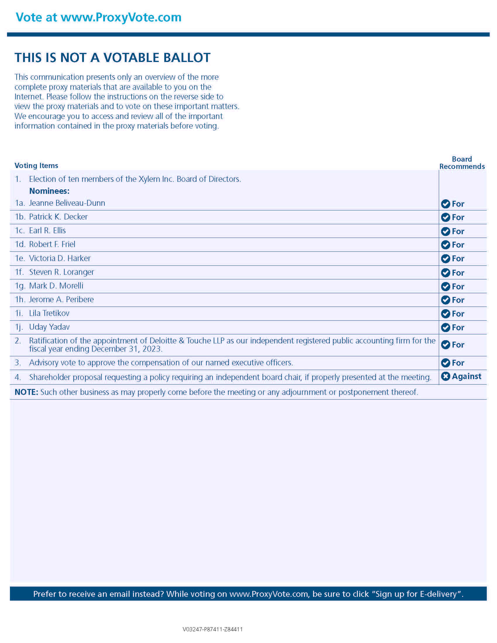 Vote at www.ProxyVote.com THIS IS NOT A VOTABLE BALLOT This communication presents only an overview of the more complete proxy materials that are available to you on the Internet. Please follow the instructions on the reverse side to view the proxy materials and to vote on these important matters. We encourage you to access and review all of the important information contained in the proxy materials before voting. Voting Items Board Recommends 1.Election of ten members of the Xylem Inc. Board of Directors. Nominees: 1a.Jeanne Beliveau-DunnFor1b.Patrick K. DeckerFor1c.Earl R. EllisFor1d.Robert F. FrielFor1e.Victoria D. HarkerFor1f.Steven R. LorangerFor1g.Mark D. MorelliFor1h.Jerome A. PeribereFor1i.Lila TretikovFor1j.Uday YadavFor2.Ratification of the appointment of Deloitte & Touche LLP as our independent registered public accounting firm for the fiscal year ending December 31, 2023.For3.Advisory vote to approve the compensation of our named executive officers.For4.Shareholder proposal requesting a policy requiring an independent board chair, if properly presented at the meeting.Against NOTE: Such other business as may properly come before the meeting or any adjournment or postponement thereof. Prefer to receive an email instead? While voting on www.ProxyVote.com, be sure to click “Sign up for E-delivery”. V03247-P87411-Z84411