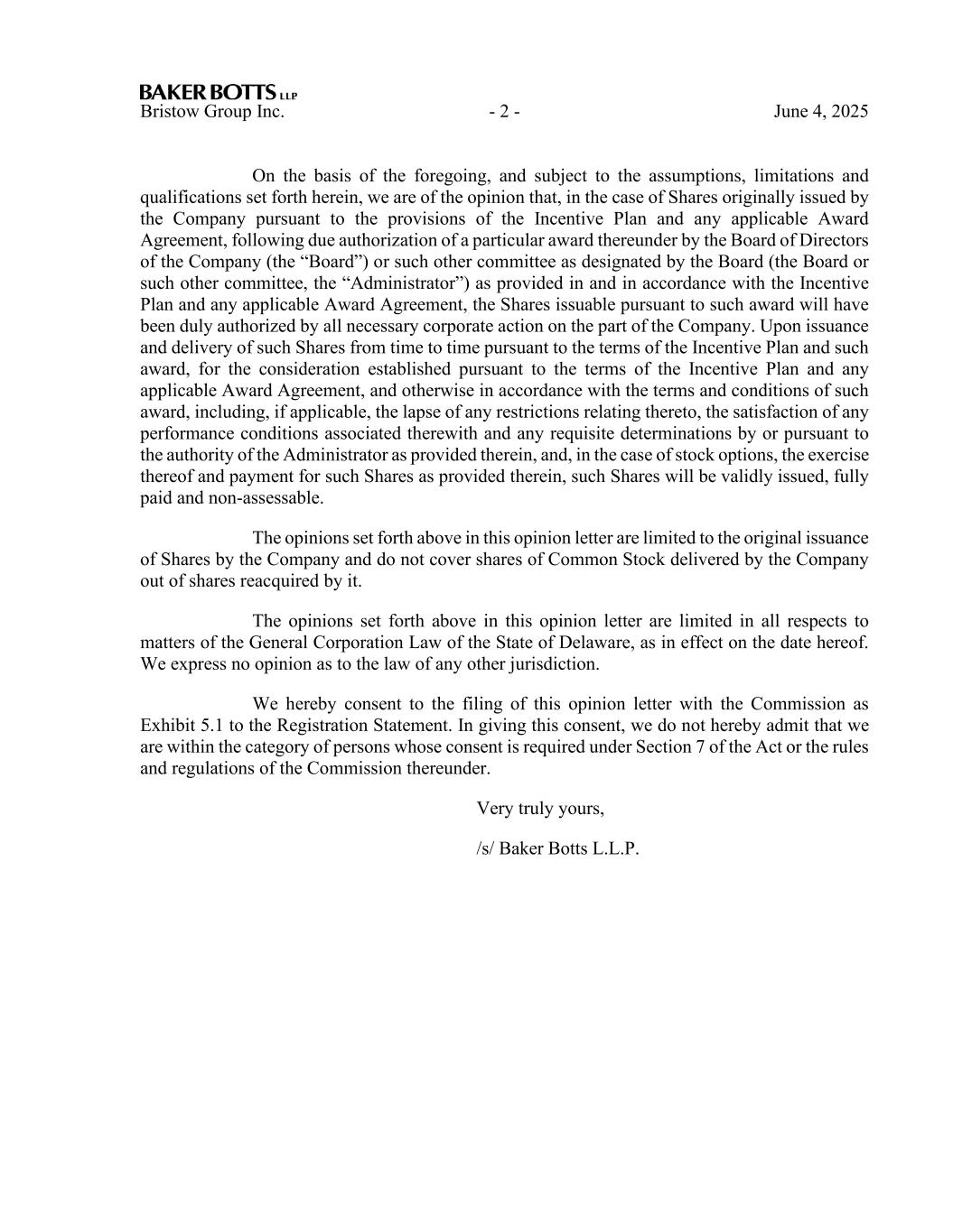 Bristow Group Inc. - 2 - June 4, 2025 On the basis of the foregoing, and subject to the assumptions, limitations and qualifications set forth herein, we are of the opinion that, in the case of Shares originally issued by the Company pursuant to the provisions of the Incentive Plan and any applicable Award Agreement, following due authorization of a particular award thereunder by the Board of Directors of the Company (the “Board”) or such other committee as designated by the Board (the Board or such other committee, the “Administrator”) as provided in and in accordance with the Incentive Plan and any applicable Award Agreement, the Shares issuable pursuant to such award will have been duly authorized by all necessary corporate action on the part of the Company. Upon issuance and delivery of such Shares from time to time pursuant to the terms of the Incentive Plan and such award, for the consideration established pursuant to the terms of the Incentive Plan and any applicable Award Agreement, and otherwise in accordance with the terms and conditions of such award, including, if applicable, the lapse of any restrictions relating thereto, the satisfaction of any performance conditions associated therewith and any requisite determinations by or pursuant to the authority of the Administrator as provided therein, and, in the case of stock options, the exercise thereof and payment for such Shares as provided therein, such Shares will be validly issued, fully paid and non-assessable. The opinions set forth above in this opinion letter are limited to the original issuance of Shares by the Company and do not cover shares of Common Stock delivered by the Company out of shares reacquired by it. The opinions set forth above in this opinion letter are limited in all respects to matters of the General Corporation Law of the State of Delaware, as in effect on the date hereof. We express no opinion as to the law of any other jurisdiction. We hereby consent to the filing of this opinion letter with the Commission as Exhibit 5.1 to the Registration Statement. In giving this consent, we do not hereby admit that we are within the category of persons whose consent is required under Section 7 of the Act or the rules and regulations of the Commission thereunder. Very truly yours, /s/ Baker Botts L.L.P.
