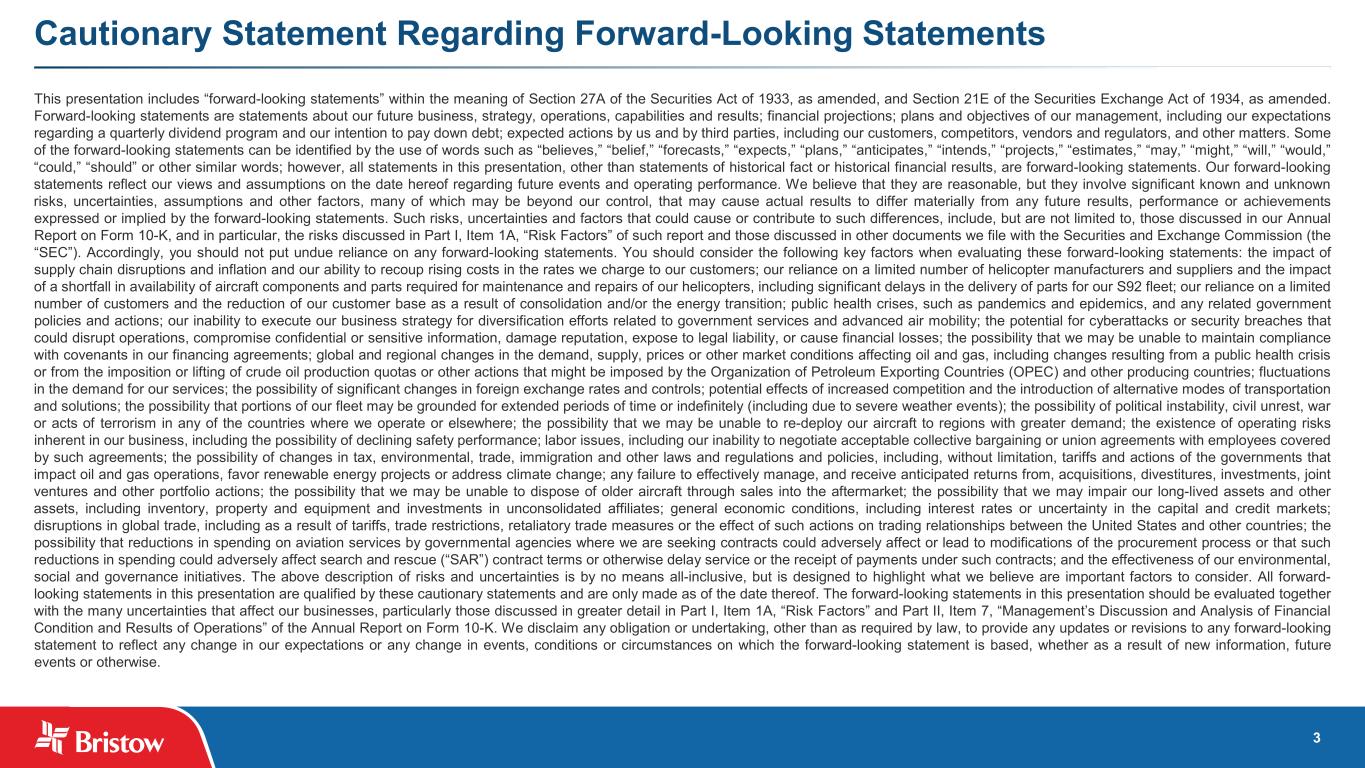 3 Cautionary Statement Regarding Forward-Looking Statements This presentation includes “forward-looking statements” within the meaning of Section 27A of the Securities Act of 1933, as amended, and Section 21E of the Securities Exchange Act of 1934, as amended. Forward-looking statements are statements about our future business, strategy, operations, capabilities and results; financial projections; plans and objectives of our management, including our expectations regarding a quarterly dividend program and our intention to pay down debt; expected actions by us and by third parties, including our customers, competitors, vendors and regulators, and other matters. Some of the forward-looking statements can be identified by the use of words such as “believes,” “belief,” “forecasts,” “expects,” “plans,” “anticipates,” “intends,” “projects,” “estimates,” “may,” “might,” “will,” “would,” “could,” “should” or other similar words; however, all statements in this presentation, other than statements of historical fact or historical financial results, are forward-looking statements. Our forward-looking statements reflect our views and assumptions on the date hereof regarding future events and operating performance. We believe that they are reasonable, but they involve significant known and unknown risks, uncertainties, assumptions and other factors, many of which may be beyond our control, that may cause actual results to differ materially from any future results, performance or achievements expressed or implied by the forward-looking statements. Such risks, uncertainties and factors that could cause or contribute to such differences, include, but are not limited to, those discussed in our Annual Report on Form 10-K, and in particular, the risks discussed in Part I, Item 1A, “Risk Factors” of such report and those discussed in other documents we file with the Securities and Exchange Commission (the “SEC”). Accordingly, you should not put undue reliance on any forward-looking statements. You should consider the following key factors when evaluating these forward-looking statements: the impact of supply chain disruptions and inflation and our ability to recoup rising costs in the rates we charge to our customers; our reliance on a limited number of helicopter manufacturers and suppliers and the impact of a shortfall in availability of aircraft components and parts required for maintenance and repairs of our helicopters, including significant delays in the delivery of parts for our S92 fleet; our reliance on a limited number of customers and the reduction of our customer base as a result of consolidation and/or the energy transition; public health crises, such as pandemics and epidemics, and any related government policies and actions; our inability to execute our business strategy for diversification efforts related to government services and advanced air mobility; the potential for cyberattacks or security breaches that could disrupt operations, compromise confidential or sensitive information, damage reputation, expose to legal liability, or cause financial losses; the possibility that we may be unable to maintain compliance with covenants in our financing agreements; global and regional changes in the demand, supply, prices or other market conditions affecting oil and gas, including changes resulting from a public health crisis or from the imposition or lifting of crude oil production quotas or other actions that might be imposed by the Organization of Petroleum Exporting Countries (OPEC) and other producing countries; fluctuations in the demand for our services; the possibility of significant changes in foreign exchange rates and controls; potential effects of increased competition and the introduction of alternative modes of transportation and solutions; the possibility that portions of our fleet may be grounded for extended periods of time or indefinitely (including due to severe weather events); the possibility of political instability, civil unrest, war or acts of terrorism in any of the countries where we operate or elsewhere; the possibility that we may be unable to re-deploy our aircraft to regions with greater demand; the existence of operating risks inherent in our business, including the possibility of declining safety performance; labor issues, including our inability to negotiate acceptable collective bargaining or union agreements with employees covered by such agreements; the possibility of changes in tax, environmental, trade, immigration and other laws and regulations and policies, including, without limitation, tariffs and actions of the governments that impact oil and gas operations, favor renewable energy projects or address climate change; any failure to effectively manage, and receive anticipated returns from, acquisitions, divestitures, investments, joint ventures and other portfolio actions; the possibility that we may be unable to dispose of older aircraft through sales into the aftermarket; the possibility that we may impair our long-lived assets and other assets, including inventory, property and equipment and investments in unconsolidated affiliates; general economic conditions, including interest rates or uncertainty in the capital and credit markets; disruptions in global trade, including as a result of tariffs, trade restrictions, retaliatory trade measures or the effect of such actions on trading relationships between the United States and other countries; the possibility that reductions in spending on aviation services by governmental agencies where we are seeking contracts could adversely affect or lead to modifications of the procurement process or that such reductions in spending could adversely affect search and rescue (“SAR”) contract terms or otherwise delay service or the receipt of payments under such contracts; and the effectiveness of our environmental, social and governance initiat