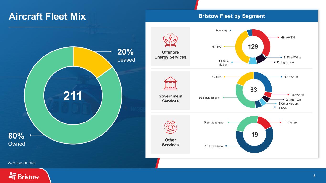 5 7% Light Twin 12% Single Engine 8% Fixed Wing / UAS 30% S92 11% AW189 26% AW139 6% Other Medium 211 Revenues by Segment(2)Aircraft Fleet(1) Revenues by Region(3) Leading Global Provider of Innovative and Sustainable Vertical Flight Solutions Presence on 6 Continents Customers in 16 Countries Publicly Traded on NYSE (VTOL) Global Employees 3,612 Total 937 Pilots 924 Engineers 68% Offshore Energy Services 8% Other Services 24% Government Services $1.4 bn 28% Americas 52% Europe 7% Asia Pacific 13% Africa $1.4 bn (1) As of June 30, 2025; see slide 16 for further details (2) Reflects LTM revenues by segment as of June 30, 2025; see slide 18 for additional details (3) Reflects LTM revenues by region as of June 30, 2025