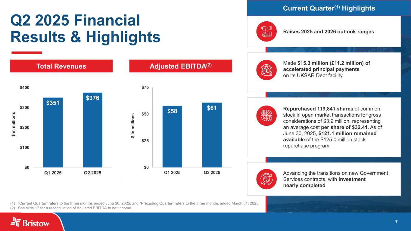 6 As of June 30, 2025 Aircraft Fleet Mix 211 20% Leased 80% Owned Bristow Fleet by Segment 17 AW189 63 4 AW139 3 Other Medium 12 S92 20 Single Engine 3 Light Twin 19 1 AW139 13 Fixed Wing 11 Light Twin 1 Fixed Wing 51 S92 129 49 AW139 11 Other Medium 6 AW189 Government Services Other Services Offshore Energy Services 5 Single Engine 4 UAS