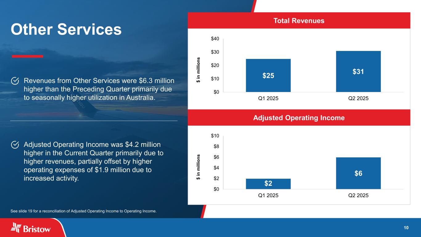 9 Government Services Total Revenues Adjusted Operating Income Revenues were $6.6 million higher in the Current Quarter primarily due to the ongoing transition of the Irish Coast Guard (“IRCG”) search and rescue contract and higher utilization in the United Kingdom Search and Rescue (“UKSAR”) contract. Adjusted Operating Income was $7.7 million lower than the Preceding Quarter primarily due to higher subcontractor costs of $5.1 million and higher personnel costs of $2.8 million related to the new Government Services contracts, unfavorable foreign exchange rate impacts of $3.0 million, higher repairs and maintenance costs of $2.0 million, and higher fuel costs of $0.6 million, offsetting the increased revenues. $14 $6 $0 $4 $8 $12 $16 Q1 2025 Q2 2025 $ in m ill io ns $86 $93 $0 $20 $40 $60 $80 $100 Q1 2025 Q2 2025 $ in m ill io ns See slide 19 for a reconciliation of Adjusted Operating Income to Operating Income.