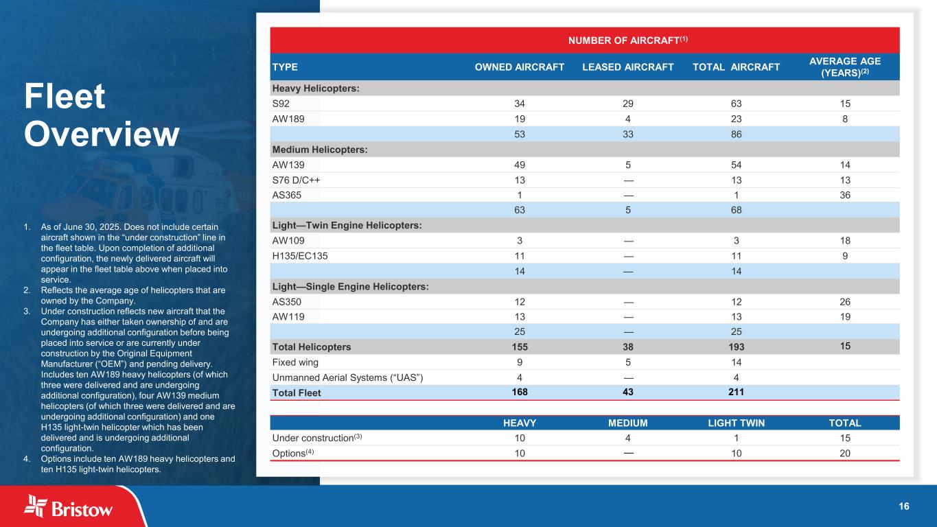 16 Fleet Overview 1. As of June 30, 2025. Does not include certain aircraft shown in the “under construction” line in the fleet table. Upon completion of additional configuration, the newly delivered aircraft will appear in the fleet table above when placed into service. 2. Reflects the average age of helicopters that are owned by the Company. 4. Options include ten AW189 heavy helicopters and ten H135 light-twin helicopters. 3. Under construction reflects new aircraft that the Company has either taken ownership of and are undergoing additional configuration before being placed into service or are currently under construction by the Original Equipment Manufacturer (“OEM”) and pending delivery. Includes ten AW189 heavy helicopters (of which three were delivered and are undergoing additional configuration), four AW139 medium helicopters (of which three were delivered and are undergoing additional configuration) and one H135 light-twin helicopter which has been delivered and is undergoing additional configuration. NUMBER OF AIRCRAFT(1) TYPE OWNED AIRCRAFT LEASED AIRCRAFT TOTAL AIRCRAFT AVERAGE AGE (YEARS)(2) Heavy Helicopters: S92 34 29 63 15 AW189 19 4 23 8 53 33 86 Medium Helicopters: AW139 49 5 54 14 S76 D/C++ 13 — 13 13 AS365 1 — 1 36 63 5 68 Light—Twin Engine Helicopters: AW109 3 — 3 18 H135/EC135 11 — 11 9 14 — 14 Light—Single Engine Helicopters: AS350 12 — 12 26 AW119 13 — 13 19 25 — 25 Total Helicopters 155 38 193 15 Fixed wing 9 5 14 Unmanned Aerial Systems (“UAS”) 4 — 4 Total Fleet 168 43 211 HEAVY MEDIUM LIGHT TWIN TOTAL Under construction(3) 10 4 1 15 Options(4) 10 — 10 20