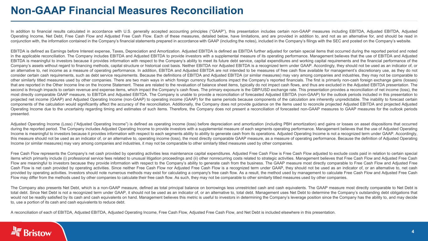 3 Cautionary Statement Regarding Forward-Looking Statements This presentation includes “forward-looking statements” within the meaning of Section 27A of the Securities Act of 1933, as amended, and Section 21E of the Securities Exchange Act of 1934, as amended. Forward-looking statements are statements about our future business, strategy, operations, capabilities and results; financial projections; plans and objectives of our management, including our expectations regarding a quarterly dividend program and our intention to pay down debt; expected actions by us and by third parties, including our customers, competitors, vendors and regulators, and other matters. Some of the forward-looking statements can be identified by the use of words such as “believes,” “belief,” “forecasts,” “expects,” “plans,” “anticipates,” “intends,” “projects,” “estimates,” “may,” “might,” “will,” “would,” “could,” “should” or other similar words; however, all statements in this presentation, other than statements of historical fact or historical financial results, are forward-looking statements. Our forward-looking statements reflect our views and assumptions on the date hereof regarding future events and operating performance. We believe that they are reasonable, but they involve significant known and unknown risks, uncertainties, assumptions and other factors, many of which may be beyond our control, that may cause actual results to differ materially from any future results, performance or achievements expressed or implied by the forward-looking statements. Such risks, uncertainties and factors that could cause or contribute to such differences, include, but are not limited to, those discussed in our Annual Report on Form 10-K, and in particular, the risks discussed in Part I, Item 1A, “Risk Factors” of such report and those discussed in other documents we file with the Securities and Exchange Commission (the “SEC”). Accordingly, you should not put undue reliance on any forward-looking statements. You should consider the following key factors when evaluating these forward-looking statements: the impact of supply chain disruptions and inflation and our ability to recoup rising costs in the rates we charge to our customers; our reliance on a limited number of helicopter manufacturers and suppliers and the impact of a shortfall in availability of aircraft components and parts required for maintenance and repairs of our helicopters, including significant delays in the delivery of parts for our S92 and AW189 fleet and aircraft in general; our reliance on a limited number of customers and the reduction of our customer base as a result of consolidation and/or the energy transition; public health crises, such as pandemics and epidemics, and any related government policies and actions; our inability to execute our business strategy for diversification efforts related to government services and advanced air mobility; the potential effects of the ongoing U.S. government shutdown on our Government Services business; the potential for cyberattacks or security breaches that could disrupt operations, compromise confidential or sensitive information, damage reputation, expose to legal liability, or cause financial losses; the possibility that we may be unable to maintain compliance with covenants in our financing agreements; global and regional changes in the demand, supply, prices or other market conditions affecting oil and gas, including changes resulting from a public health crisis or from the imposition or lifting of crude oil production quotas or other actions that might be imposed by the Organization of Petroleum Exporting Countries (OPEC) and other producing countries; fluctuations in the demand for our services; the possibility of significant changes in foreign exchange rates and controls; potential effects of increased competition and the introduction of alternative modes of transportation and solutions; the possibility that portions of our fleet may be grounded for extended periods of time or indefinitely (including due to severe weather events); the possibility of political instability, civil unrest, war or acts of terrorism in any of the countries where we operate or elsewhere; the possibility that we may be unable to re-deploy our aircraft to regions with greater demand; the existence of operating risks inherent in our business, including the possibility of declining safety performance; labor issues, including our inability to negotiate acceptable collective bargaining or union agreements with employees covered by such agreements; the possibility of changes in tax, environmental, trade, immigration and other laws and regulations and policies, including, without limitation, tariffs and actions of the governments that impact oil and gas operations, favor renewable energy projects or address climate change; any failure to effectively manage, and receive anticipated returns from, acquisitions, divestitures, investments, joint ventures and other portfolio actions; the possibility that we may be unable to dispose of older aircraft through sales into the aftermarket; the possibility that we may impair our long-lived assets and other assets, including inventory, property and equipment and investments in unconsolidated affiliates; general economic conditions, including interest rates or uncertainty in the capital and credit markets; disruptions in global trade, including as a result of tariffs, trade restrictions, retaliatory trade measures or the effect of such actions on trading relationships between the United States and other countries; the possibility that reductions in spending on aviation services by governmental agencies where we are seeking contracts could adversely affect or lead to modifications of the procurement process or that such reductions in spending could adversely affect search and rescue (“SAR”) contract terms or otherwise del