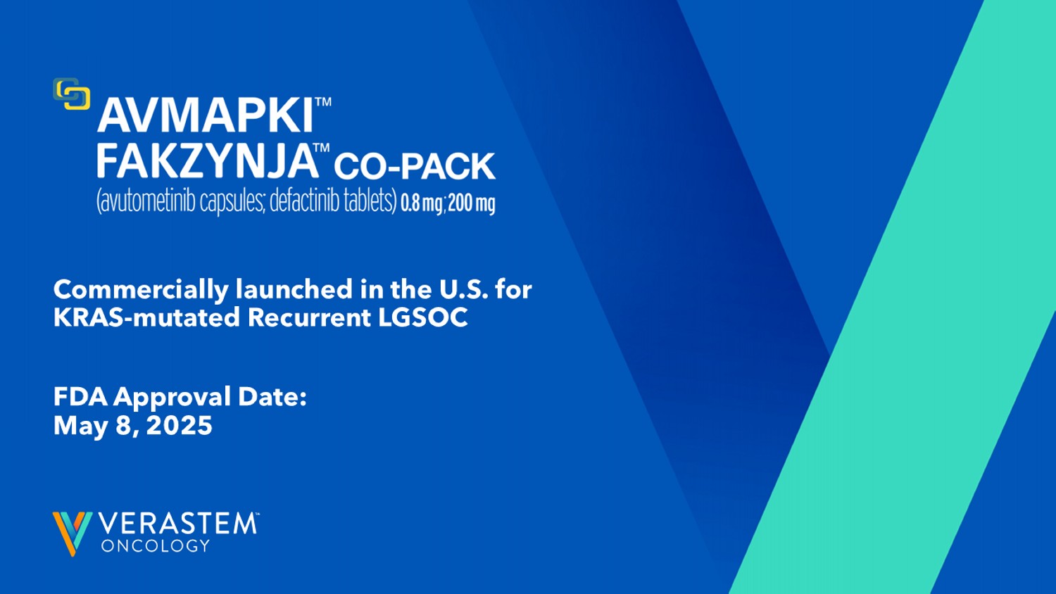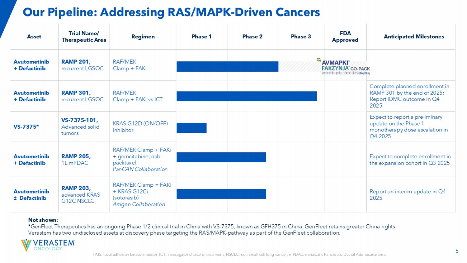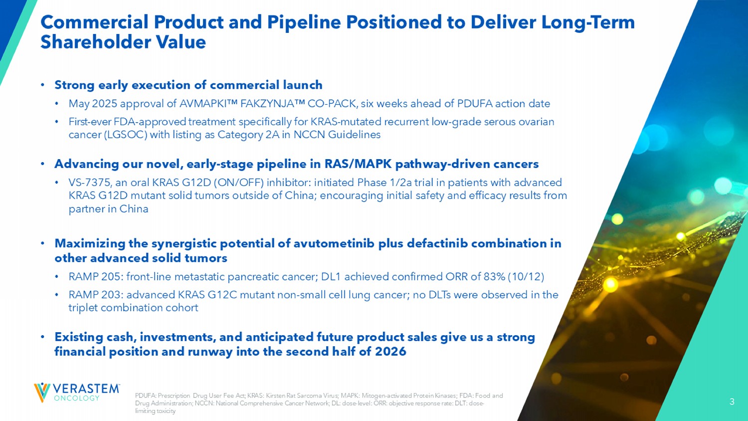 2 Forward - Looking Statements This presentation includes forward - looking statements about, among other things, Verastem Oncology’s (the “Company”) programs and product candidates, strategy, future plans and prospects, including statements relate d to the approval and commercialization of AVMAPKI FAKZYNJA CO - PACK ( avutometinib capsules; defactinib tablets) as a treatment for adult patients with KRAS - mutant recurrent Low - Grade Serous Ovarian Cancer (LGSOC), the expected outcome and benefits of collaborations, including with GenFleet Therapeutics (Shanghai), Inc. ( GenFleet ), including the conduct of a Phase 1/2a study with respect to VS - 7375 , the status of enrollments for and potential of the results of the RAMP 301 Phase 3 trial to confirm the results of the RAMP 201 study specific to KRAS mutant patients and to expand the indication regardless of KRAS mutation status, the structure of our planned and pending clinical trials, the potential cl in ical value of various of the Company's clinical trials, including the RAMP 201J, RAMP 203, RAMP 205 , RAMP 301 and VS - 7375 trials , the timing of commencing and completing trials, including topline data reports, interactions with regulators, the timeline and indications for clinical development, regulatory submissions, the potential for and timing of commercialization of product candidates and potential for additional development programs involving the Company’s l ead compound and the potential market opportunities of, and estimated addressable markets for, our drug candidates. The words "anticipate," "believe," "estimate," "expect," "may," "plan," "target," "potential," "would," "could," "should," "continue," “ca n” and similar expressions are intended to identify forward - looking statements, although not all forward - looking statements cont ain these identifying words. Each forward - looking statement is subject to risks and uncertainties that could cause actual results to diffe r materially from those expressed or implied in such statement. Applicable risks and uncertainties include the risks and uncertainties, among other things, regarding: the success in the dev elo pment and potential commercialization of our product candidates, including avutometinib in combination with other compounds, including defactinib , LUMAKRAS and others; the uncertainties inherent in research and development, such as negative or unexpected results of clin ica l trials, the occurrence or timing of applications for our product candidates that may be filed with regulatory authorities in any jurisdictions; whether and when regulatory authorities in any jurisdictions may approve any such applicati ons that may be filed for our product candidates, and, if approved, whether our product candidates will be commercially successfu l in such jurisdictions; our ability to obtain, maintain and enforce patent and other intellectual property protection for our pro duc t candidates; the scope, timing, and outcome of any legal proceedings; decisions by regulatory authorities regarding trial de sig n, labeling and other matters that could affect the timing, availability or commercial potential of our product candidates; whet her preclinical testing of our product candidates and preliminary or interim data from clinical trials will be predictive of the re sults or success of ongoing or later clinical trials; that the timing, scope and rate of reimbursement for our product candidates is u nce rtain; that the market opportunities of our drug candidates are based on internal and third - party estimates which may prove to b e incorrect; that third - party payors (including government agencies) may not reimburse; that there may be competitive developments affecting our product candidates; that data may not be available when expected; that enrollment of clinical trials may take l on ger than expected, which may delay our development programs, including delays in review by the U.S. Food and Drug Administration (FDA); the risk that our RAMP 301 trial may not confirm the results of the RAMP 201 trial specific to the use of AVMAPKI FAKZYNJA CO - PACK in adult patients with KRAS mutant recurrent LGSOC; the risks associated with preliminary and interim data, which may not be representative of more mature data, including with respect to in terim duration of therapy data; that our product candidates will cause adverse safety events and/or unexpected concerns may arise from additional data or analysis, or result in unmanageable safety profiles as compared to their levels of efficacy; that we may be unable to successfully validate, develo p a nd obtain regulatory approval for companion diagnostic tests for our product candidates that require or would commercially benef it from such tests, or experience significant delays in doing so; that the mature RAMP 201 data and associated discussions with the FDA may not support the scope of a new drug application submission for the avutometinib and defactinib combination in LGSOC including with respect to Kirsten rat sarcoma viral oncogene homolog (KRAS) wild - type (KRAS wt ); that our product candidates may experience manufacturing or supply interruptions or failures; that any of our third - party contract research organizations, c ontract manufacturing organizations, clinical sites, or contractors, among others, who we rely on fail to fully perform; that we face substantial competition, which may result in others developing or commercializing products before or more successfully than w e d o which could result in reduced market share or market potential for our product candidates; that we will be unable to successfully initiate or complete the clinical development and eventual commercialization of our product candidates; that th e d evelopment and commercialization of our product candidates will take longer or cost more than planned, including as a result of conducting additional studies or our decisions regarding execution of 