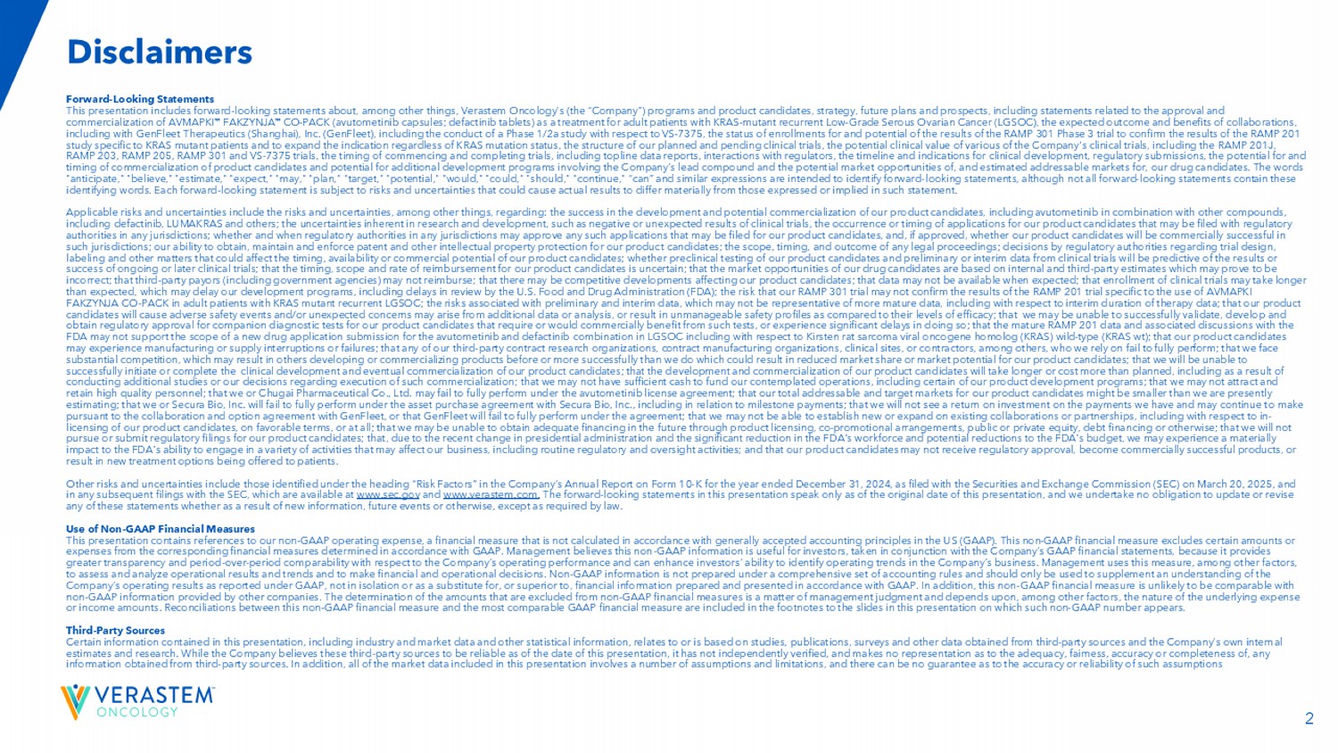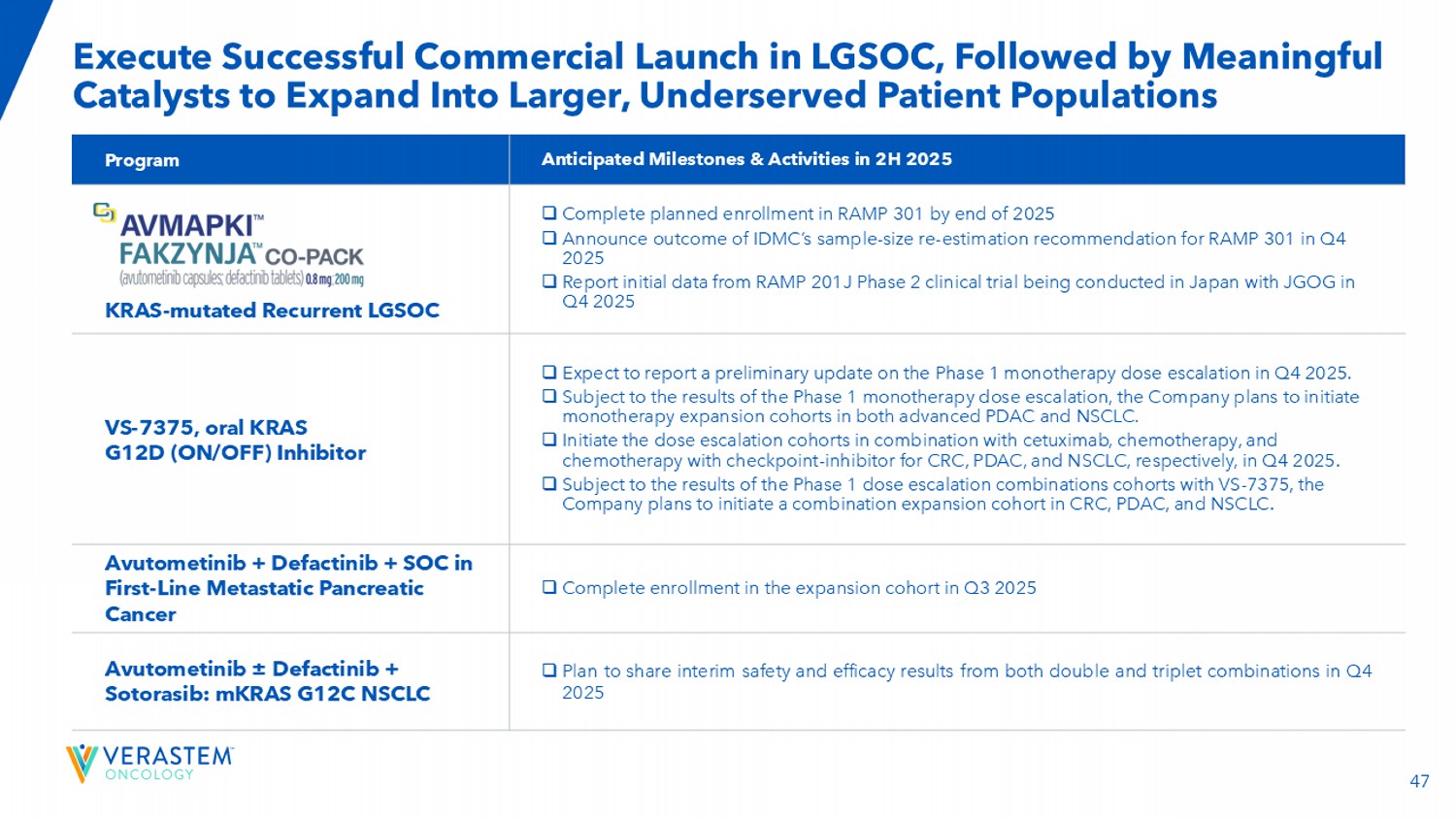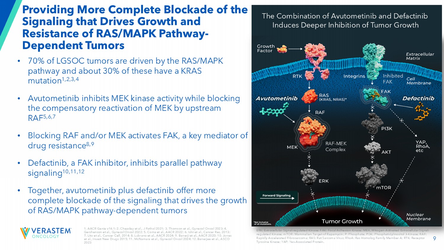 2 Forward - Looking Statements This presentation includes forward - looking statements about, among other things, Verastem Oncology’s (the “Company”) programs and product candidates, strategy, future plans and prospects, including statements relate d to the approval and commercialization of AVMAPKI FAKZYNJA CO - PACK ( avutometinib capsules; defactinib tablets) as a treatment for adult patients with KRAS - mutant recurrent Low - Grade Serous Ovarian Cancer (LGSOC), the expected outcome and benefits of collaborations, including with GenFleet Therapeutics (Shanghai), Inc. ( GenFleet ), including the conduct of a Phase 1/2a study with respect to VS - 7375 , the status of enrollments for and potential of the results of the RAMP 301 Phase 3 trial to confirm the results of the RAMP 201 study specific to KRAS mutant patients and to expand the indication regardless of KRAS mutation status, the structure of our planned and pending clinical trials, the potential cl in ical value of various of the Company's clinical trials, including the RAMP 201J, RAMP 203, RAMP 205 , RAMP 301 and VS - 7375 trials , the timing of commencing and completing trials, including topline data reports, interactions with regulators, the timeline and indications for clinical development, regulatory submissions, the potential for and timing of commercialization of product candidates and potential for additional development programs involving the Company’s l ead compound and the potential market opportunities of, and estimated addressable markets for, our drug candidates. The words "anticipate," "believe," "estimate," "expect," "may," "plan," "target," "potential," "would," "could," "should," "continue," “ca n” and similar expressions are intended to identify forward - looking statements, although not all forward - looking statements cont ain these identifying words. Each forward - looking statement is subject to risks and uncertainties that could cause actual results to diffe r materially from those expressed or implied in such statement. Applicable risks and uncertainties include the risks and uncertainties, among other things, regarding: the success in the dev elo pment and potential commercialization of our product candidates, including avutometinib in combination with other compounds, including defactinib , LUMAKRAS and others; the uncertainties inherent in research and development, such as negative or unexpected results of clin ica l trials, the occurrence or timing of applications for our product candidates that may be filed with regulatory authorities in any jurisdictions; whether and when regulatory authorities in any jurisdictions may approve any such applicati ons that may be filed for our product candidates, and, if approved, whether our product candidates will be commercially successfu l in such jurisdictions; our ability to obtain, maintain and enforce patent and other intellectual property protection for our pro duc t candidates; the scope, timing, and outcome of any legal proceedings; decisions by regulatory authorities regarding trial de sig n, labeling and other matters that could affect the timing, availability or commercial potential of our product candidates; whet her preclinical testing of our product candidates and preliminary or interim data from clinical trials will be predictive of the re sults or success of ongoing or later clinical trials; that the timing, scope and rate of reimbursement for our product candidates is u nce rtain; that the market opportunities of our drug candidates are based on internal and third - party estimates which may prove to b e incorrect; that third - party payors (including government agencies) may not reimburse; that there may be competitive developments affecting our product candidates; that data may not be available when expected; that enrollment of clinical trials may take l on ger than expected, which may delay our development programs, including delays in review by the U.S. Food and Drug Administration (FDA); the risk that our RAMP 301 trial may not confirm the results of the RAMP 201 trial specific to the use of AVMAPKI FAKZYNJA CO - PACK in adult patients with KRAS mutant recurrent LGSOC; the risks associated with preliminary and interim data, which may not be representative of more mature data, including with respect to in terim duration of therapy data; that our product candidates will cause adverse safety events and/or unexpected concerns may arise from additional data or analysis, or result in unmanageable safety profiles as compared to their levels of efficacy; that we may be unable to successfully validate, develo p a nd obtain regulatory approval for companion diagnostic tests for our product candidates that require or would commercially benef it from such tests, or experience significant delays in doing so; that the mature RAMP 201 data and associated discussions with the FDA may not support the scope of a new drug application submission for the avutometinib and defactinib combination in LGSOC including with respect to Kirsten rat sarcoma viral oncogene homolog (KRAS) wild - type (KRAS wt ); that our product candidates may experience manufacturing or supply interruptions or failures; that any of our third - party contract research organizations, c ontract manufacturing organizations, clinical sites, or contractors, among others, who we rely on fail to fully perform; that we face substantial competition, which may result in others developing or commercializing products before or more successfully than w e d o which could result in reduced market share or market potential for our product candidates; that we will be unable to successfully initiate or complete the clinical development and eventual commercialization of our product candidates; that th e d evelopment and commercialization of our product candidates will take longer or cost more than planned, including as a result of conducting additional studies or our decisions regarding execution of 