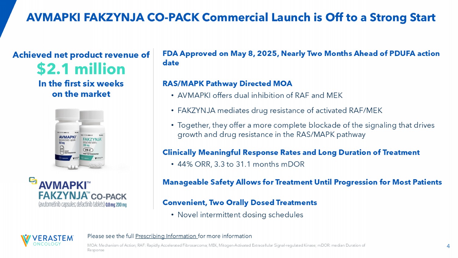 3 3 Commercial Product and Pipeline Positioned to Deliver Long - Term Shareholder Value • Strong early execution of commercial launch • May 2025 approval of AVMAPKI FAKZYNJA CO - PACK, six weeks ahead of PDUFA action date • First - ever FDA - approved treatment specifically f or KRAS - mutated recurrent low - grade serous ovarian cancer (LGSOC) with listing as Category 2A in NCCN Guidelines • Advancing our novel, early - stage pipeline in RAS/MAPK pathway - driven cancers • VS - 7375, an oral KRAS G12D (ON/OFF) inhibitor: initiated Phase 1/2a trial in patients with advanced KRAS G12D mutant solid tumors outside of China; encouraging initial safety and efficacy results from partner in China • Maximizing the synergistic potential of avutometinib plus defactinib combination in other advanced solid tumors • RAMP 205: front - line metastatic pancreatic cancer; DL1 achieved confirmed ORR of 83% (10/12) • RAMP 203: advanced KRAS G12C mutant non - small cell lung cancer; no DLTs were observed in the triplet combination cohort • Existing cash, investments, and anticipated future product sales give us a strong financial position and runway into the second half of 2026 PDUFA: Prescription Drug User Fee Act; KR AS: Kirsten Rat Sarcoma Virus; MAPK: Mitogen - activated P rotein K inases; FDA: Food and Drug Administration; NCCN: National Comprehensive Cancer Network; DL: dose - level: ORR: objective response rate: DLT: dose - limiting toxicity