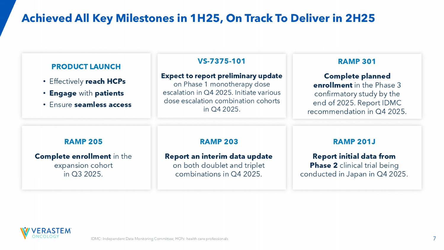 6 x Reported updated data from the ongoing RAMP 205 trial and s elected dose level 1 cohort for recommended phase 2 dose (RP2D) x Close to completing enrollment in the expansion cohort of 29 patients at the RP2D RAMP 205: Avutometinib + Defactinib + SOC Chemotherapy in 1L mPDAC x Completed enrollment to the KRAS G12C inhibitor, prior - treated stage 1 part B doublet cohort x Completed enrollment in the planned dose level evaluation cohorts for the triplet combination RAMP 203: Avutometinib + Sotorasib ± Defactinib in KRAS G12C in advanced NSCLC Delivering on the Key R&D Milestones Set for 2025 Maximize the synergistic potential of avutometinib + defactinib in other advanced solid tumors x U.S. IND filed and cleared x Dosed first patient in Phase 1/2a trial in U.S. x GenFleet reported updated Phase 1 clinical data from China x Granted FDA Fast Track Designation in 1L and 2L mPDAC VS - 7375, Oral KRAS G12D (ON/OFF) Inhibitor Advance novel, early - stage pipeline R&D: Research and Development. IND: Investigational New Drug