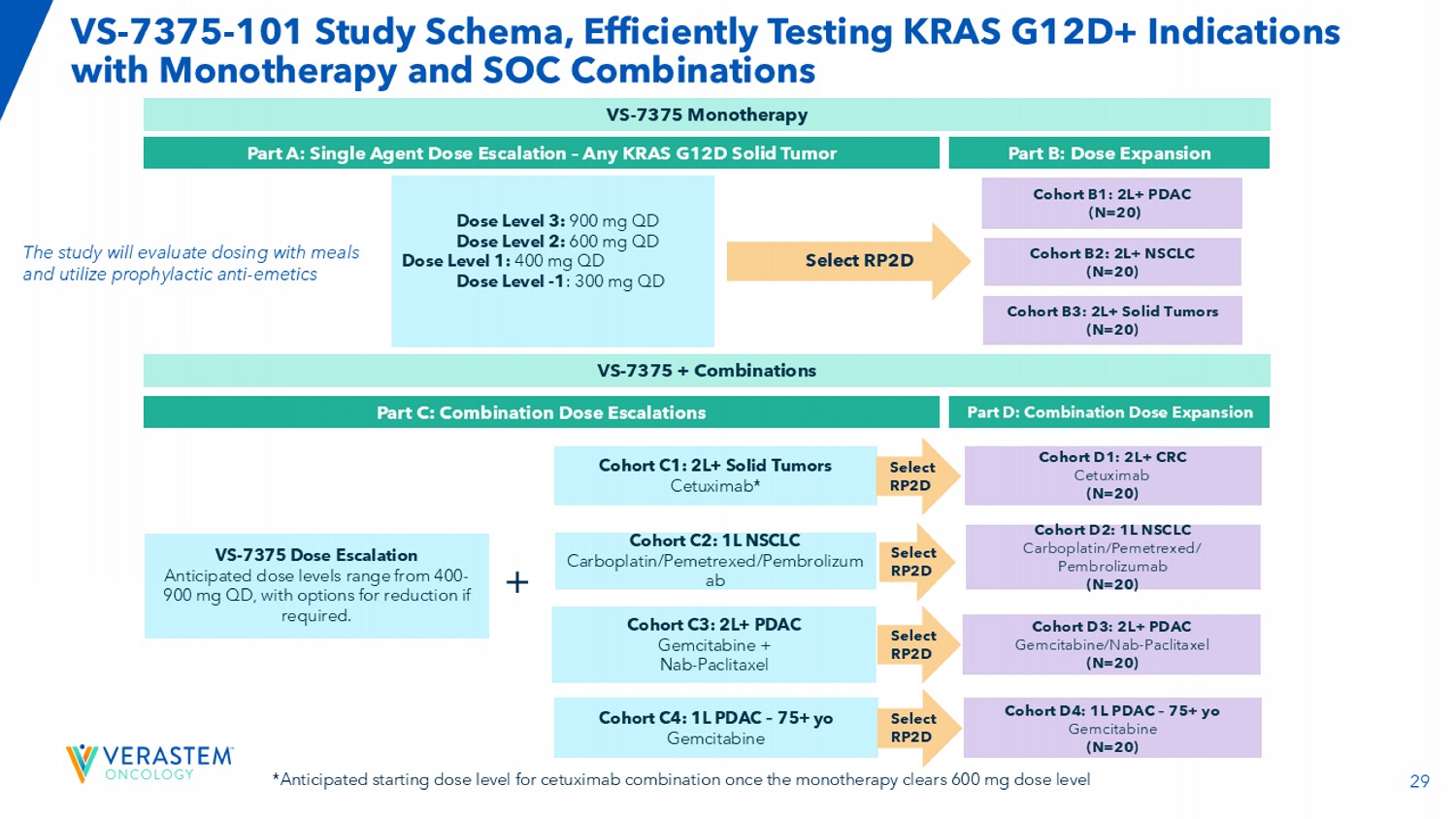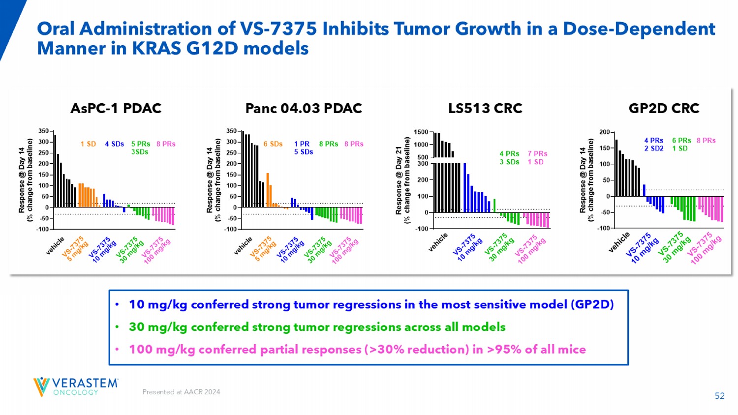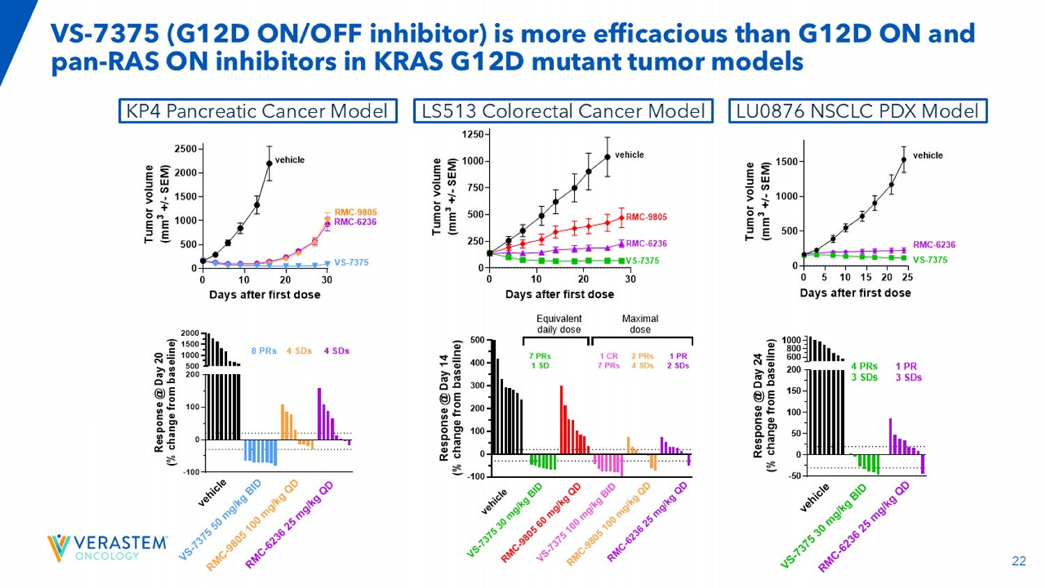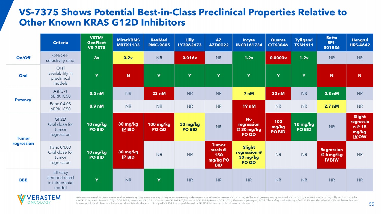 55 NR: not reported; IP: intraperitoneal admiration; QD; once per day; QW; once per week; References: GenFleet /Verastem AACR 2024; Hallin et al (Mirati) 2022; RevMed AACR 2023; RevMed AACR 2024; Lilly ENA 2023; Lilly AACR 2024; AstraZeneca (AZ) AACR 2024; Incyte AACR 2024; Quanta AACR 2023; Tyligand AACR 2024; Betta AACR 2024; Zhou et al ( Hengrui ) 2024. The safety and efficacy of VS - 7375 and the other G12D inhibitors has not been established. No conclusions on the clinical safety or efficacy of VS - 7375 or any of the other G12D inhibitors can be drawn at this time. VS - 7375 Shows Potential Best - in - Class Preclinical Properties Relative to Other Known KRAS G12D Inhibitors Hengrui HRS - 4642 Betta BPI - 501836 Tyligand TSN1611 Quanta QTX3046 Incyte INCB161734 AZ AZD0022 Lilly LY3962673 RevMed RMC - 9805 Mirati/BMS MRTX1133 VSTM/ GenFleet VS - 7375 Criteria NR NR 1.2x 0.0003x 1.2x NR 0.016x NR 0.2x 3x ON/OFF selectivity ratio On/Off N N Y Y Y Y Y Y N Y Oral availability in preclinical models Oral NR 0.8 nM NR 30 nM 7 nM NR NR 23 nM NR 0.5 nM AsPC - 1 pERK IC50 Potency NR 2.7 nM NR NR 19 nM NR NR NR NR 0.9 nM Panc 04.03 pERK IC50 Slight regressio n @ 15 mg/kg IV QW NR 10 mg/kg PO BID 100 mg/kg PO BID No regression @ 30 mg/kg PO QD NR 30 mg/kg PO BID 100 mg/kg PO QD 30 mg/kg IP BID 10 mg/kg PO BID GP2D Oral dose for tumor regression Tumor regression NR Regression @ 6 mg/kg IV BIW NR NR Slight regression @ 30 mg/kg PO QD Tumor stasis @ 150 mg/kg PO BID NR NR 30 mg/kg IP BID 10 mg/kg PO BID Panc 04.03 Oral dose for tumor regression NR NR NR NR NR NR NR Y NR Y Efficacy demonstrated in intracranial model BBB
