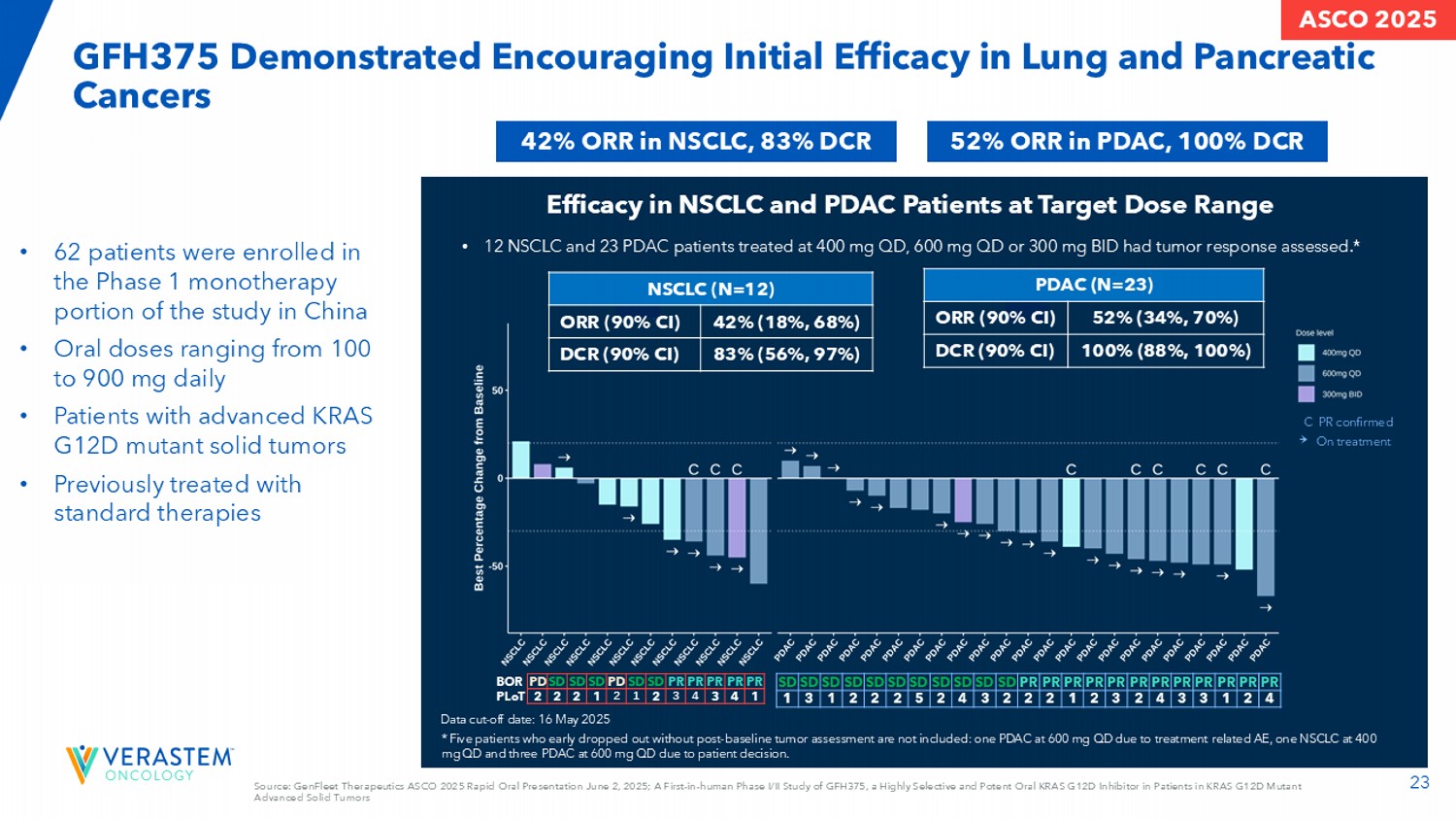 22 VS - 7375 (G12D ON/OFF inhibitor) is more efficacious than G12D ON and pan - RAS ON inhibitors in KRAS G12D mutant tumor models KP4 Pancreatic Cancer Model LU0876 NSCLC PDX Model -100 0 100 200 500 1000 1500 2000 R e s p o n s e @ D a y 2 0 ( % c h a n g e f r o m b a s e l i n e ) v e h i c l e R M C - 9 8 0 5 1 0 0 m g / k g Q D V S - 7 3 7 5 5 0 m g / k g B I D 4 SDs R M C - 6 2 3 6 2 5 m g / k g Q D 8 PRs 4 SDs 0 10 20 30 0 500 1000 1500 2000 2500 Days after first dose T u m o r v o l u m e ( m m 3 + / - S E M ) Vehicle VS-7375 50 mg/kg BID RMC-9805 100 mg/kg QD RMC-6236 25 mg/kg QD vehicle RMC-9805 RMC-6236 VS-7375 -100 0 100 200 300 400 500 R e s p o n s e @ D a y 1 4 ( % c h a n g e f r o m b a s e l i n e ) v e h i c l e R M C - 9 8 0 5 1 0 0 m g / k g Q D V S - 7 3 7 5 3 0 m g / k g B I D 7 PRs 1 SD R M C - 6 2 3 6 2 5 m g / k g Q D 1 PR 2 SDs 2 PRs 4 SDs R M C - 9 8 0 5 6 0 m g / k g Q D V S - 7 3 7 5 1 0 0 m g / k g B I D 1 CR 7 PRs Equivalent daily dose Maximal dose 0 10 20 30 0 250 500 750 1000 1250 Days after first dose T u m o r v o l u m e ( m m 3 + / - S E M ) vehicle RMC-9805 RMC-6236 VS-7375 Vehicle VS-7375 30 mg/kg BID po RMC-9805 60 mg/kg QD po RMC-6236 25 mg/kg QD po LS513 Colorectal Cancer Model