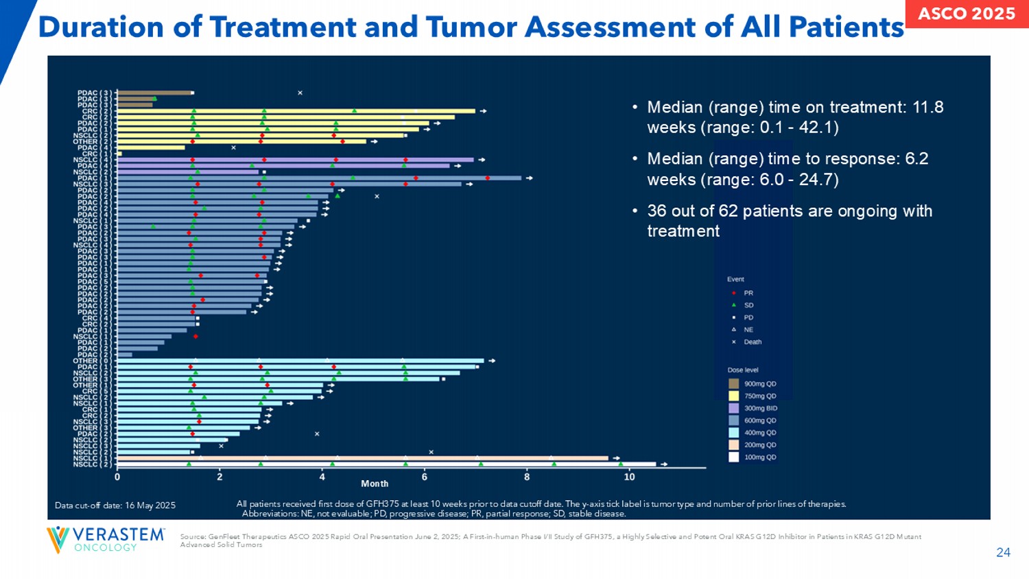 23 GFH375 Demonstrated Encouraging Initial Efficacy in Lung and Pancreatic Cancers Source: GenFleet Therapeutics ASCO 2025 Rapid Oral Presentation June 2, 2025; A First - in - human Phase I/II Study of GFH375, a Highly Selective an d Potent Oral KRAS G12D Inhibitor in Patients in KRAS G12D Mutant Advanced Solid Tumors 52% ORR in PDAC, 100% DCR 42% ORR in NSCLC, 83% DCR • 62 patients were enrolled in the Phase 1 monotherapy portion of the study in China • Oral doses ranging from 100 to 900 mg daily • Patients with advanced KRAS G12D mutant solid tumors • Previously treated with standard therapies C PR confirmed On treatment NSCLC (N=12) 42% (18%, 68%) ORR (90% CI) 83% (56%, 97%) DCR (90% CI) PDAC (N=23) 52% (34%, 70%) ORR (90% CI) 100% (88%, 100%) DCR (90% CI) PR PR PR PR PR SD SD PD SD SD SD PD BOR 1 4 3 4 3 2 1 2 1 2 2 2 PLoT PR PR PR PR PR PR PR PR PR PR PR PR SD SD SD SD SD SD SD SD SD SD SD 4 2 1 3 3 4 2 3 2 1 2 2 2 3 4 2 5 2 2 2 1 3 1 Data cut - off date: 16 May 2025 * Five patients who early dropped out without post - baseline tumor assessment are not included: one PDAC at 600 mg QD due to treatment related AE, one NSCLC at 400 mg QD and three PDAC at 600 mg QD due to patient decision. Efficacy in NSCLC and PDAC Patients at Target Dose Range • 12 NSCLC and 23 PDAC patients treated at 400 mg QD, 600 mg QD or 300 mg BID had tumor response assessed.* ASCO 2025
